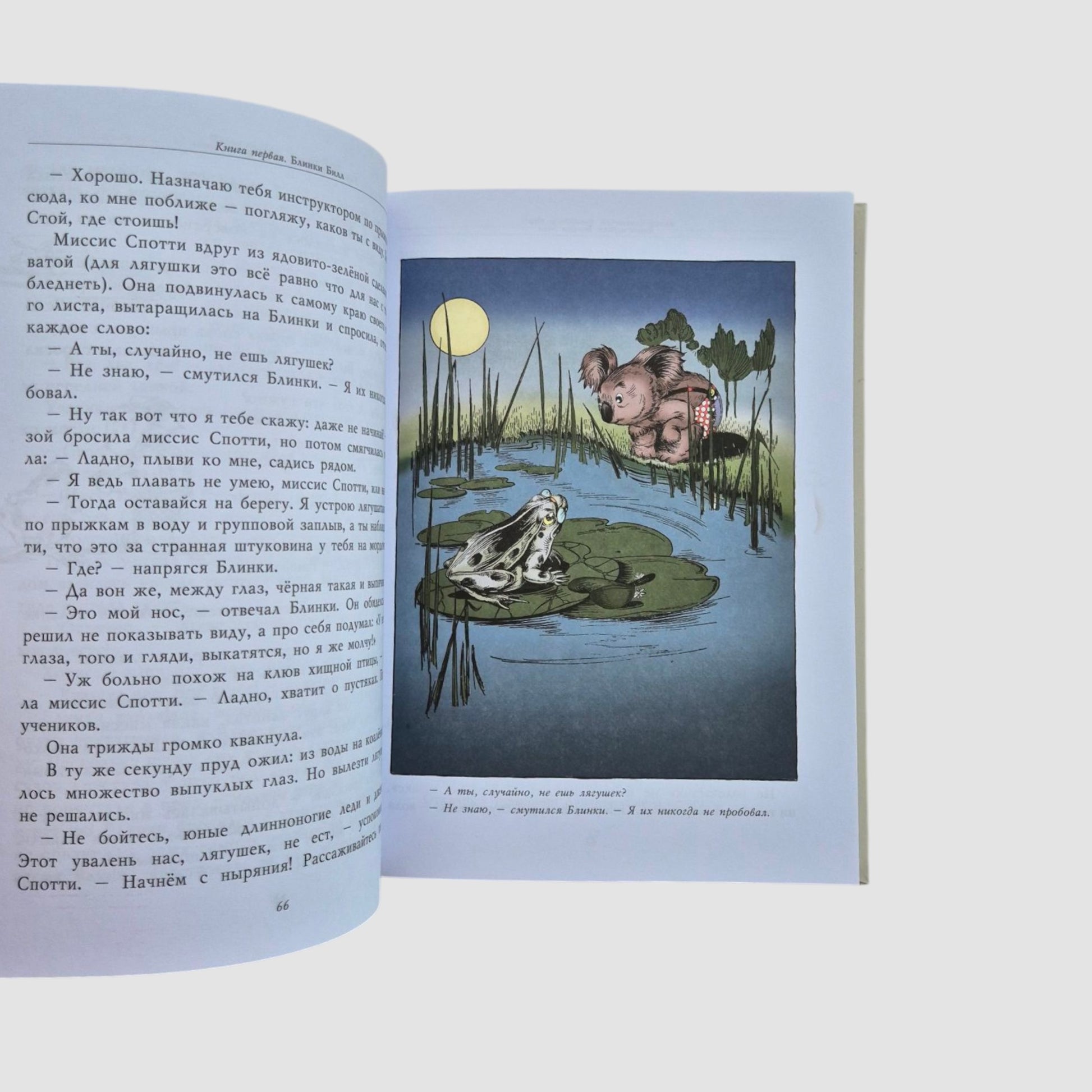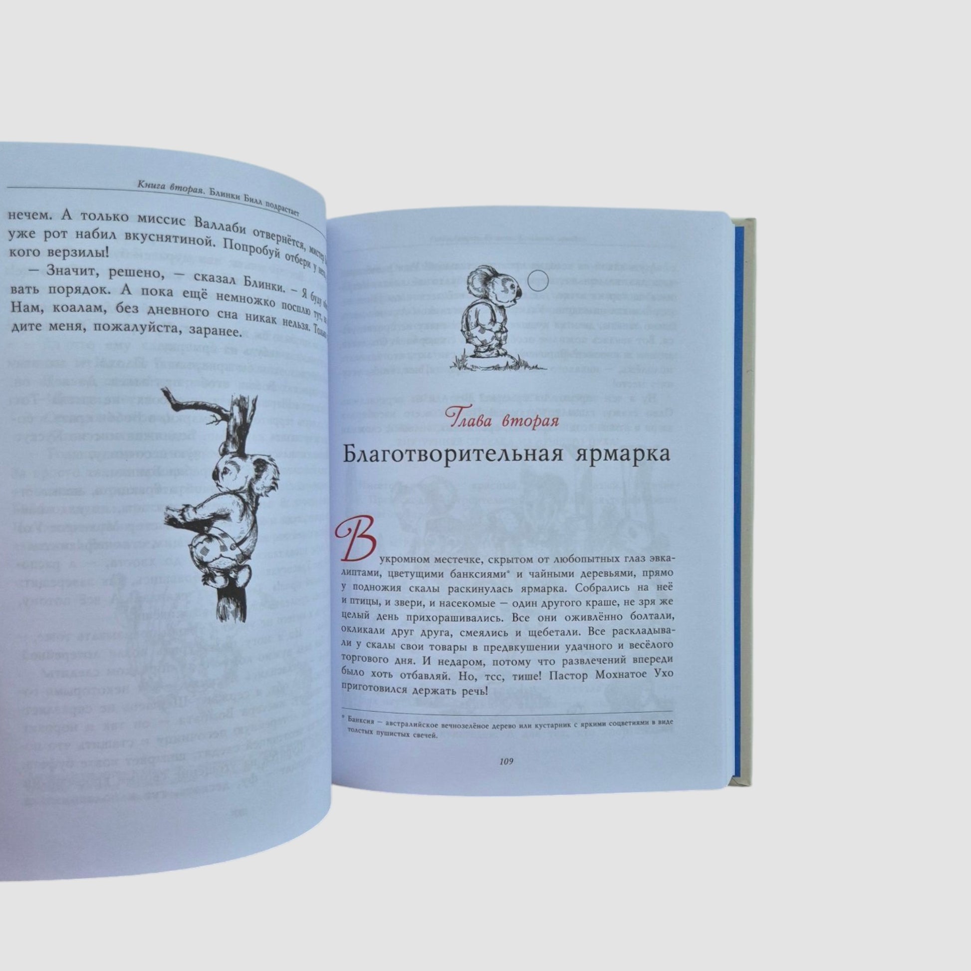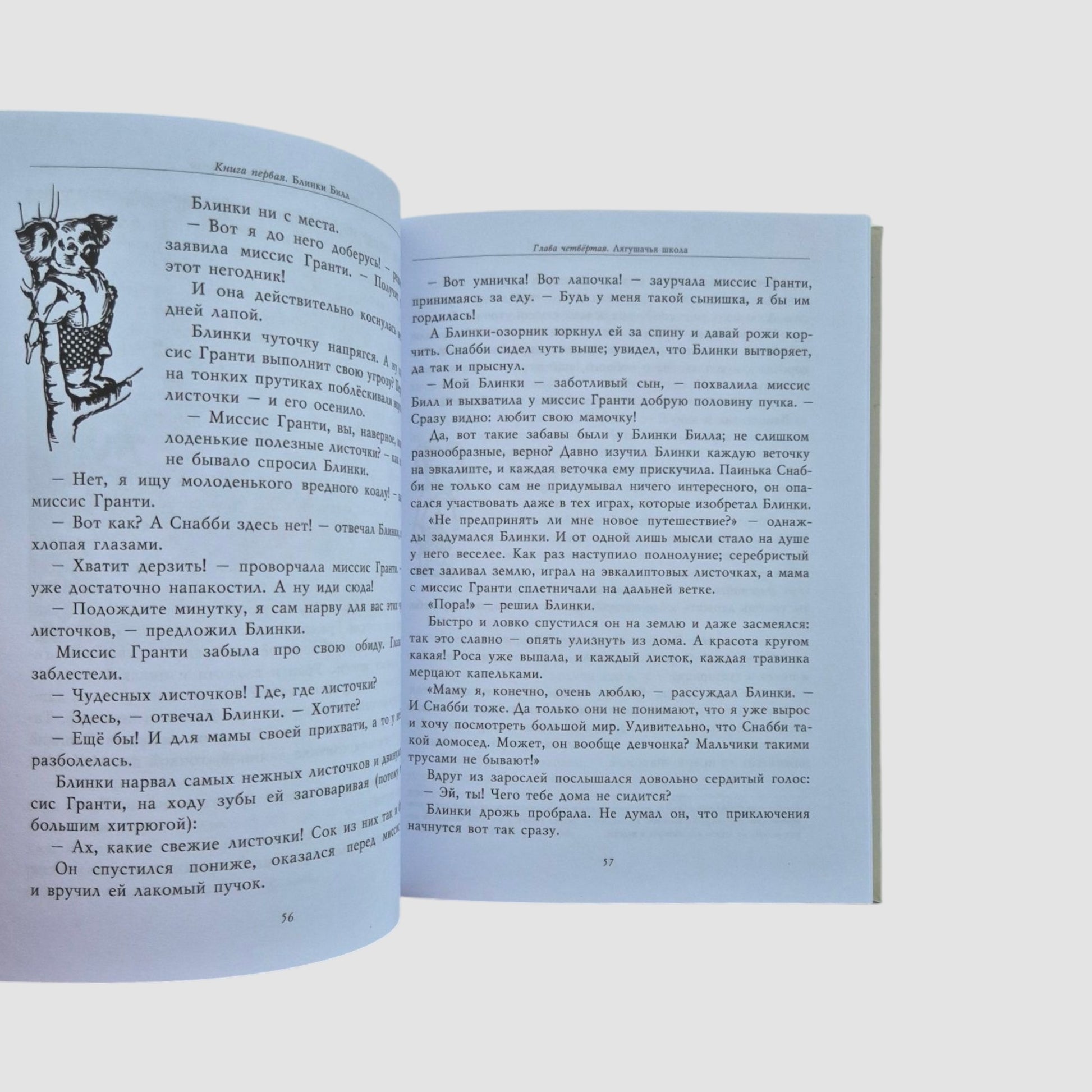 The first book, Blinky Bill, begins with the news that has spread throughout the bush: a long-awaited baby has been born into a respectable family of koalas named Bill. He blinked his eyes so funny – blink-blink – and looked so surprised that his parents decided to name him Blinky. They chose the sweet Angelina Wallaby as his godmother – she will often help Blinky out of trouble, which he regularly gets into because of his irrepressible curiosity. Most koalas are homebodies; to be happy, they need a silver eucalyptus with a convenient forked branch and tender, juicy leaves in abundance. But the inquisitive Blinky can’t sit still, every now and then he comes down from his native tree and goes off to look for adventure – to the horror of his mother, the good-natured Mrs. Bill, the displeasure of his grumpy neighbor Auntie Granty, and the envy of the quiet Snubby, her son. During his travels, Blinky makes friends, learns to see the beauty of nature and comprehend its laws. Gradually, he understands why in the animal world someone eats someone else. But how to explain the reason for cruelty on the part of people? Neither Blinky, nor his mother, nor their friends and neighbors in the bush know.