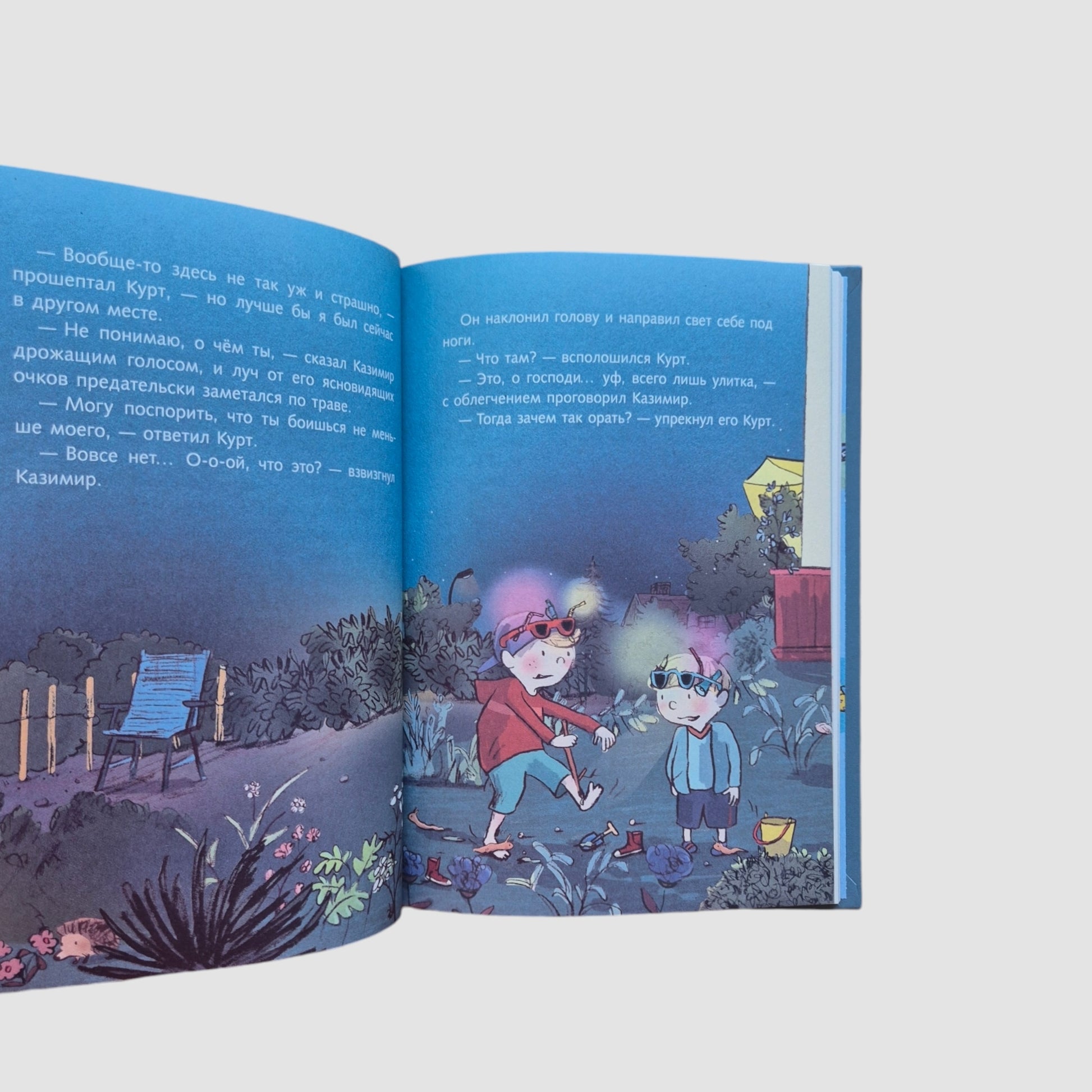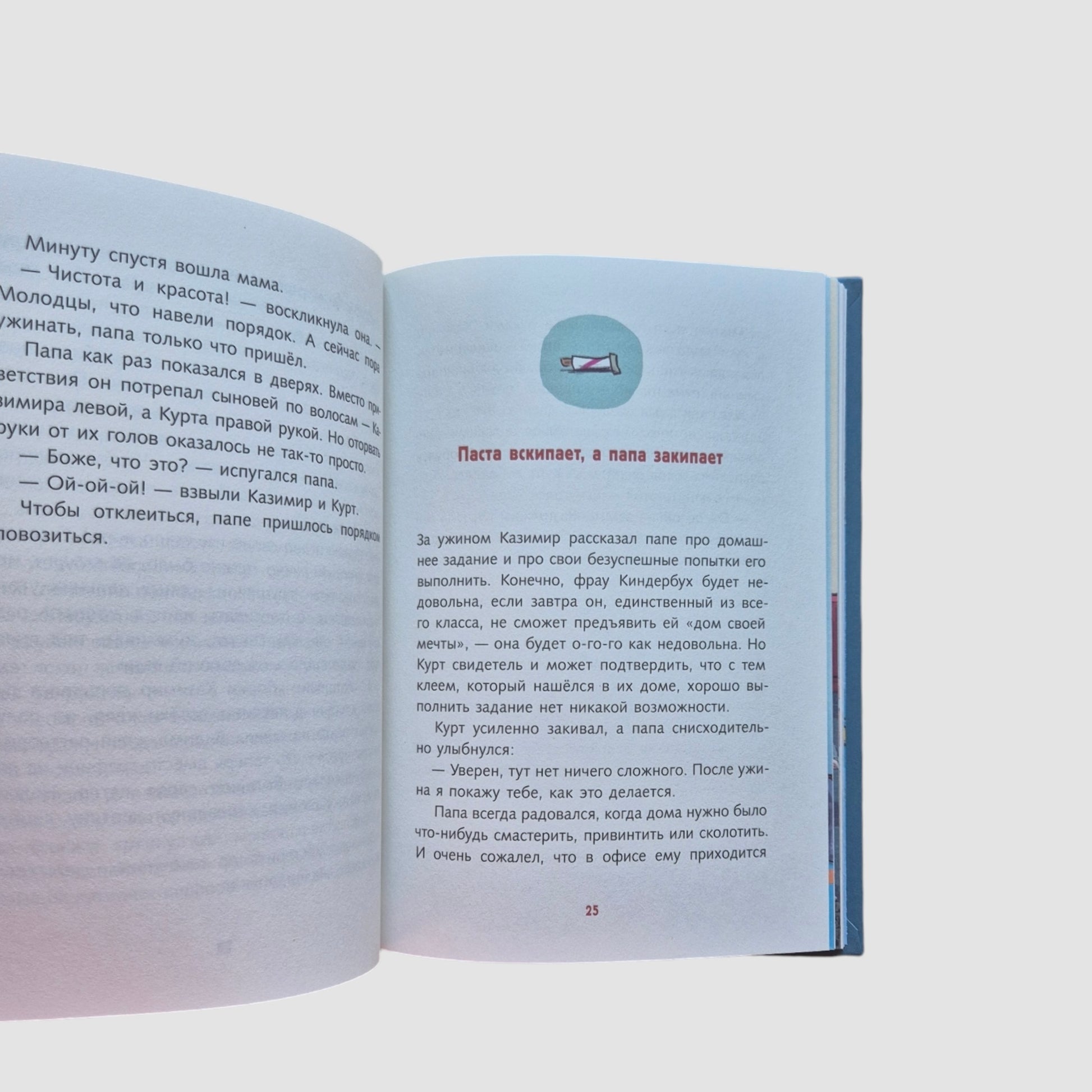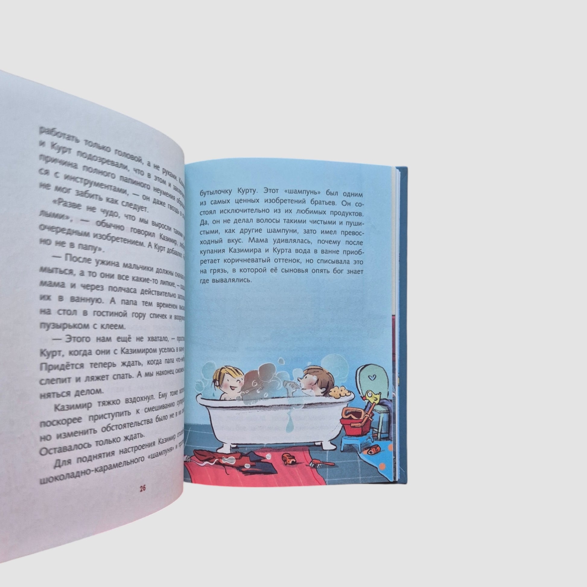 Kazimir and his younger brother Kurt love to invent various useful and useful things. They have already come up with a super-fast pedalless bicycle, a bathtub for bathing without water, and a device called a "third hand." And with the help of their latest development, super-duper glue, made from caramels, chewing gum, and snail slime, they even managed to catch a robber.