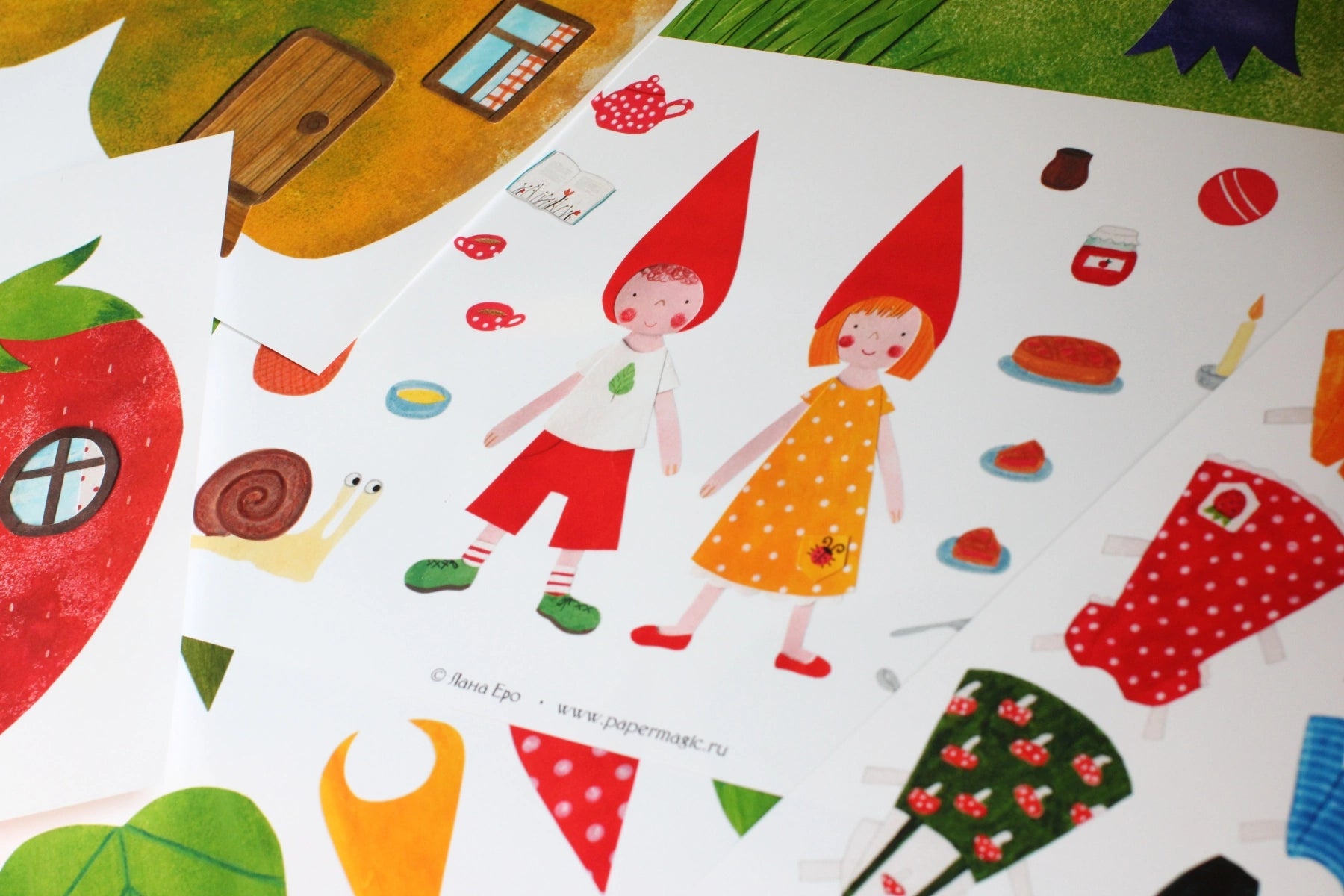 First of all, you need to cut out the characters, their clothes and other things. The houses also need to be cut out, their front and back halves glued together, and then folded in half.