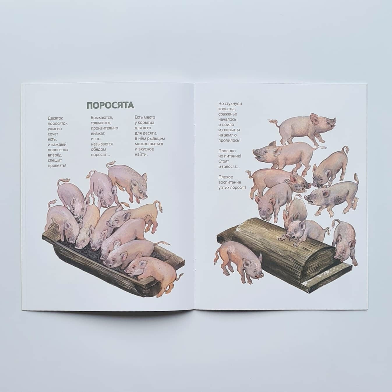 Here they are - geese, piglets, a rabbit, a calf, a cat... From this book, the little reader will learn who of them is pugnacious, who is arrogant, who is ill-mannered, and who is a true friend. The characters of domestic animals were described in verse by Vladimir Lifshitz, and depicted in living pictures by the classic illustration artist Evgeny Charushin.