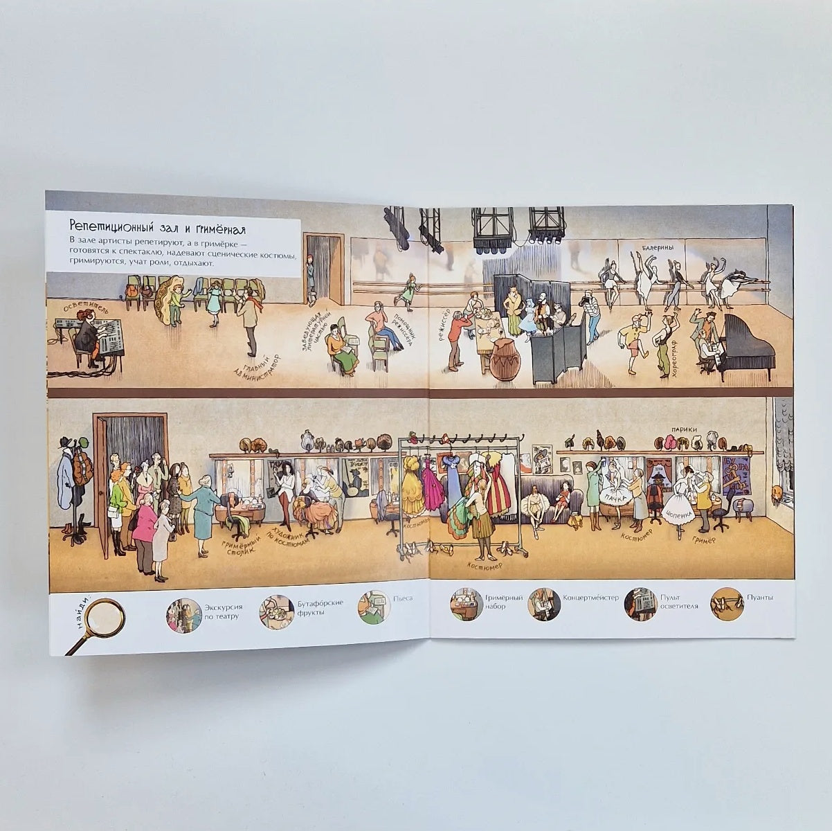 "In the Theatre" is an educational "find" and developmental Wimmelbook. Wimmelbooks are picture books that have no text at all, but a lot of small details to look at, and at the same time many plot lines.