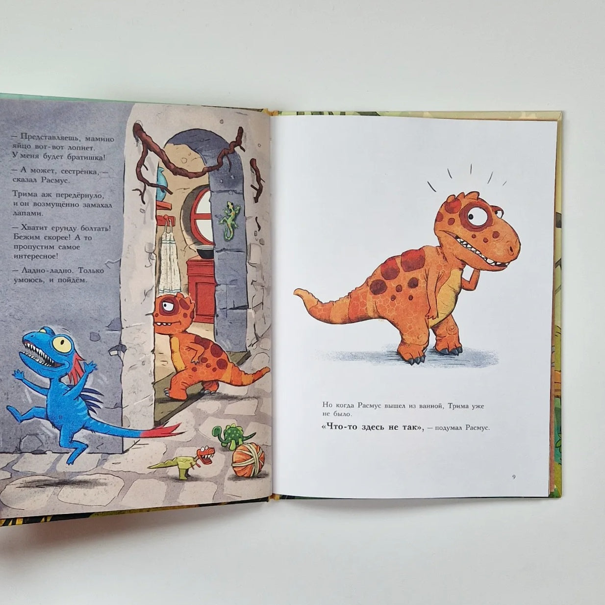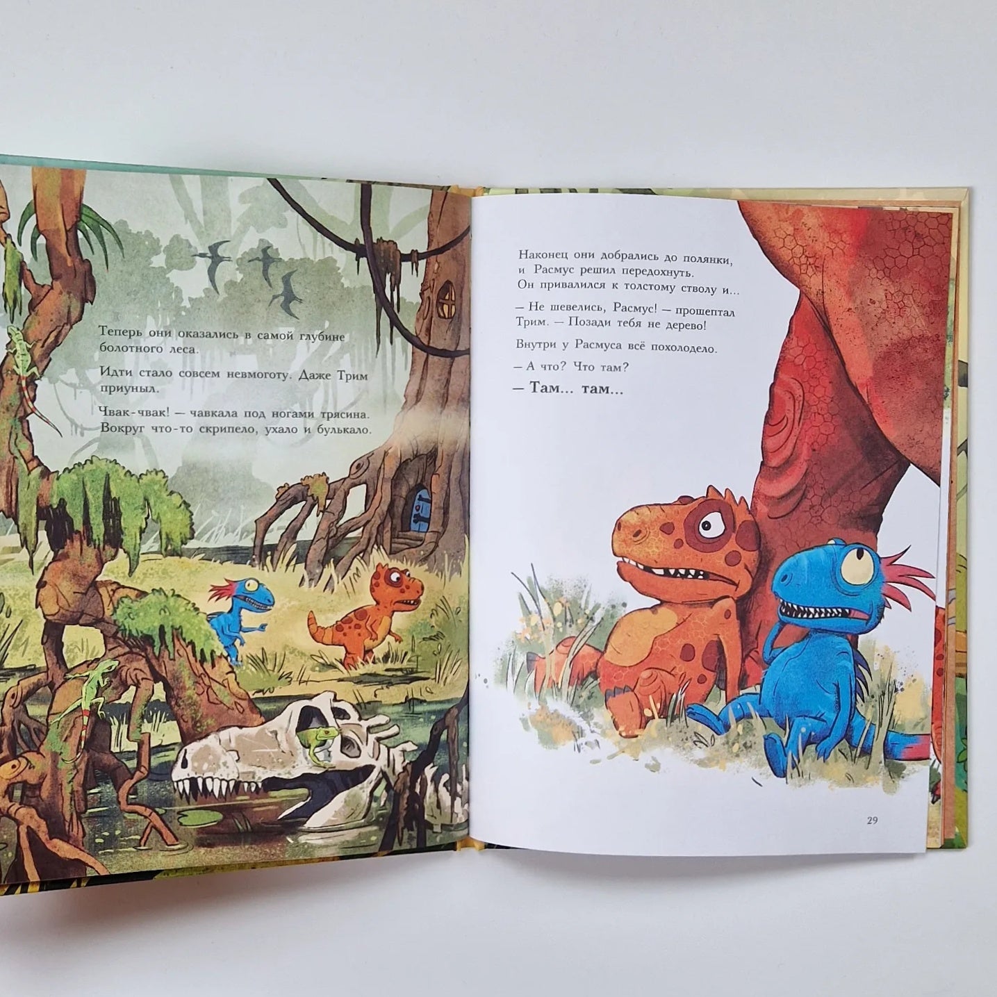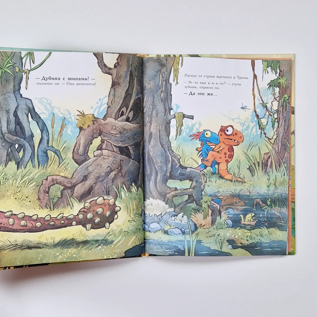 Each book in the Dinosaur Friends series tells the story of a day in the life of the tyrannosaurus Rasmus Rex and his best friend Trim Troodon. In the first book, the friends are walking through a dense and dangerous swamp forest so as not to miss a joyful event: Trim's mother is about to hatch an egg. Their parents strictly forbid them to go through the forest, especially since some huge monster has recently appeared there. The cowardly and obedient Rasmus suggests going around, but the fearless adventurer Trim drags him along a shortcut through the swamp. Danger lurks at every step of the friends, and Rasmus's soul is constantly sinking into his heels from fear. However, each time the alarm turns out to be false: in the forest they run into their friends, each of whom is busy with some very important matter. And then they meet Rasmus's strict mother - now they will get into trouble for breaking the ban! However, mother Rex, having learned that Trim is about to have a little brother, softens and accompanies them to Trim's cave. And there a surprise awaits them all. What hatches from the egg is not Trim's little brother or even sister, but a completely different baby...