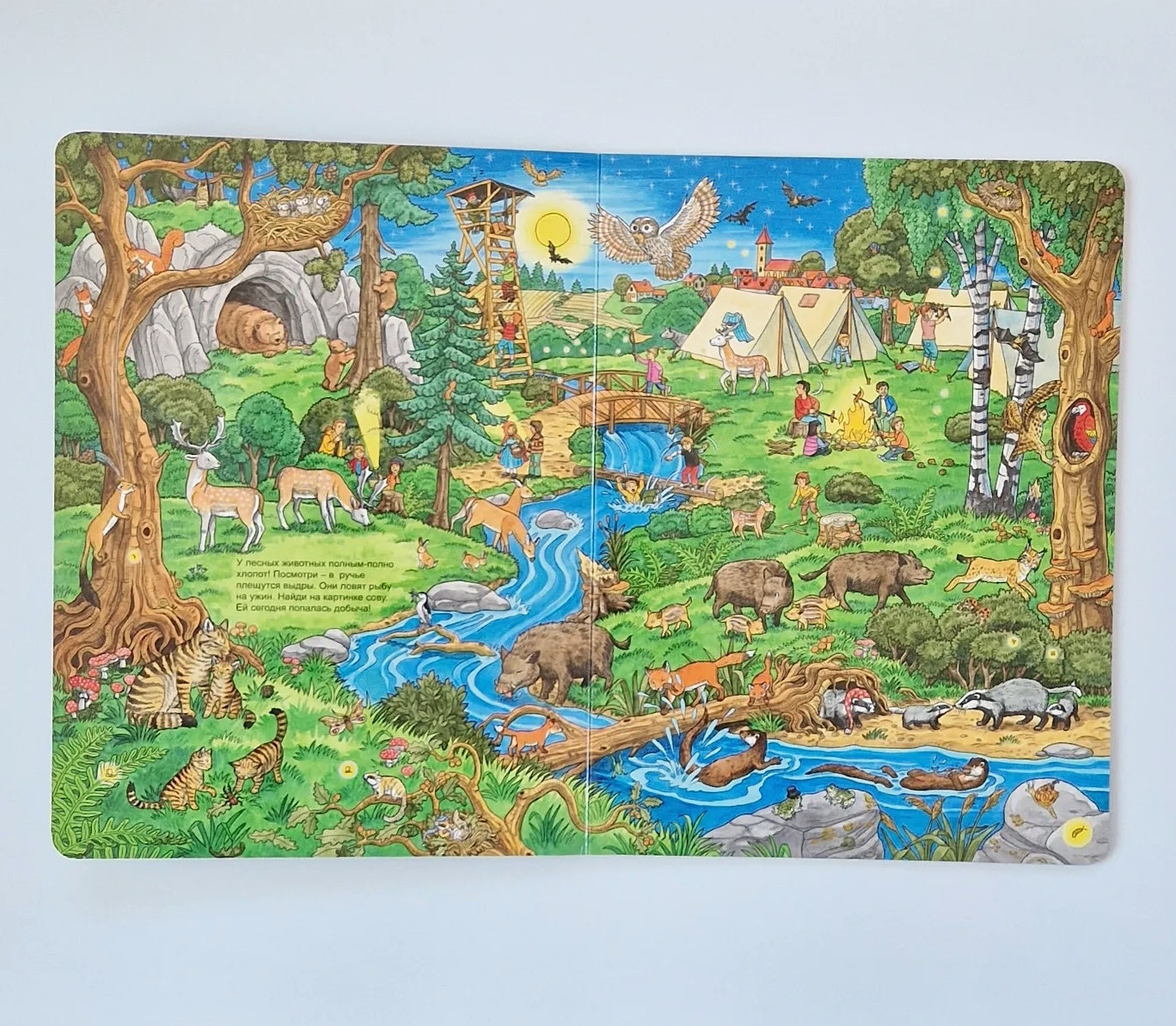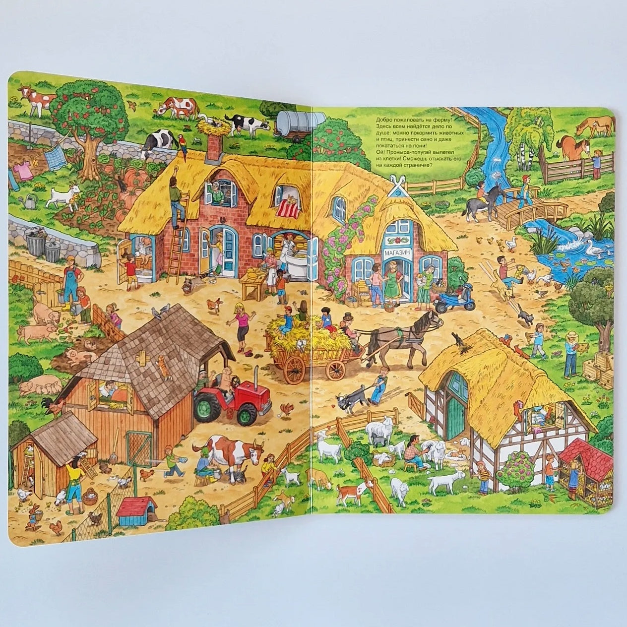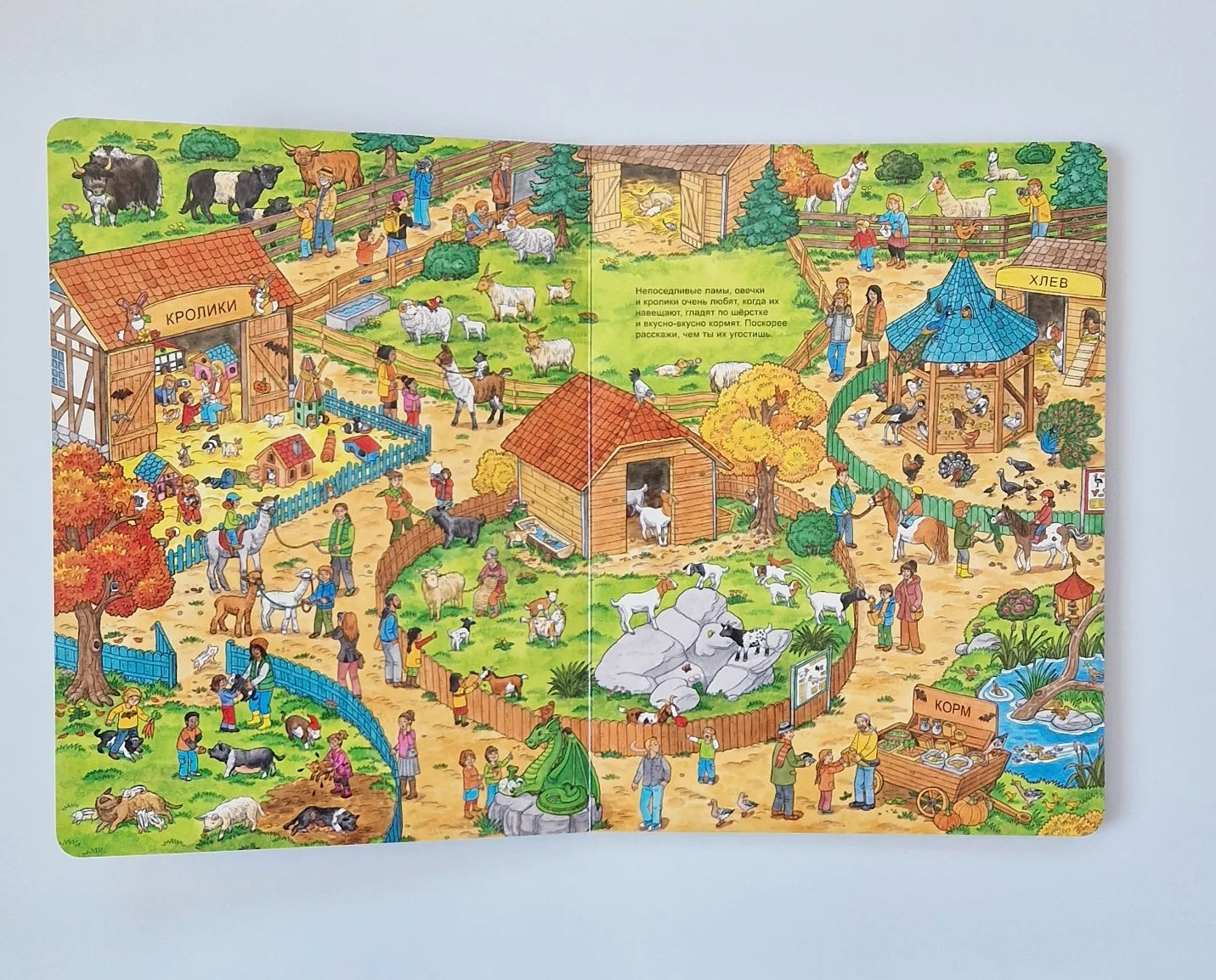 This Wimmelbuch tells about the life of the most diverse inhabitants of our planet in the wild and next to humans. Lions and deer, eagles and whales, giraffes and beavers, walruses and sheep and several dozen more animals and birds, which with great interest can be solved again and again on the bright pages.