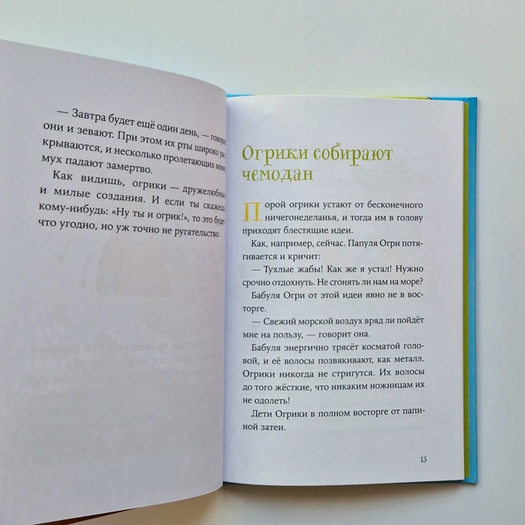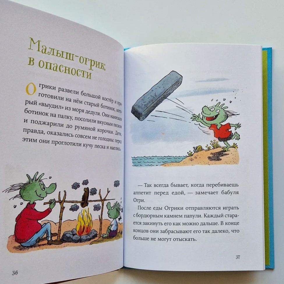 Ogriks are green creatures that live in a dump. They are not like people: instead of ears they have horns, instead of toys they have tin cans, instead of a car they have a flying dragon Firepaw. And the Ogriks are constantly getting into different adventures. In this book, the whole Ogri family goes to the sea.