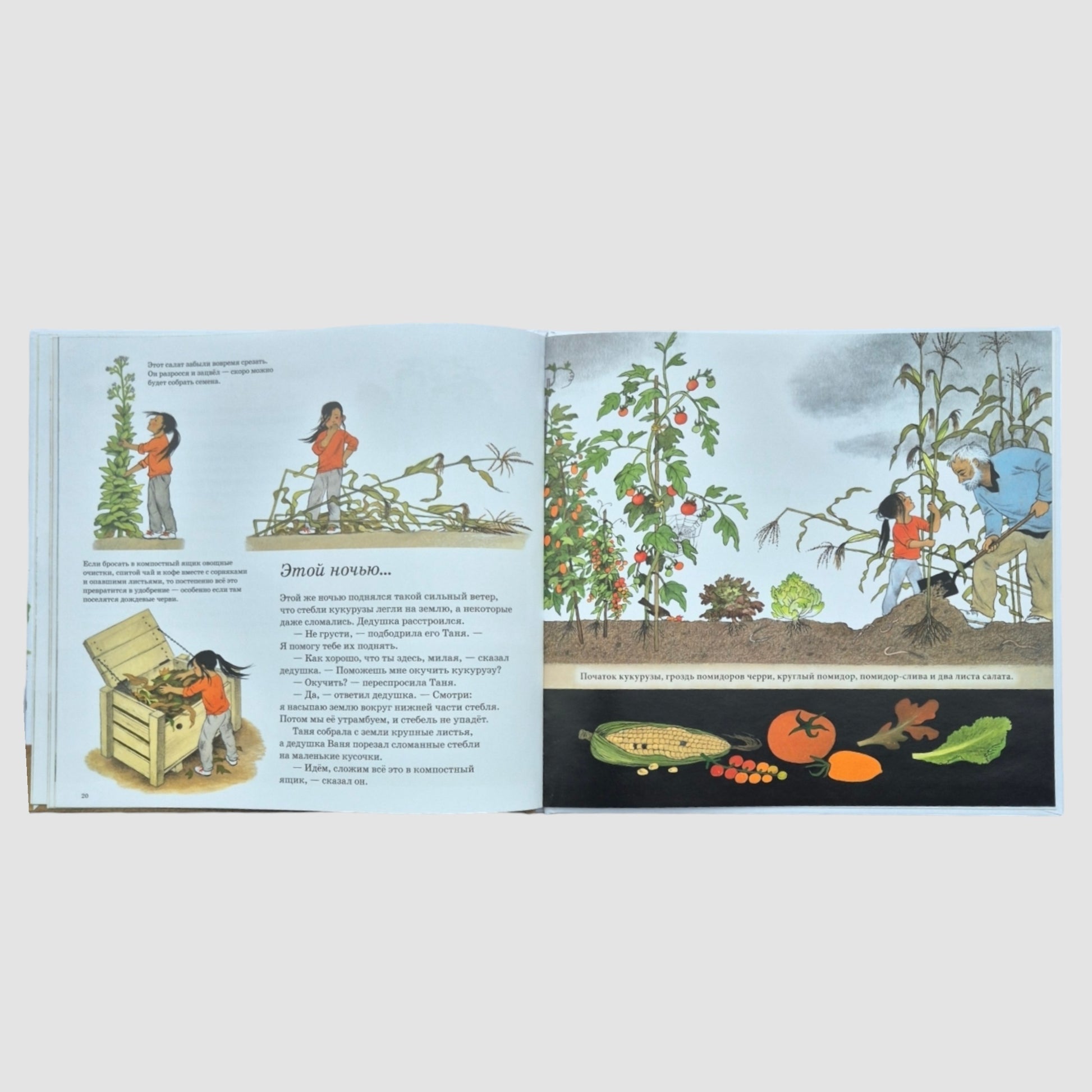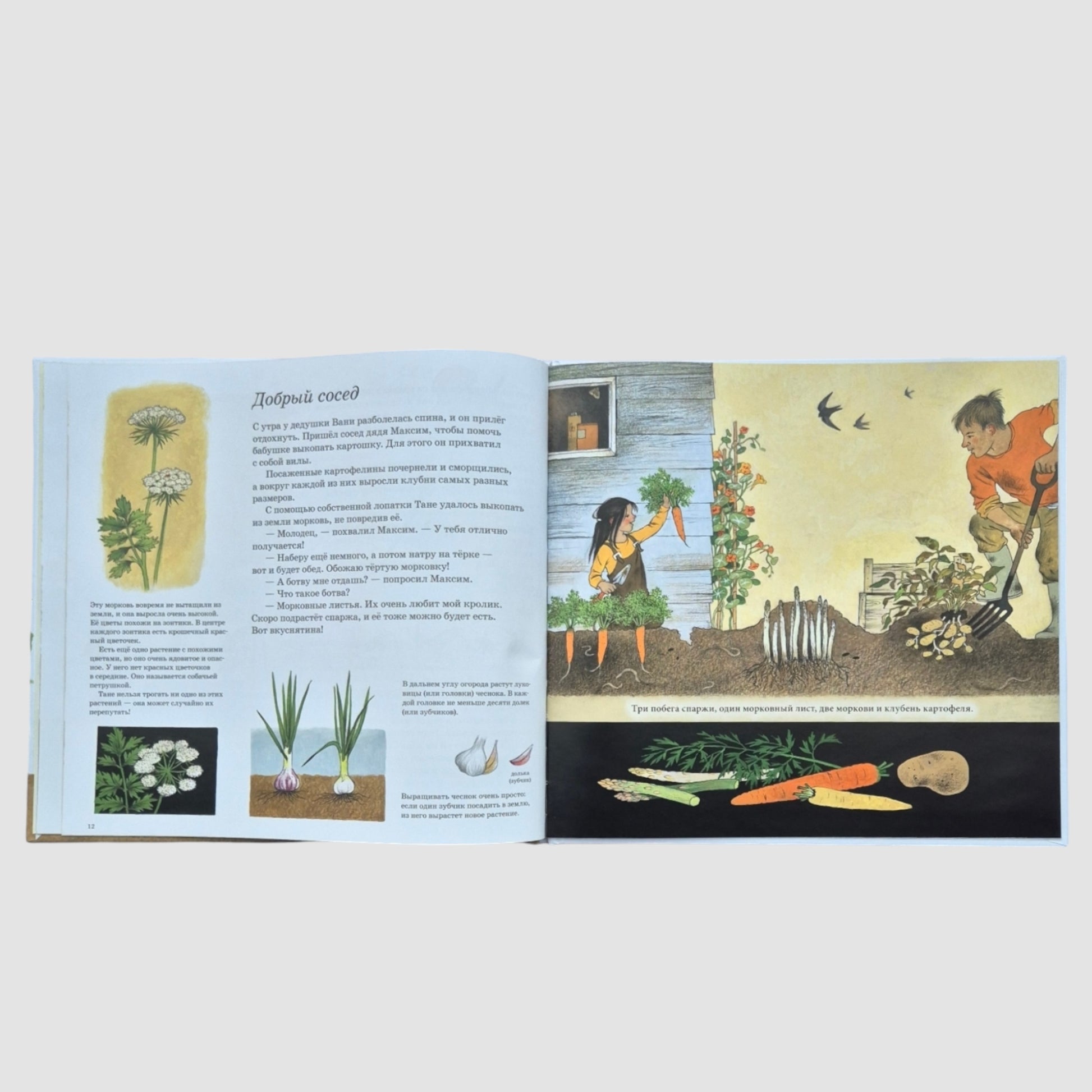 A vegetable garden is a magical place where children who grew up in the city can observe the life and growth of plants. The girl Tanya, the heroine of this story, went on vacation to the village to her grandparents, who teach her how to plant and grow vegetables, handle garden tools and harvest. Tanya learns a lot of interesting things about those plants whose fruits she had previously seen only on store shelves: how green peas are born and grow, what role insects and birds play in the life of plants, how to make a delicious salad and how to grow crispy radishes and juicy greens in your own apartment, setting up a small vegetable garden on the balcony or windowsill.