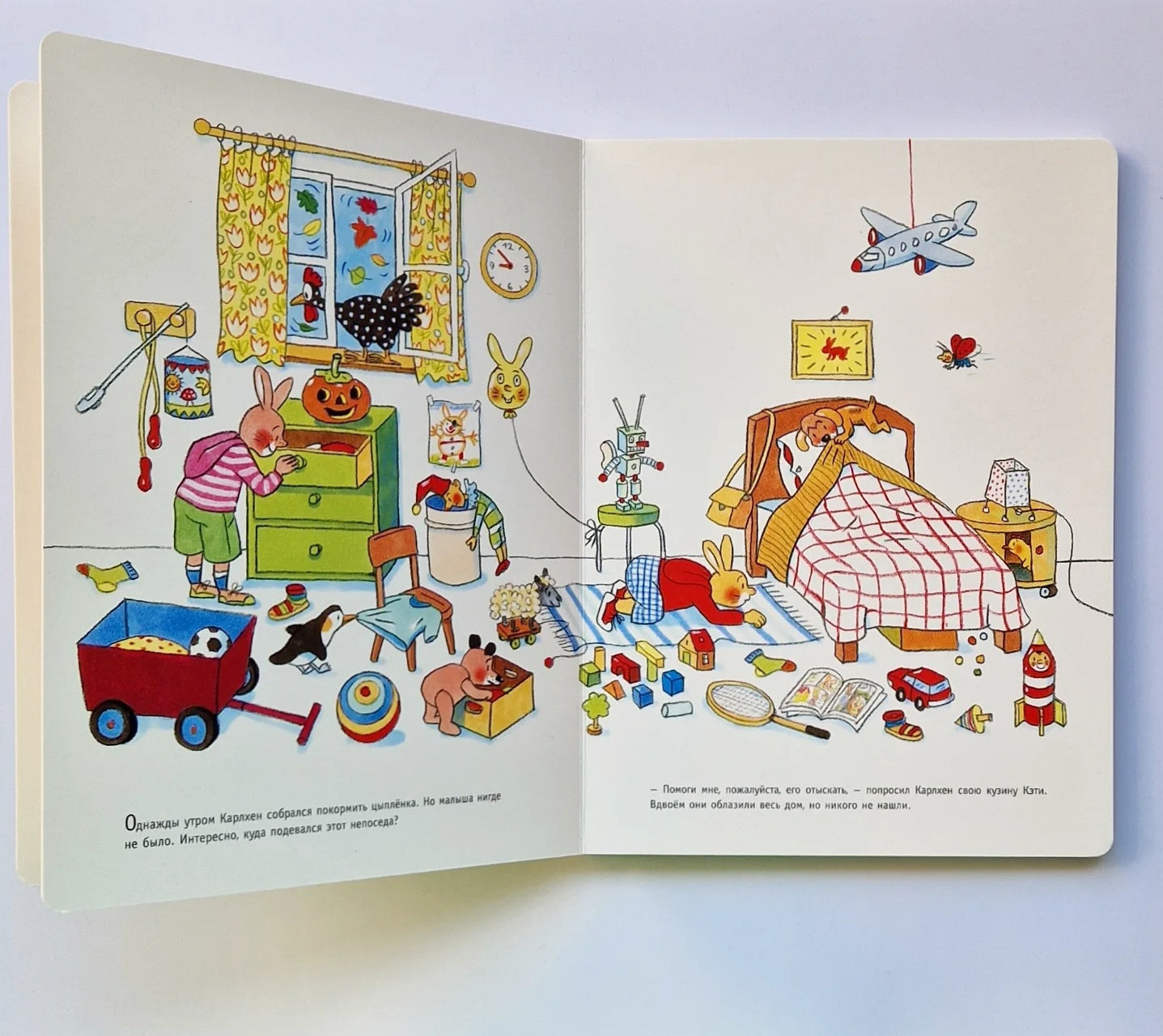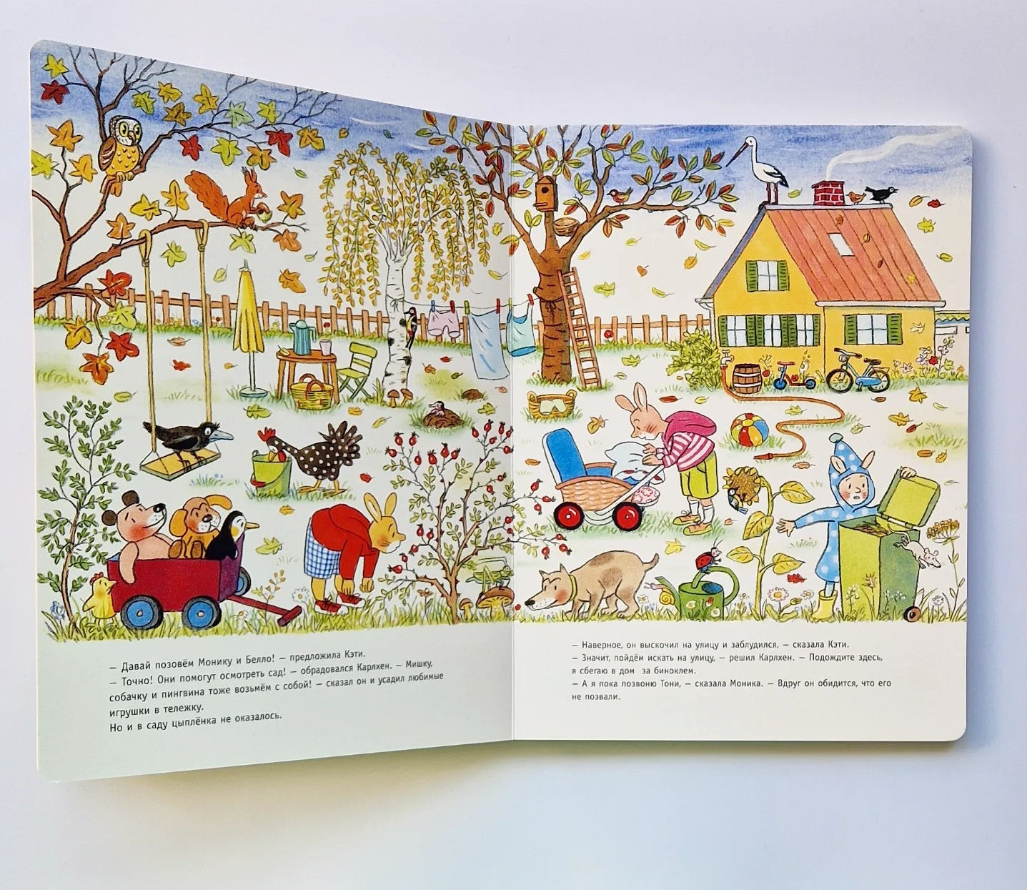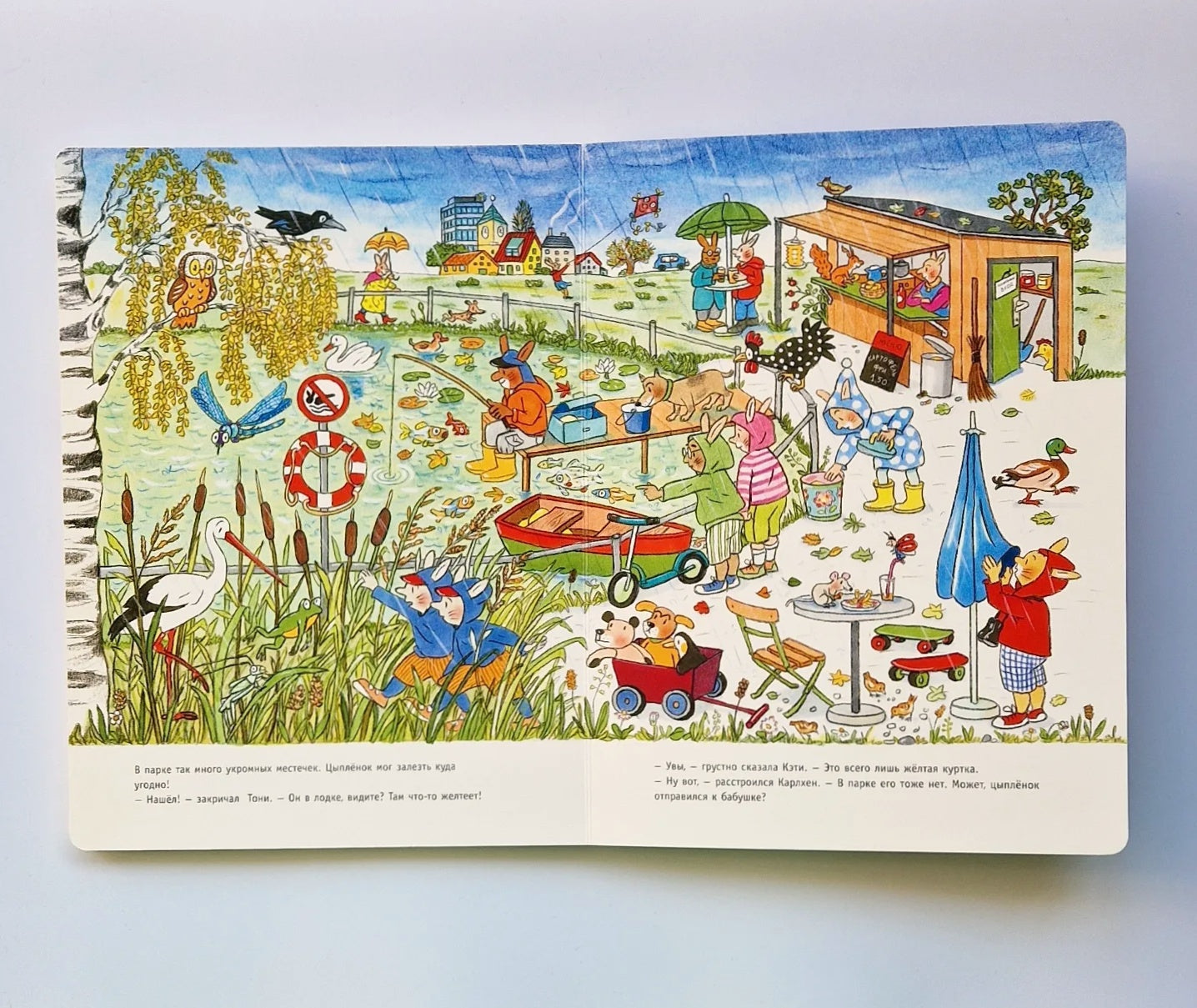 After reading this almost detective story, young readers are offered to complete tasks: find a ladybug, dragonfly, raven, owl, squirrel, duck, grasshopper, snail, mouse, stork and frog on each spread. Some of them appear on the very first page, while others appear a little later. And also on each spread you need to find a chicken. Yes, Karlchen and his friends simply did not notice the little rascal who decided to play hide-and-seek with them, but attentive readers will definitely find him.