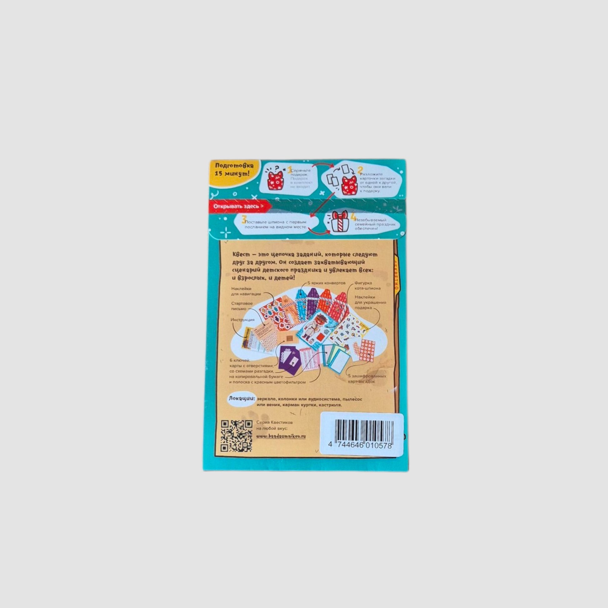 The set includes: 5 encrypted riddle cards, 6 keys: cards with holes, with solution schemes, on carbon paper and a strip with a red color filter, 5 envelopes, 5 adhesive tags, a starting letter, a spy cat figurine that starts the quest, 2 sets of stickers: for decorating the gift and arrows for navigation, instructions.
