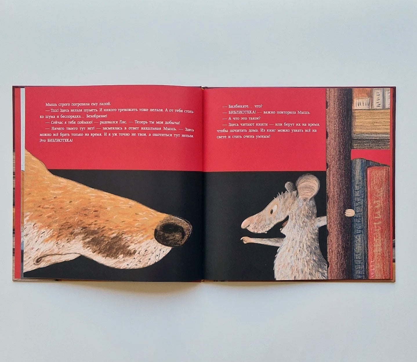 One day, the mischievous Fox chased the Mouse, and she led him... to the library. What is a library? Why is it so quiet here and you can't make any noise? And there are so many interesting books! You can even borrow them for a while! But then it turned out that the Fox... can't read at all. What will the cunning Fox come up with then?