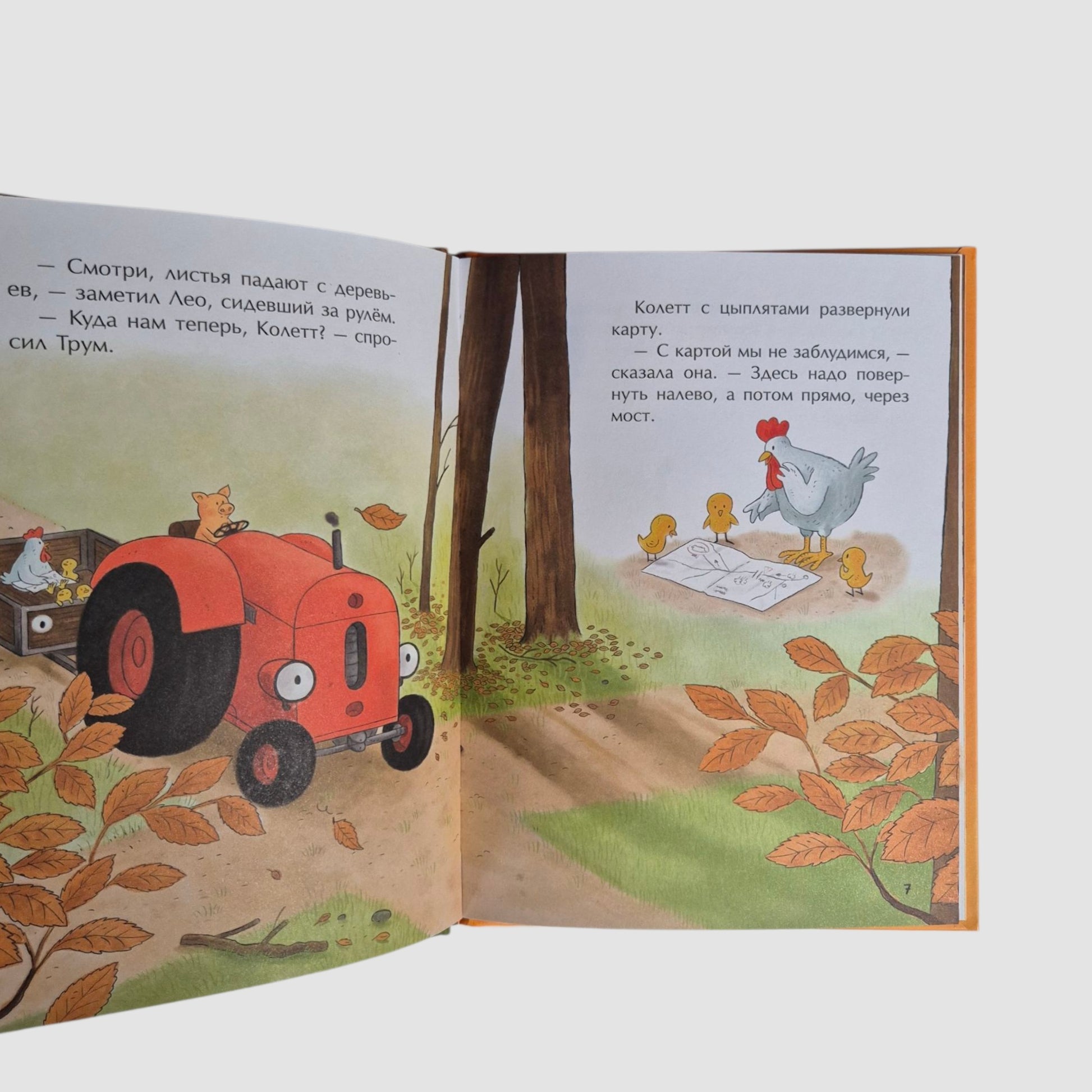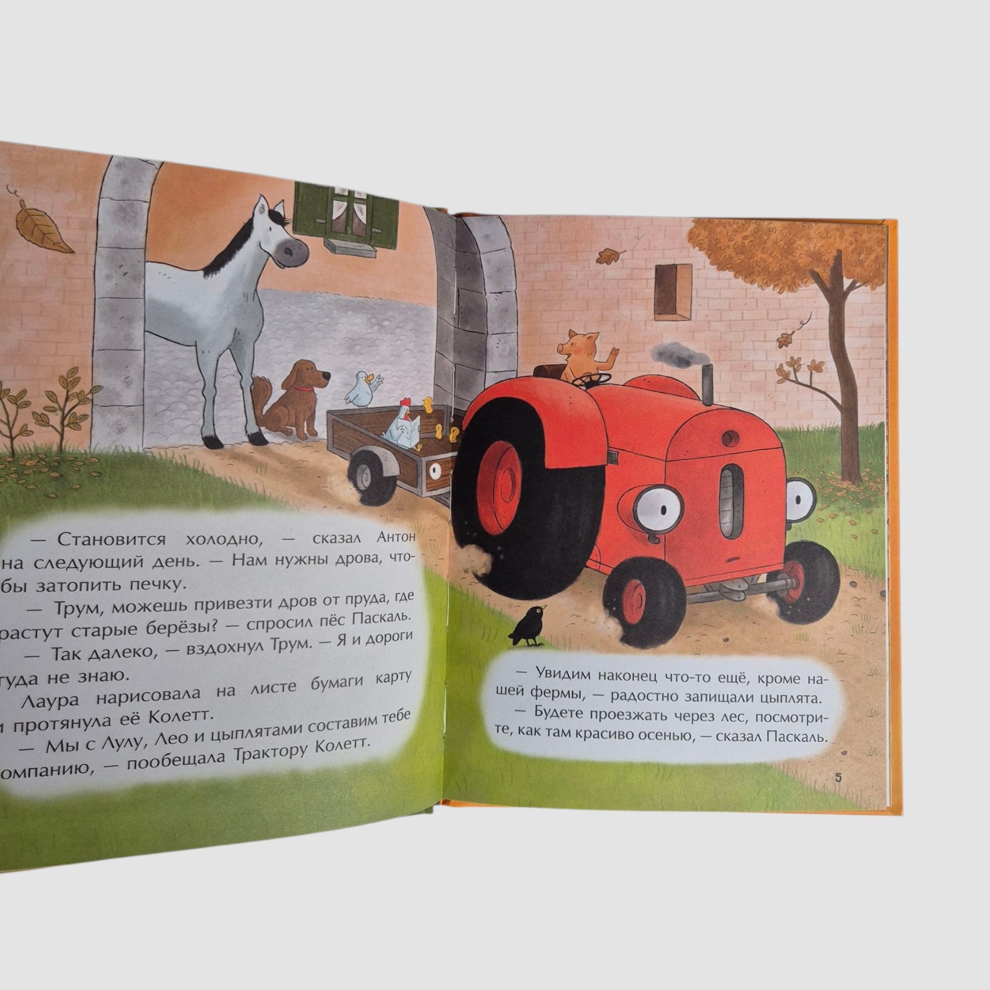 В этой тёплой и доброй истории маленький Трактор Трум впервые отправляется в большое осеннее путешествие за пределы родной фермы. Вместе с друзьями он преодолевает трудности, заводит дружбу с жителями леса, учится не бояться нового — и вдруг замечает, что осень, которую он раньше не любил, на самом деле полна красоты и удивительных открытий.