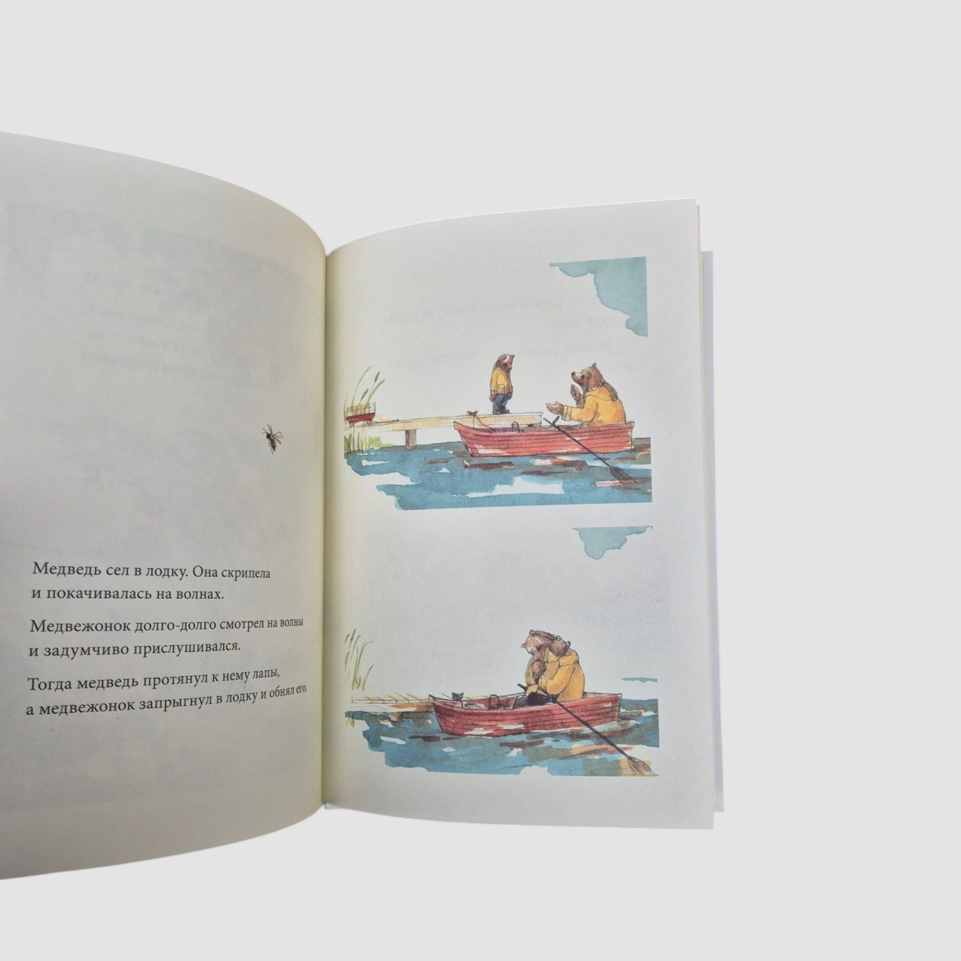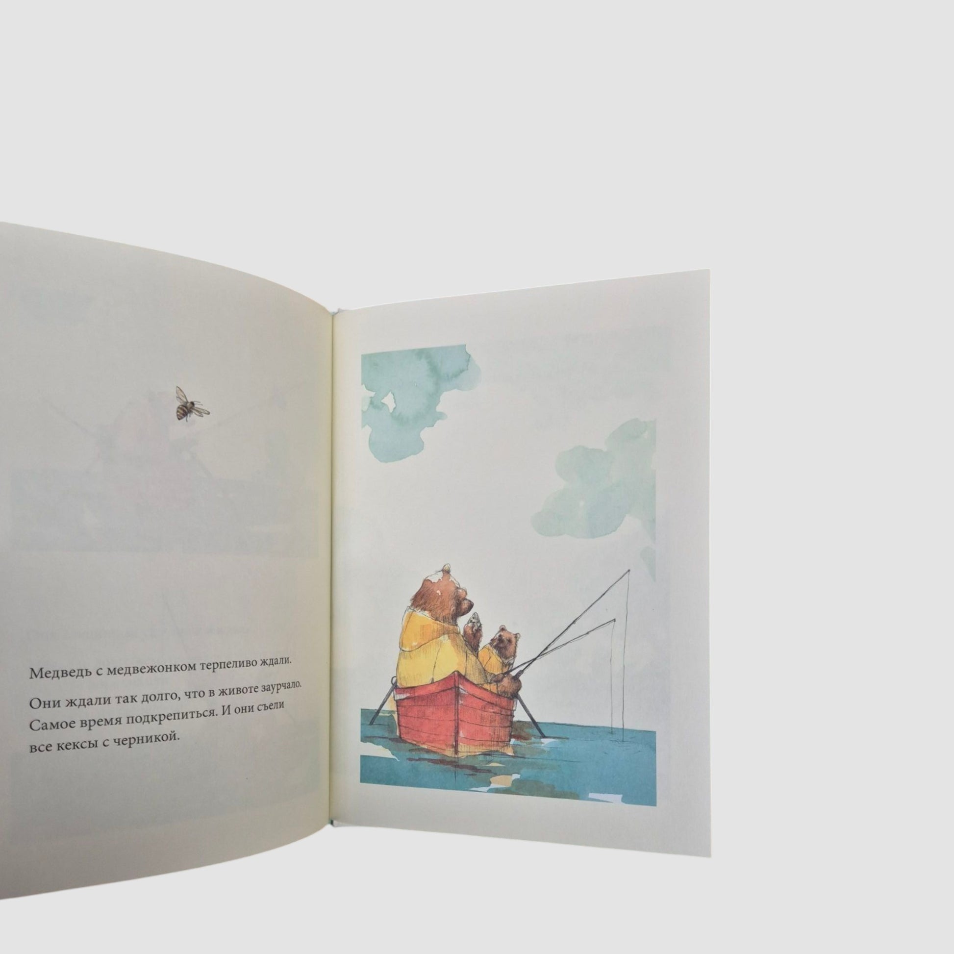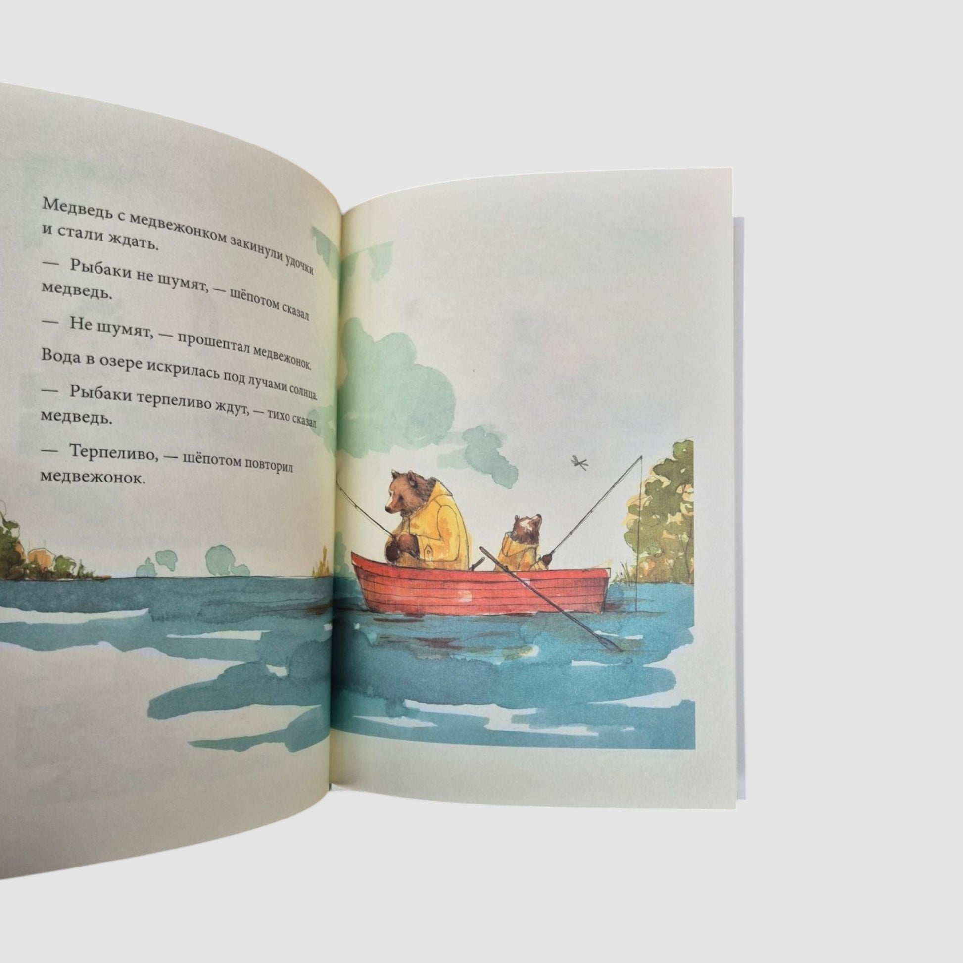 The bear and the cub pulled on blue wide pants, put on black high boots and bright yellow jackets with hoods. Now everything is ready for fishing. Well... almost.