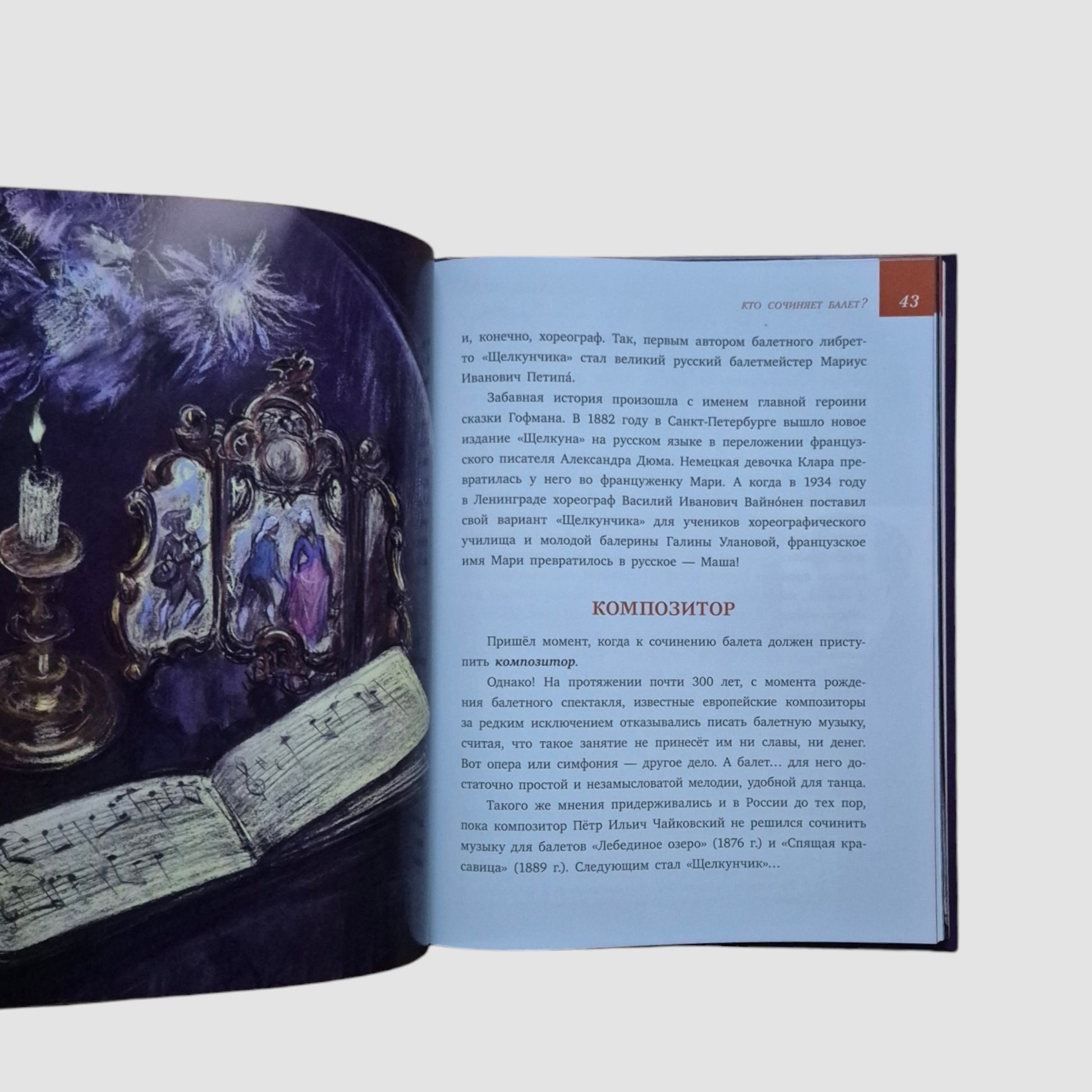 Who is the book "Mosaic. Ballet. Nutcracker" written for? For children and adults; for those who are ready to travel in time and to different countries; for those who love history, art and those who are not interested in them at all. Isn't it interesting to know why the priests of Ancient Egypt danced, and Greek sandals are relatives of ballet shoes; why the French king Louis XIV received the nickname the Sun King, and the four horses in Apollo's chariot, decorating the Bolshoi Theater, have names; how does snow fall on stage and what is a tyutu, edging, pocket, peephole, hatch-fall? And not only! After all, ballet is a country full of wonders. A performance in it, like in a children's game called "Mosaic", is formed only if literature, music, painting, the skill of the choreographer and artists are harmoniously combined with each other. This book will tell you about this and much more. And so that no one gets lost in the centuries and the theatrical labyrinth, a well-known fairy-tale character named the Nutcracker is given to help travelers. Bon voyage!