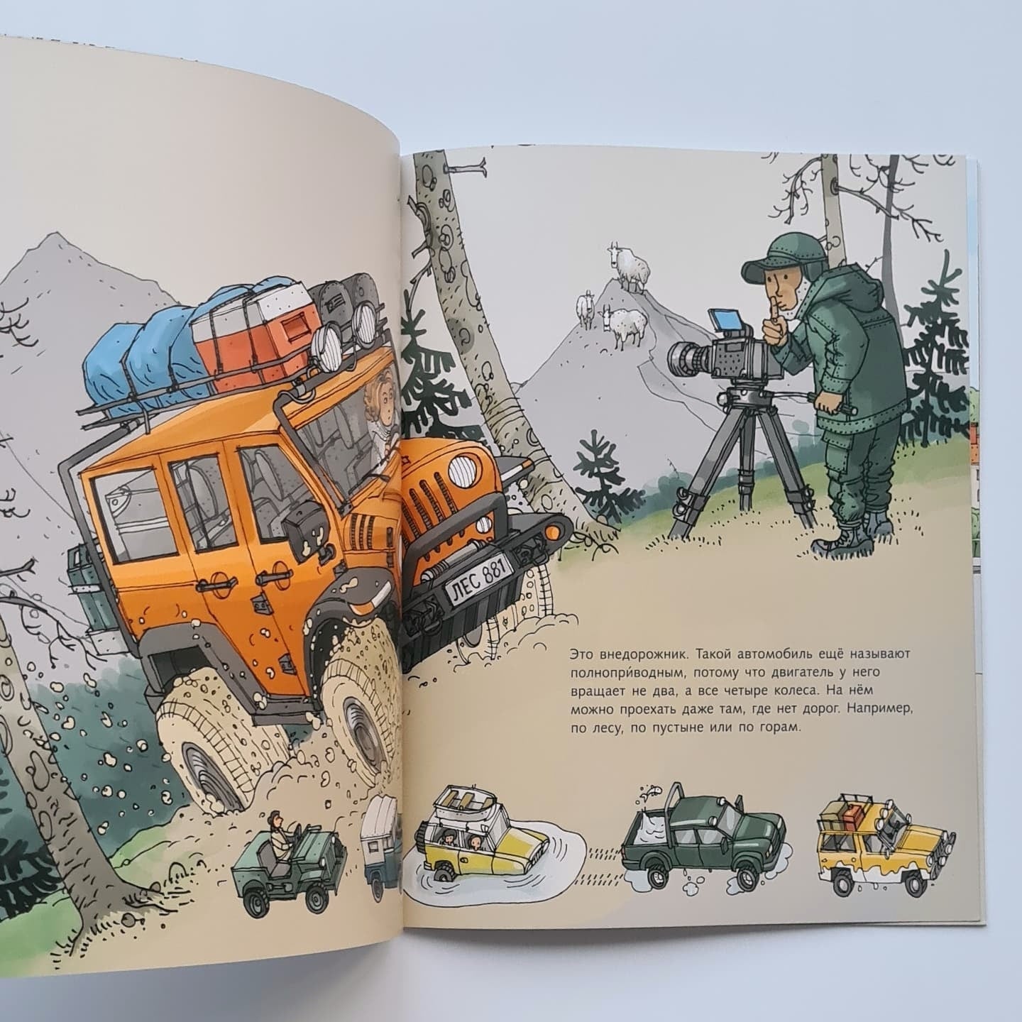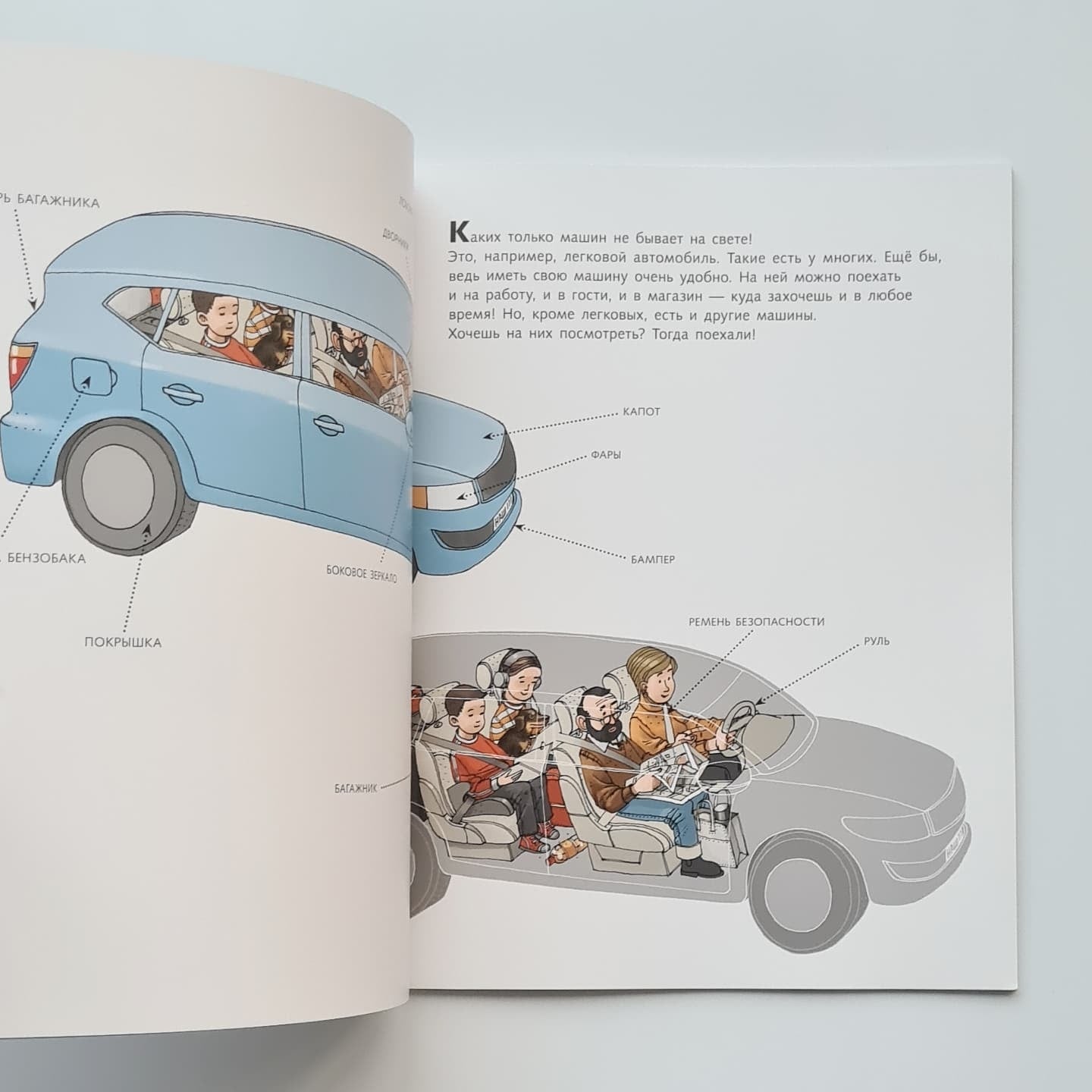 The book is not overloaded with text. The main and honorable place in it is occupied by illustrations. All types of cars are shown, as they say, in action, with all the clarity: an SUV - on an impassable forest dirt road; a truck - in the process of unloading at a supermarket; a motorhome - in a picturesque parking lot by the lake. Therefore, the child will be able to easily learn the differences between vehicles, understand why some look like this and others differently.