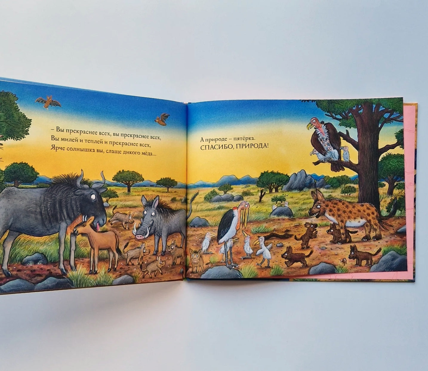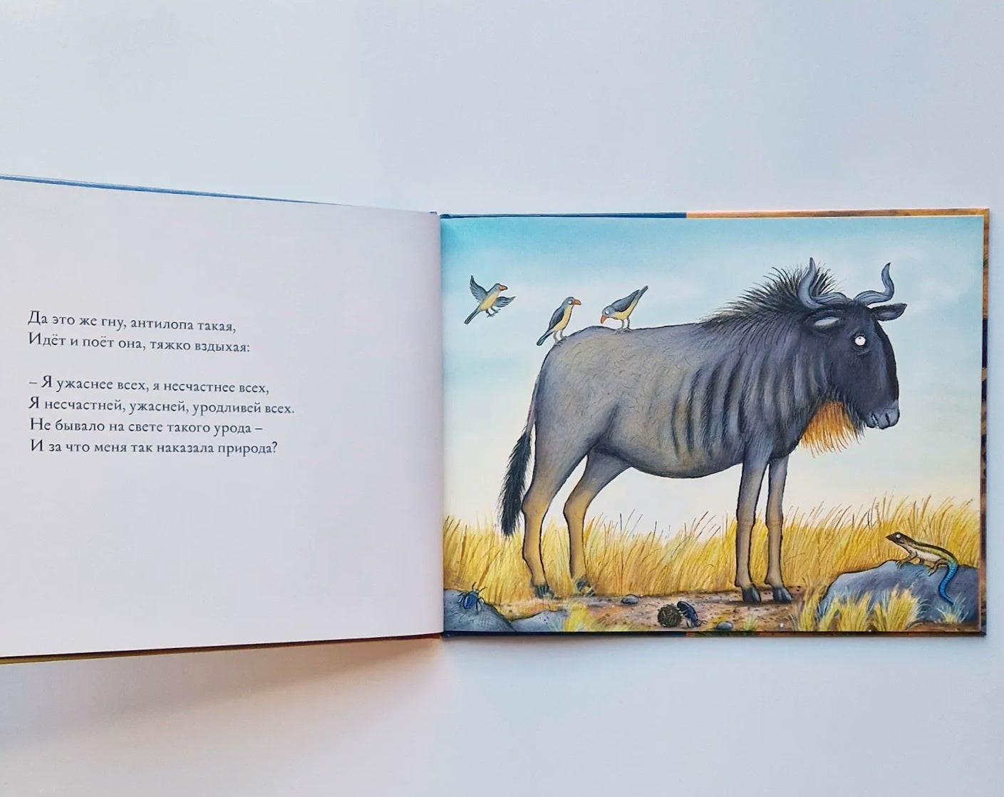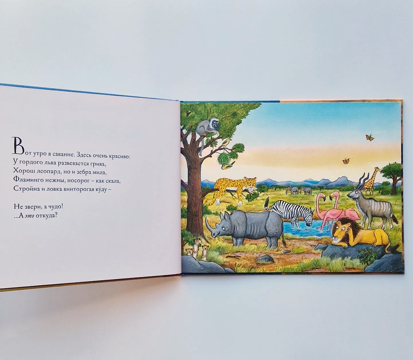 Here is a morning in the savannah. It is very beautiful here. What majestic, proud animals - an elephant, a rhinoceros, a buffalo, a leopard. A royal lion. Not animals, but a miracle! People call them "the big five". ...And where do they come from? Oh, yes - this is a warthog, a vulture, a hyena, a marabou and a wildebeest. People call them "the ugly five". But are they really as nasty as they say?
