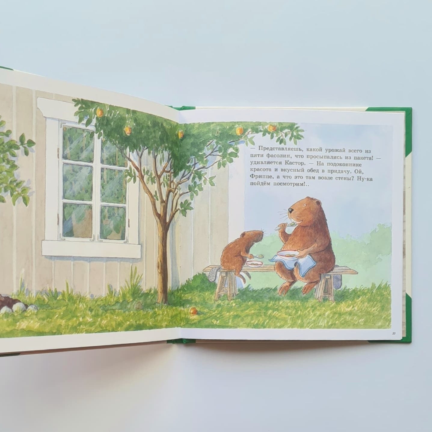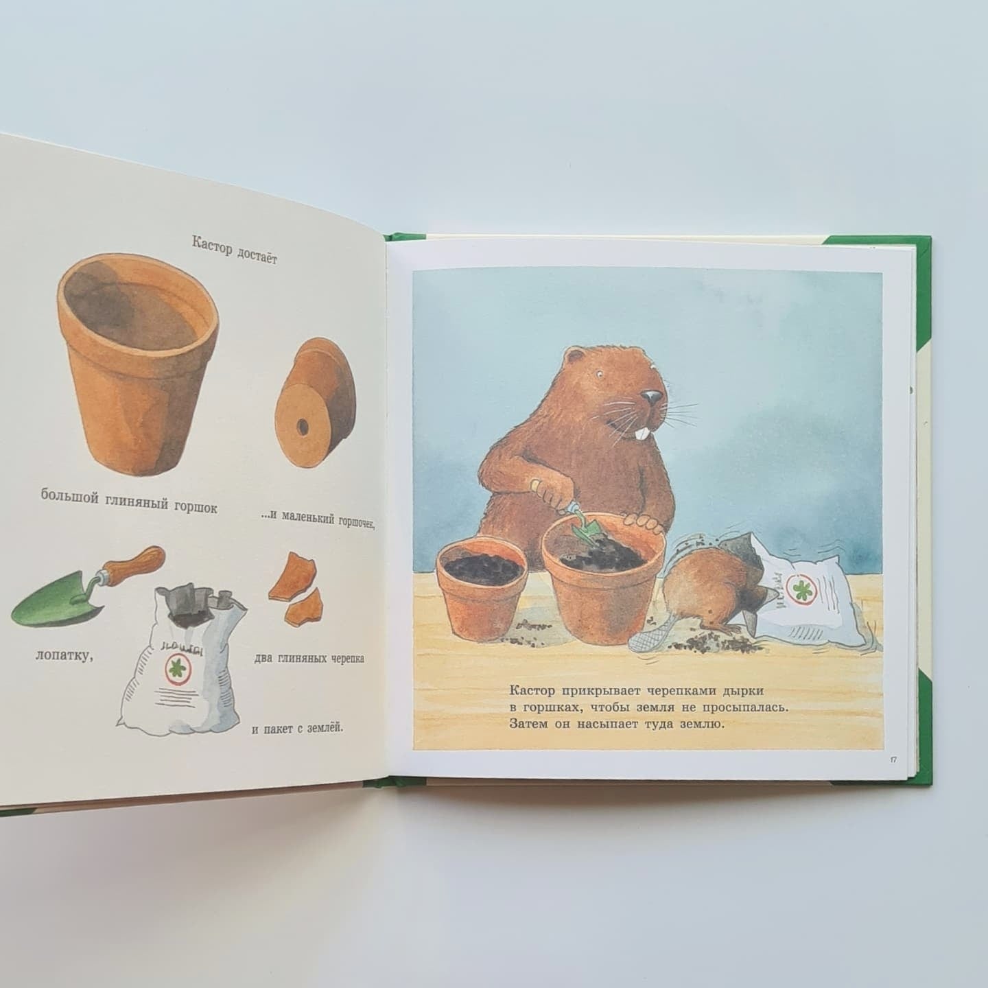 In the book "Castor's Garden" Castor and his assistant Frippe the beaver grow beans on the windowsill. They take a few white beans from a regular store package, soak them overnight, plant them in a pot with soil, water them regularly - and after a little over a week the first sprouts appear!