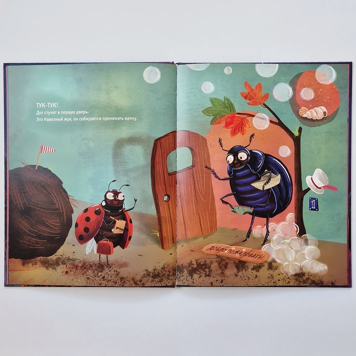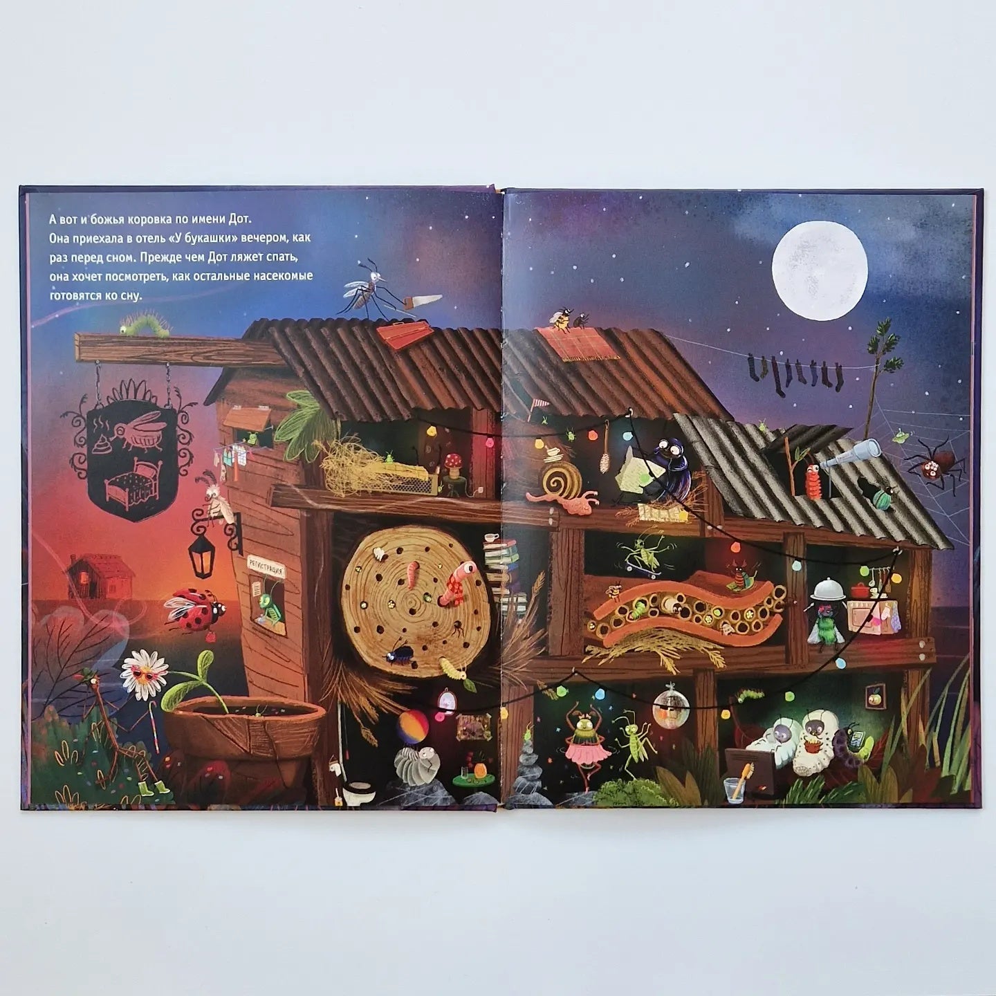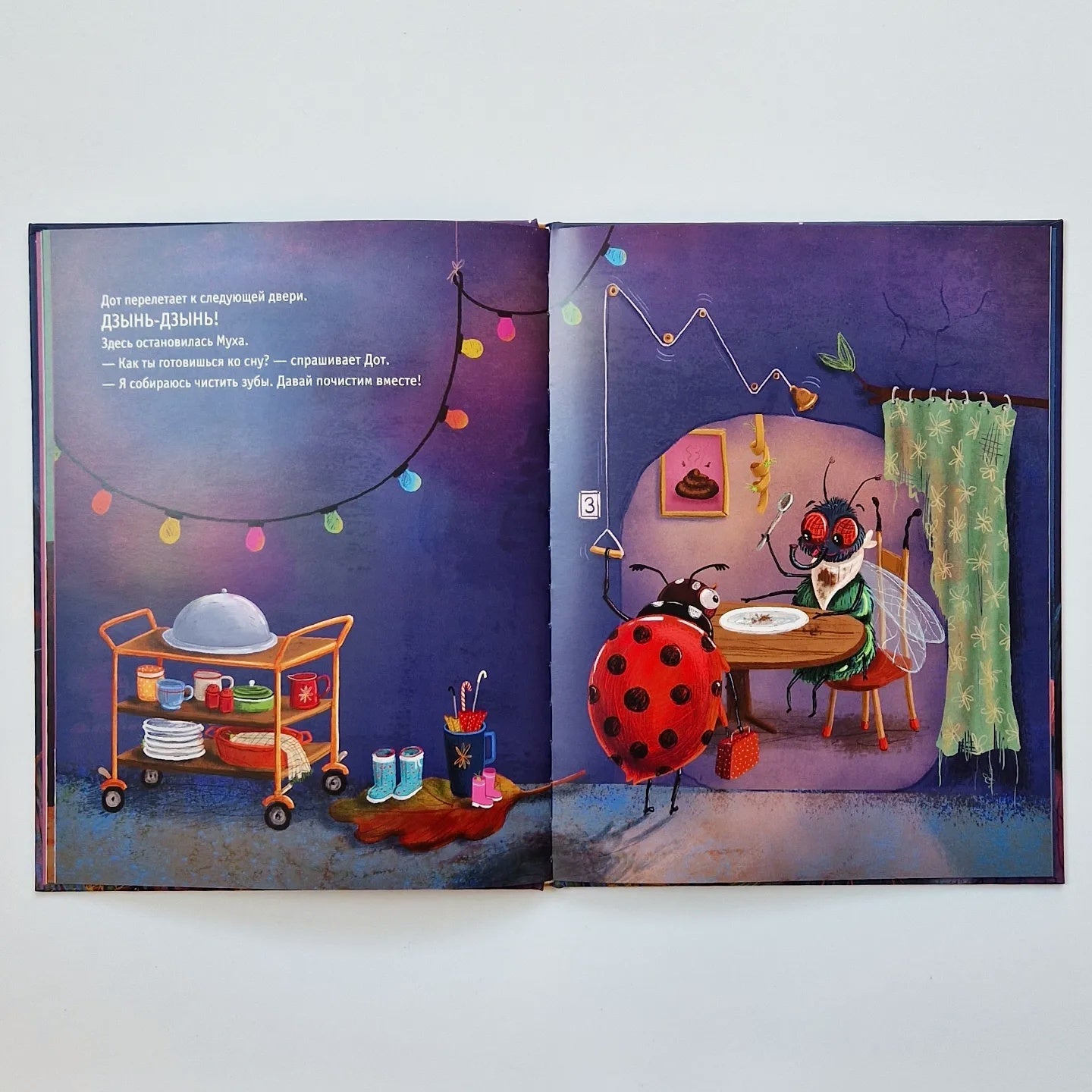 Ladybug Dot arrives at the Bug's Inn and is about to go to bed, but first she wants to see how the other guests are getting ready for bed. Curious, Dot looks in on her neighbors: some are taking a bath, some are brushing their teeth, some are putting on their pyjamas, and some are reading before bed. But everyone wants to be told goodnight.