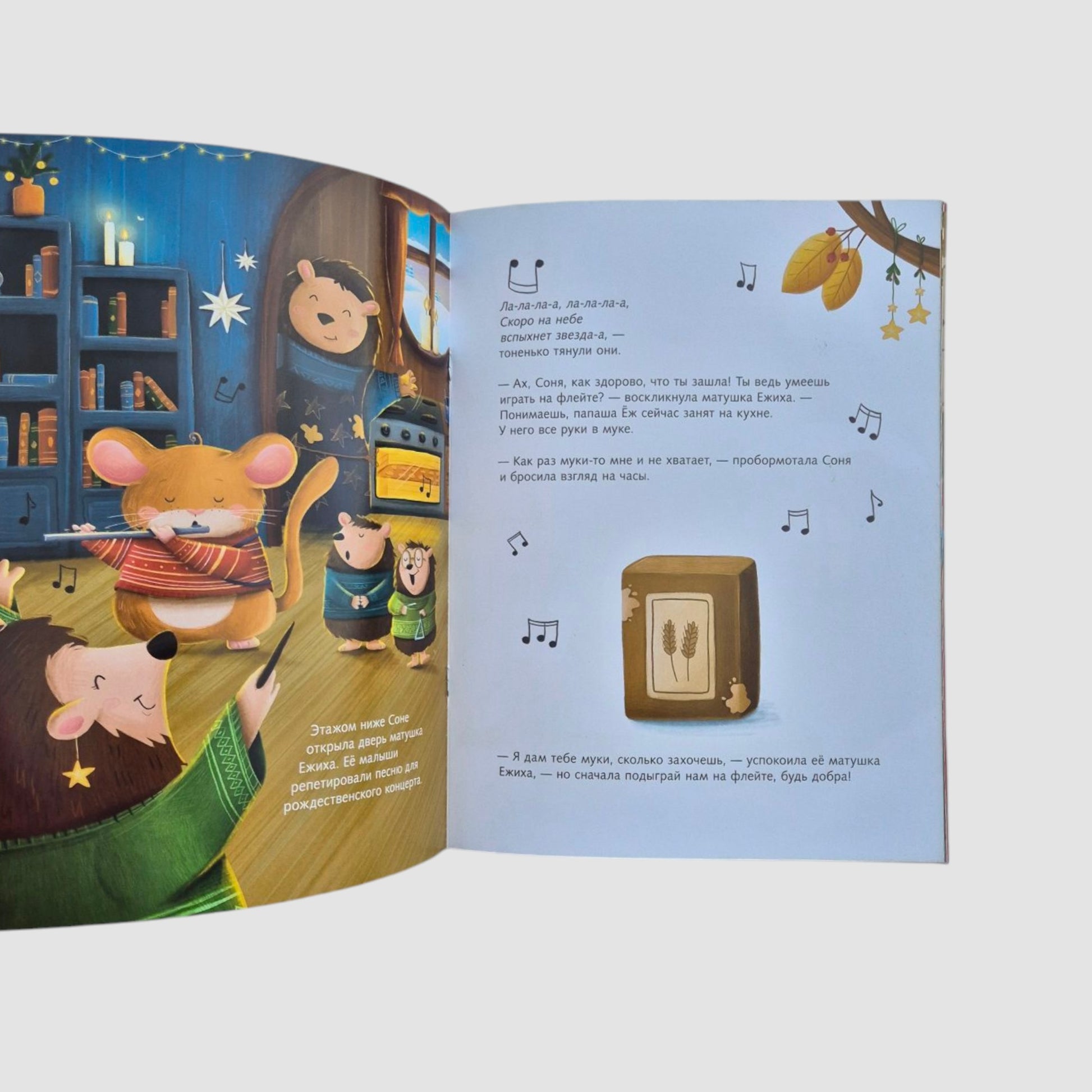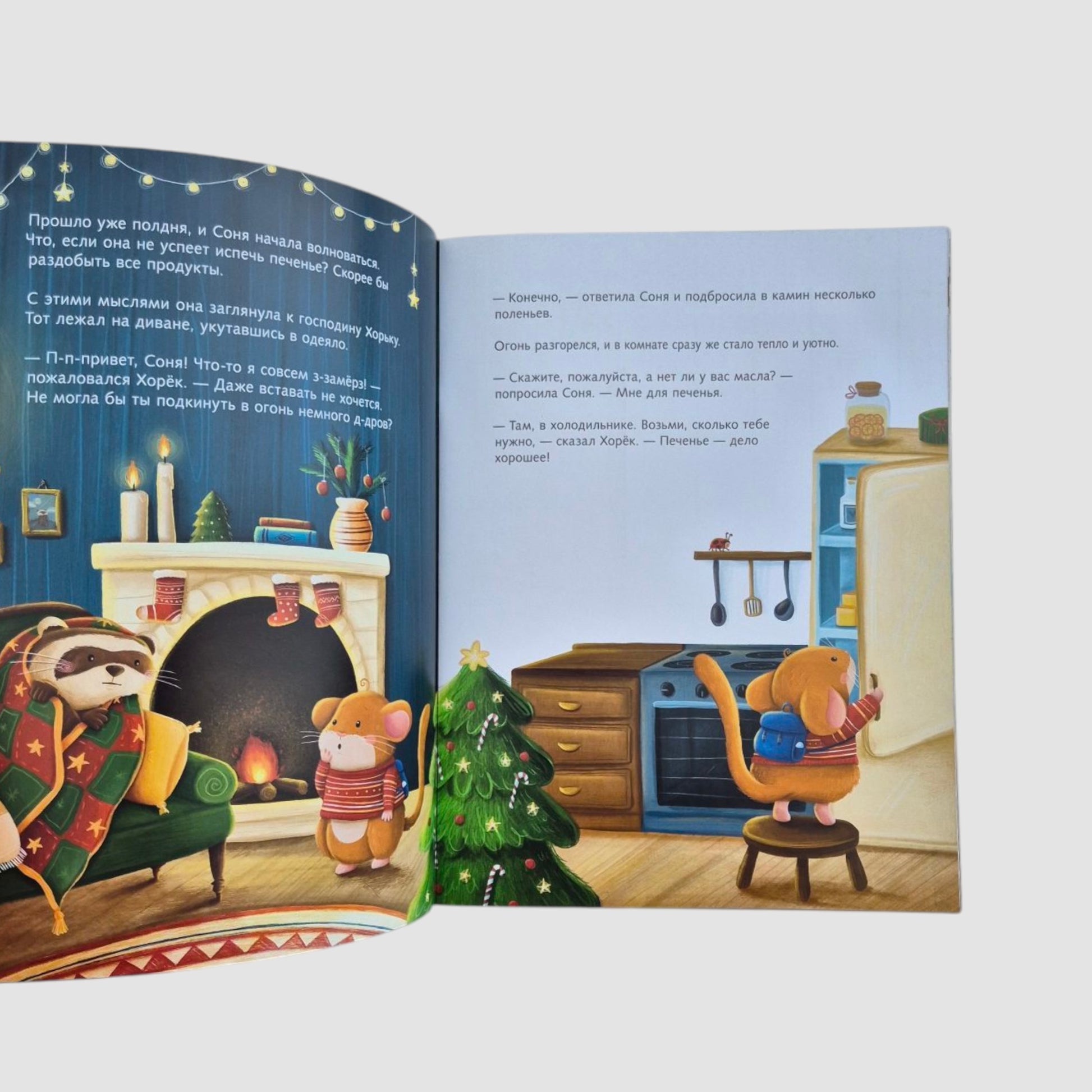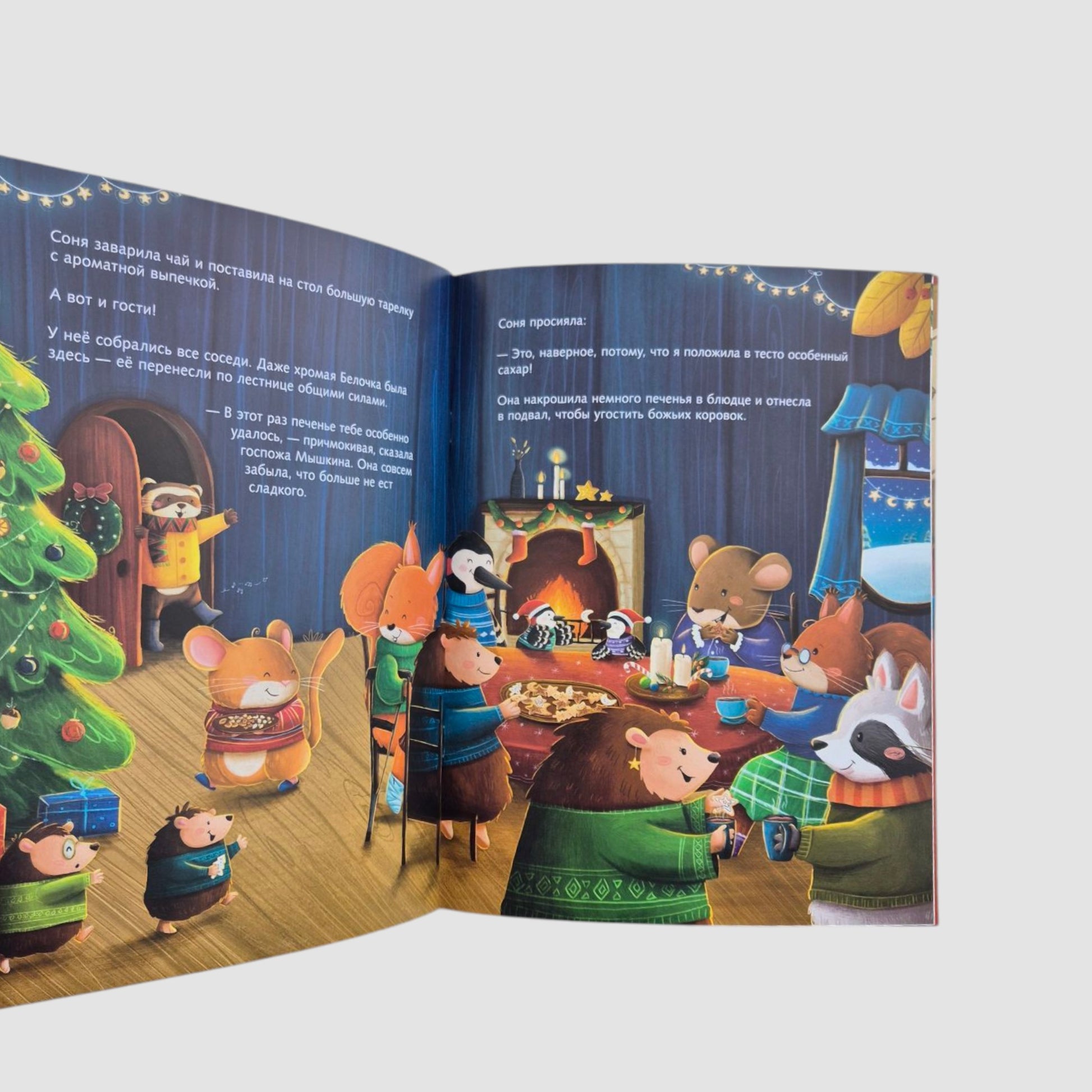 In the trunk of the thick tree where Sonya had built her house, there were many other residents: Mrs. Dyatlova with her family, and Squirrel, and Ferret, and Mrs. Myshkina, and Mother Hedgehog, and Uncle Raccoon. They were all preparing for the holiday, too – cleaning, decorating their homes, waiting for guests, and bustling about in the kitchen. Everyone’s head was spinning, everyone needed help. Sonya helped each of the neighbors with their chores, and they, in turn, wholeheartedly offered the main character everything she needed for her cookies. And when Sonya finally baked them, she invited everyone to her place for tea. The neighbors celebrated Christmas joyfully and amicably at the common table.