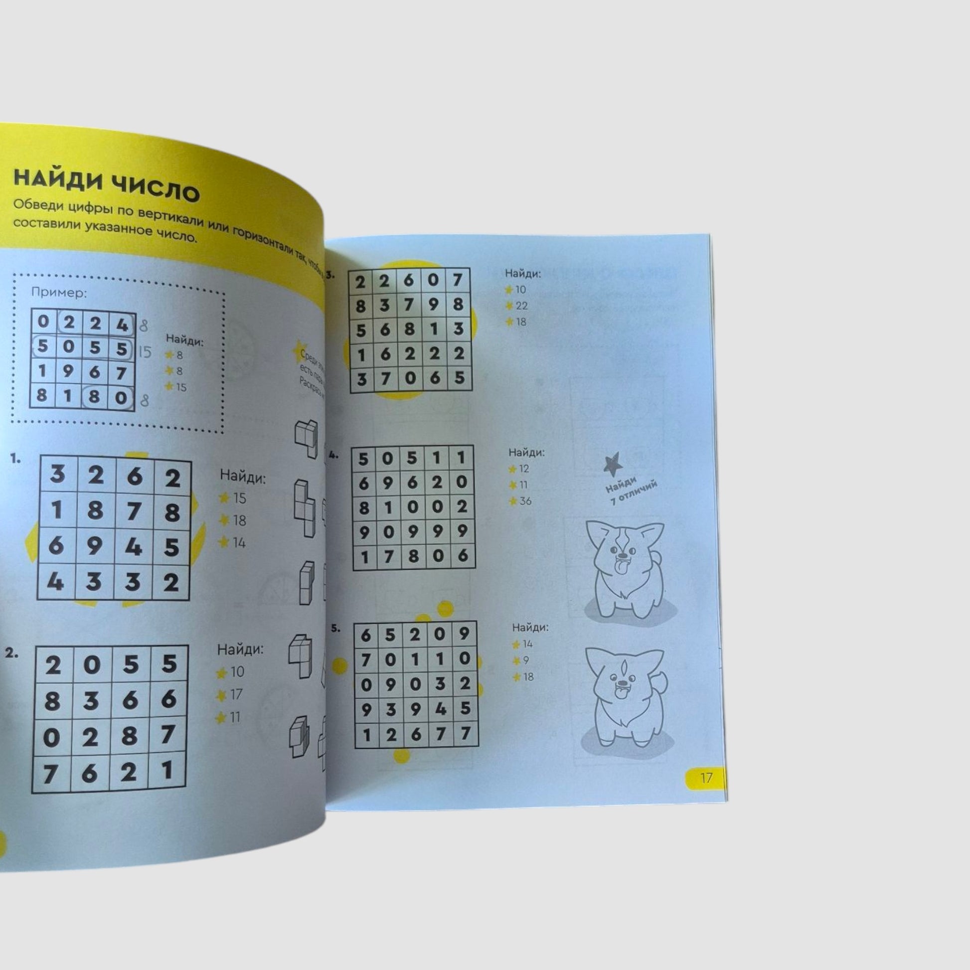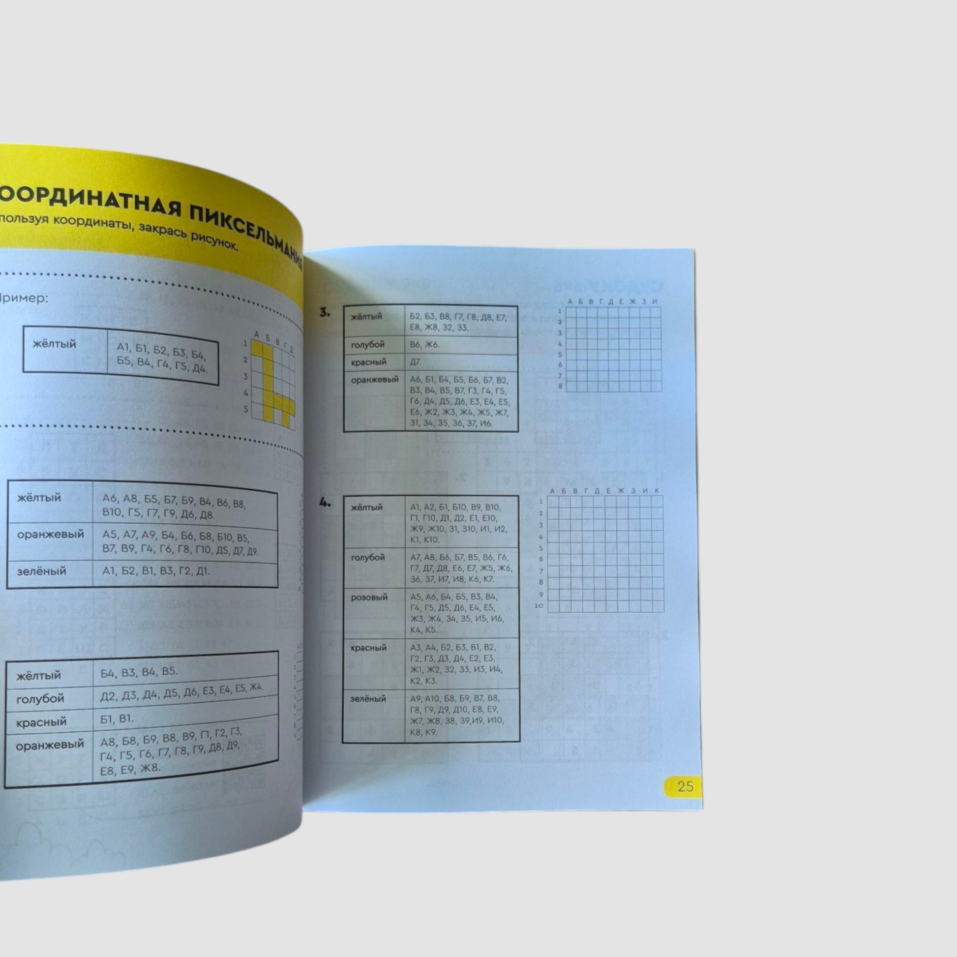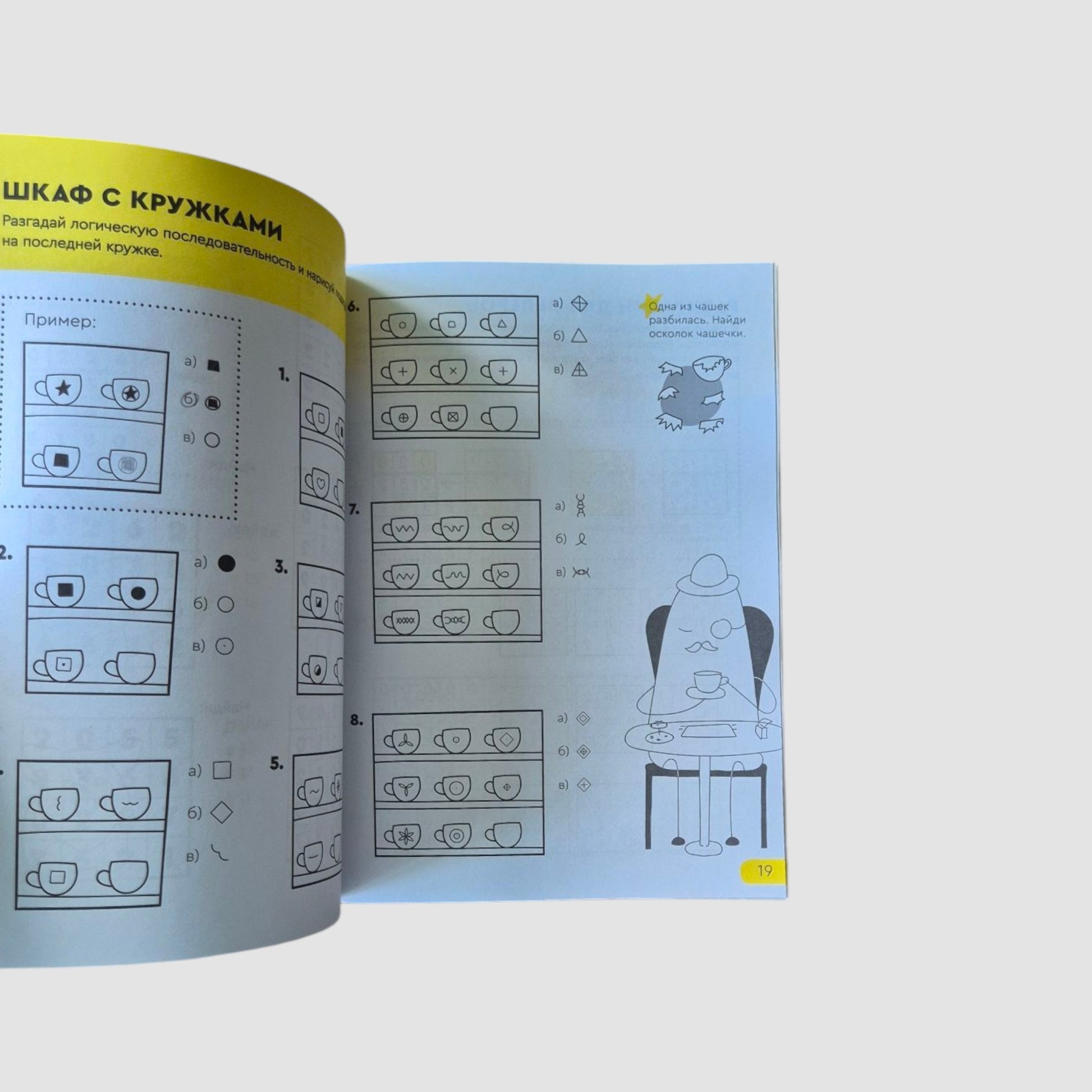 The notebook contains 23 types of tasks, the options of which gradually move from easy to difficult. Some tasks will help develop logical and spatial thinking, others will help understand counting and number series, and some tasks will improve knowledge of letters and reading skills.