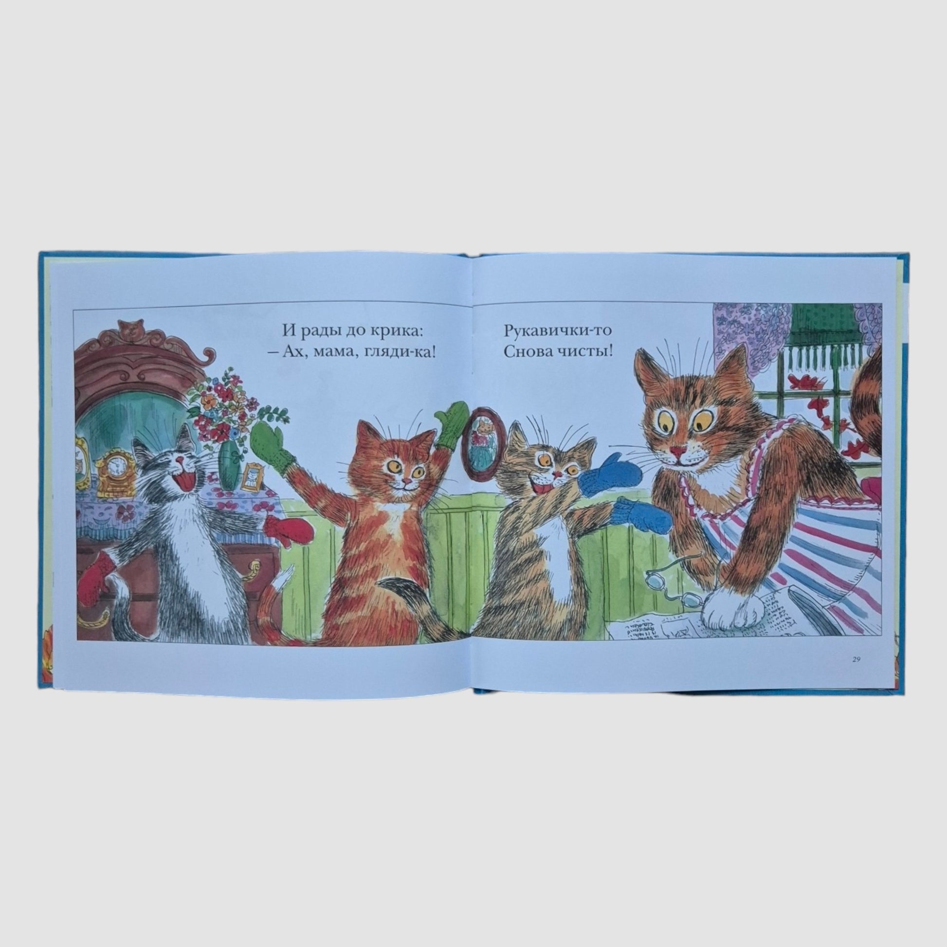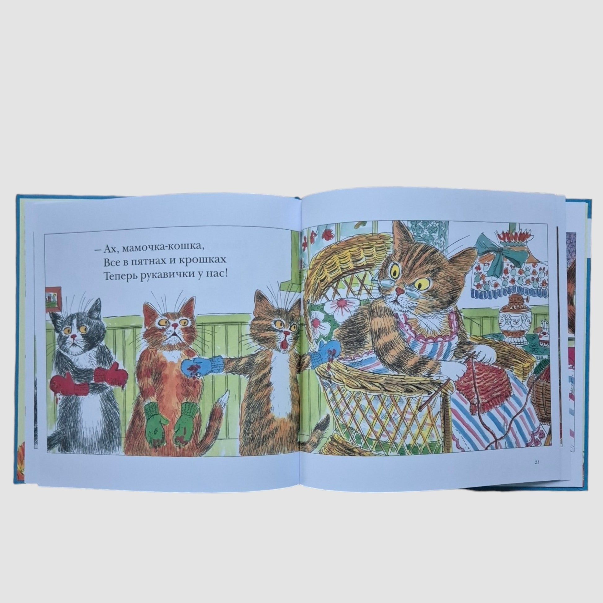 The plot of the classic poem is predictable, it has a lot of repetitions, which is exactly what little children love. The poem is set in large font, one or two lines per page, it is easy to read. The new translation of the old English song was made by the young poet Rodion Bobrov, and his version completely preserves the content of the original: the kittens manage not only to find, but also to dirty and then wash their mittens.