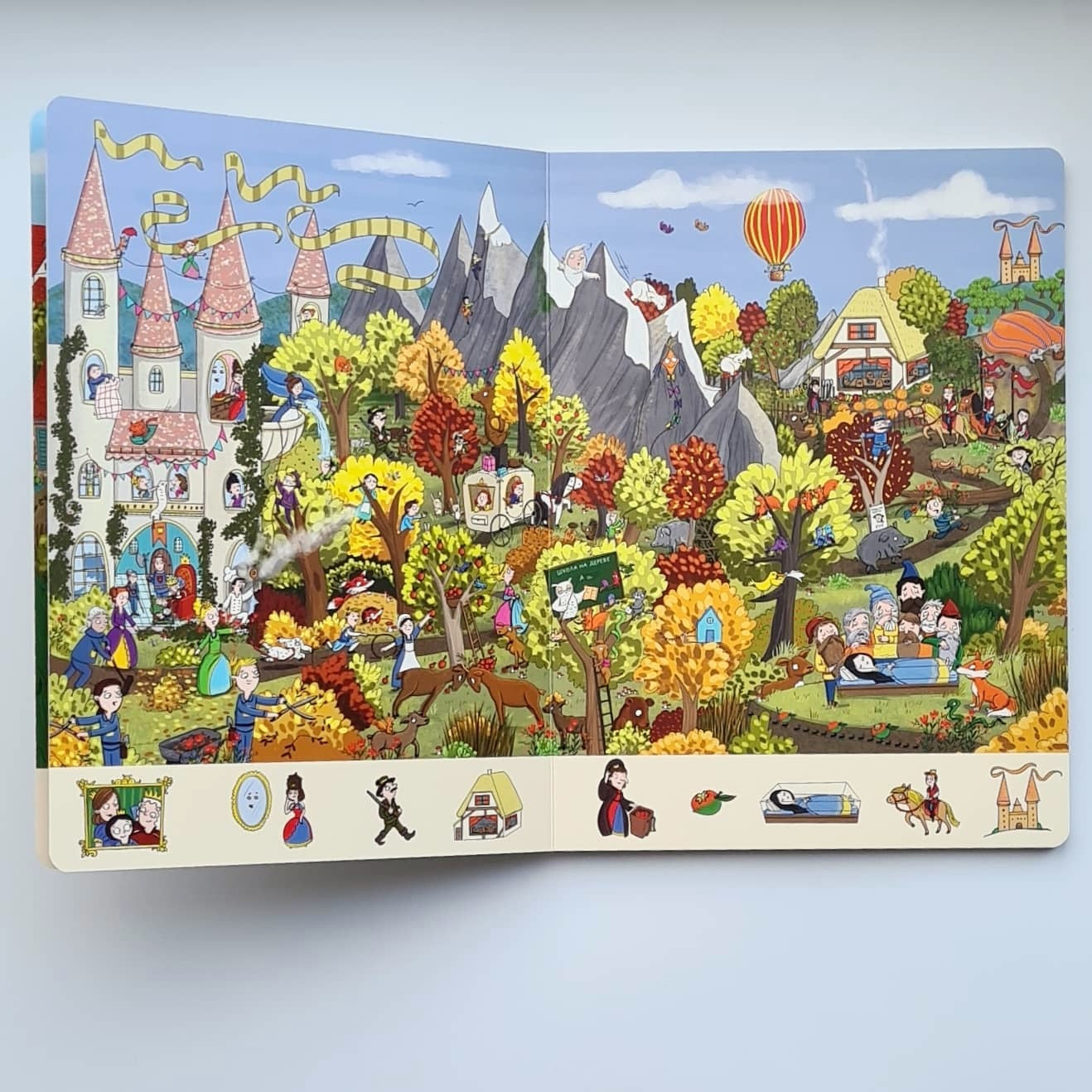 The following fairy tales by the Brothers Grimm are included in the Wimmelbuch: Little Red Riding Hood, Snow White and the Seven Dwarfs, Sleeping Beauty, Hansel and Gretel (also known as The Gingerbread House), The Wolf and the Seven Little Goats, and Puss in Boots.