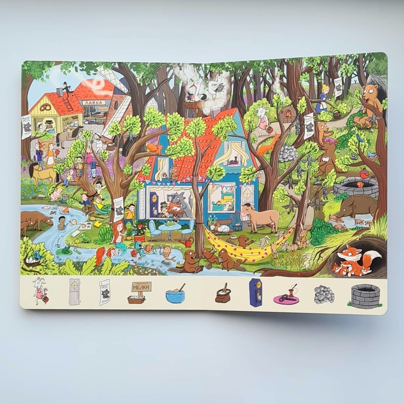 In addition, ask your child to find images that are not related to the fairy tale or that seem absurd. The Wimmelbuch contains funny but inappropriate characters: in "Little Red Riding Hood", for example, the crocodile in the river reads a newspaper, the geese do yoga, and so on. Tasks to find the odd one out train logic and attentiveness.