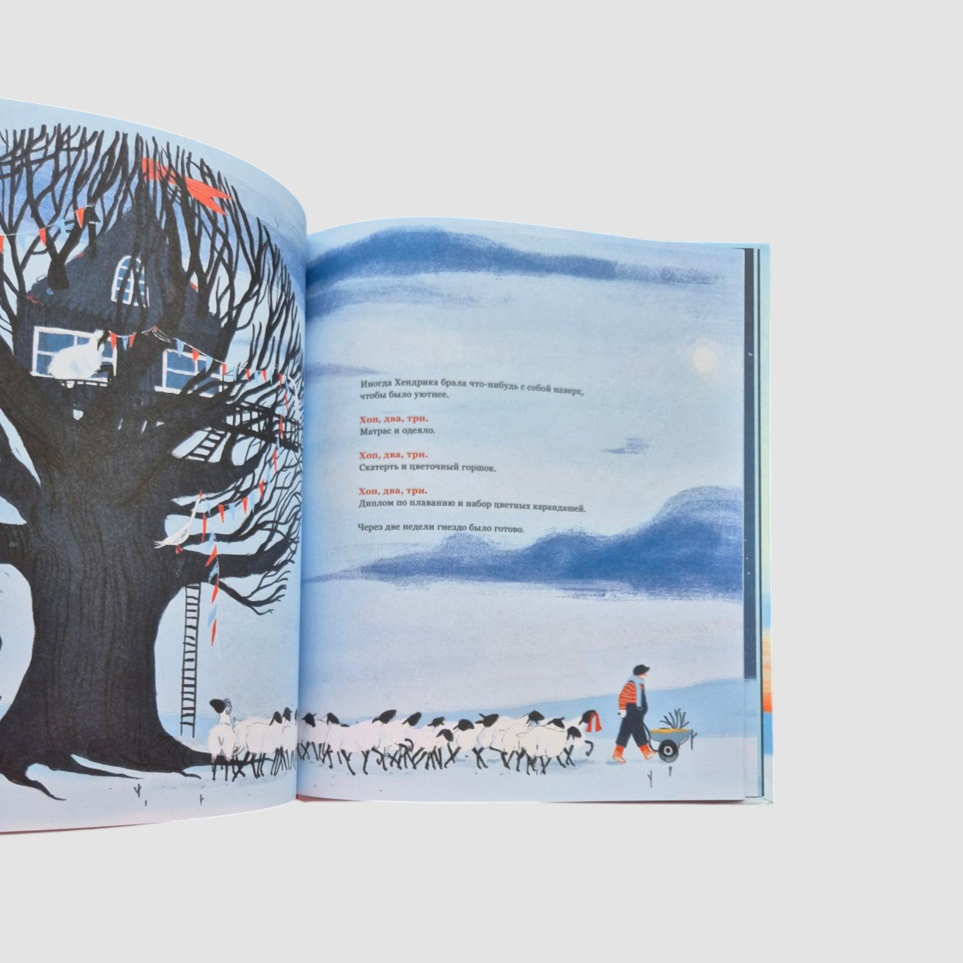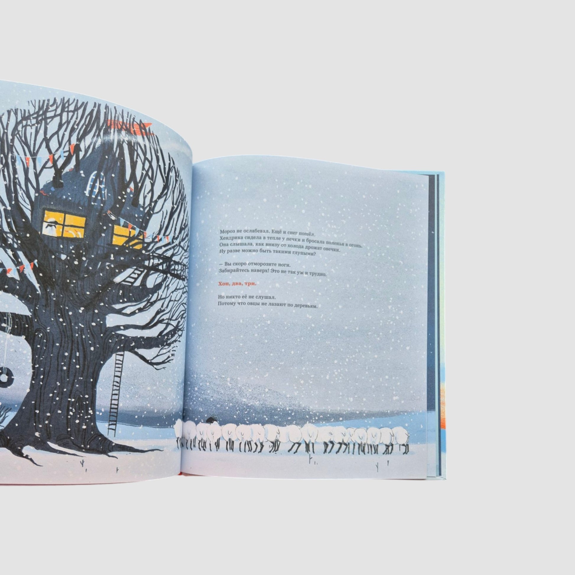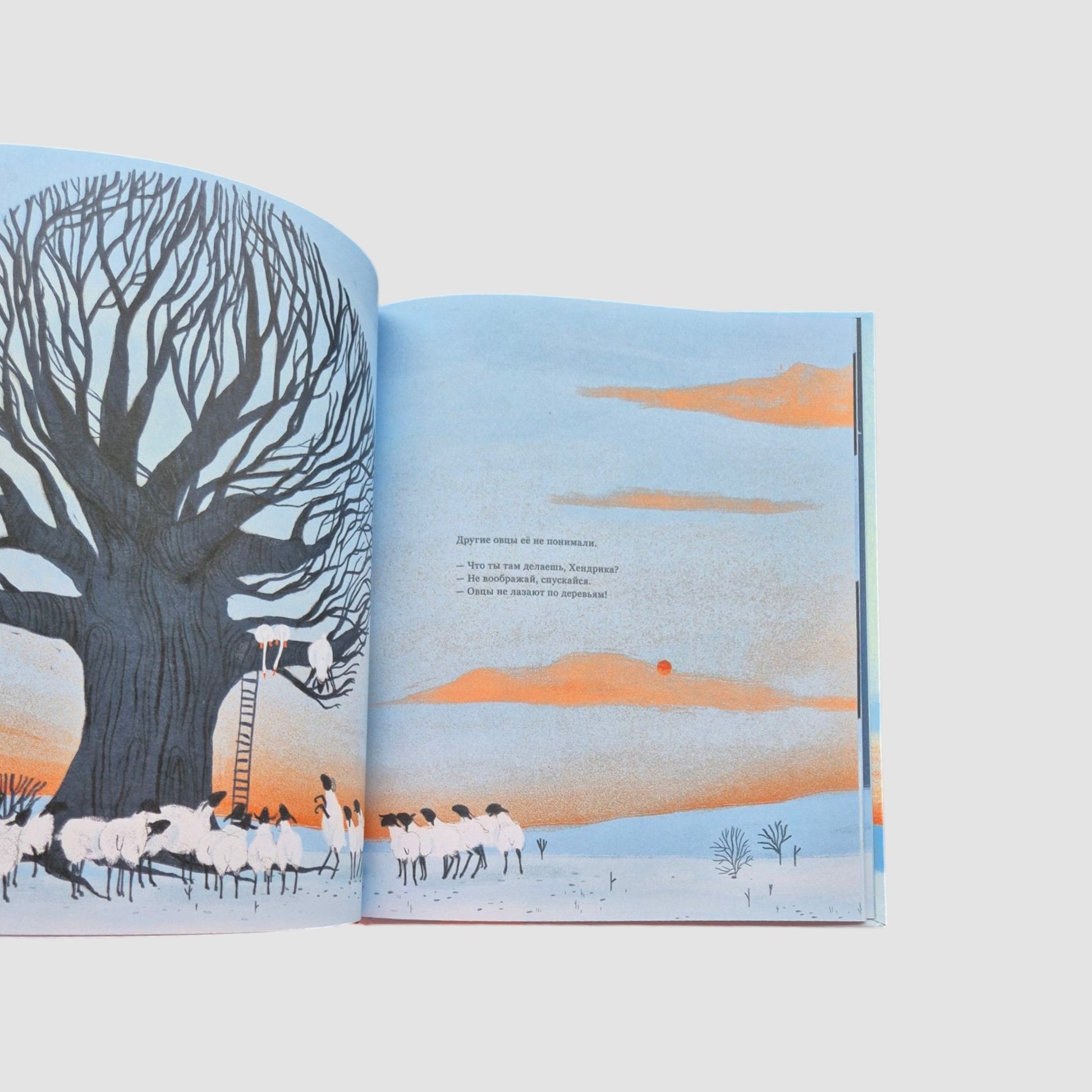 Hendrik the sheep climbed high up a tree, and she was very happy there! Her family thought it was ridiculous, because sheep don't climb trees. Not even in the cold. Not even when it snows. Or do they?