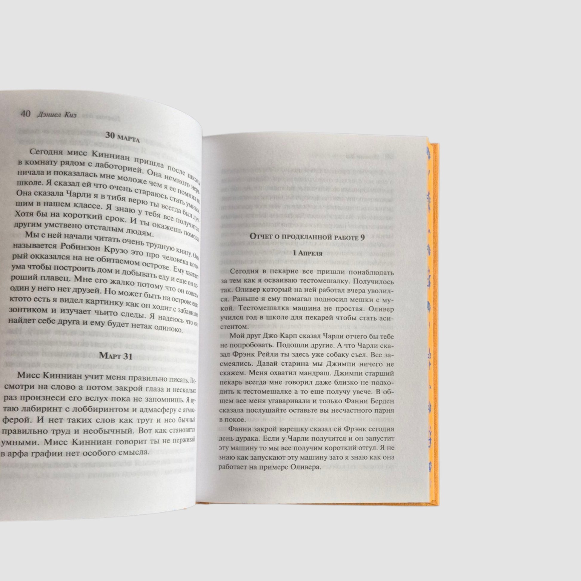 The changes with Charlie Gordon are happening before our eyes, here and now. The first reports are full of spelling mistakes, it is very difficult for him to express his thoughts, gradually he begins to write correctly and to tell about events perfectly.