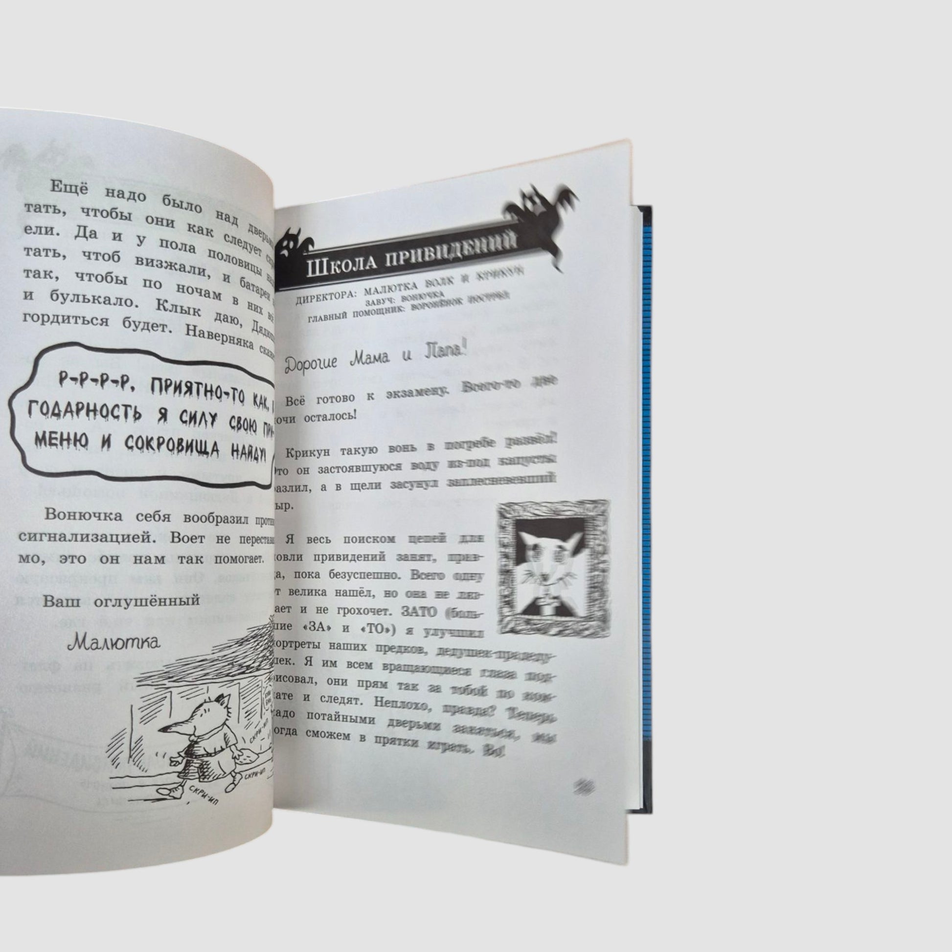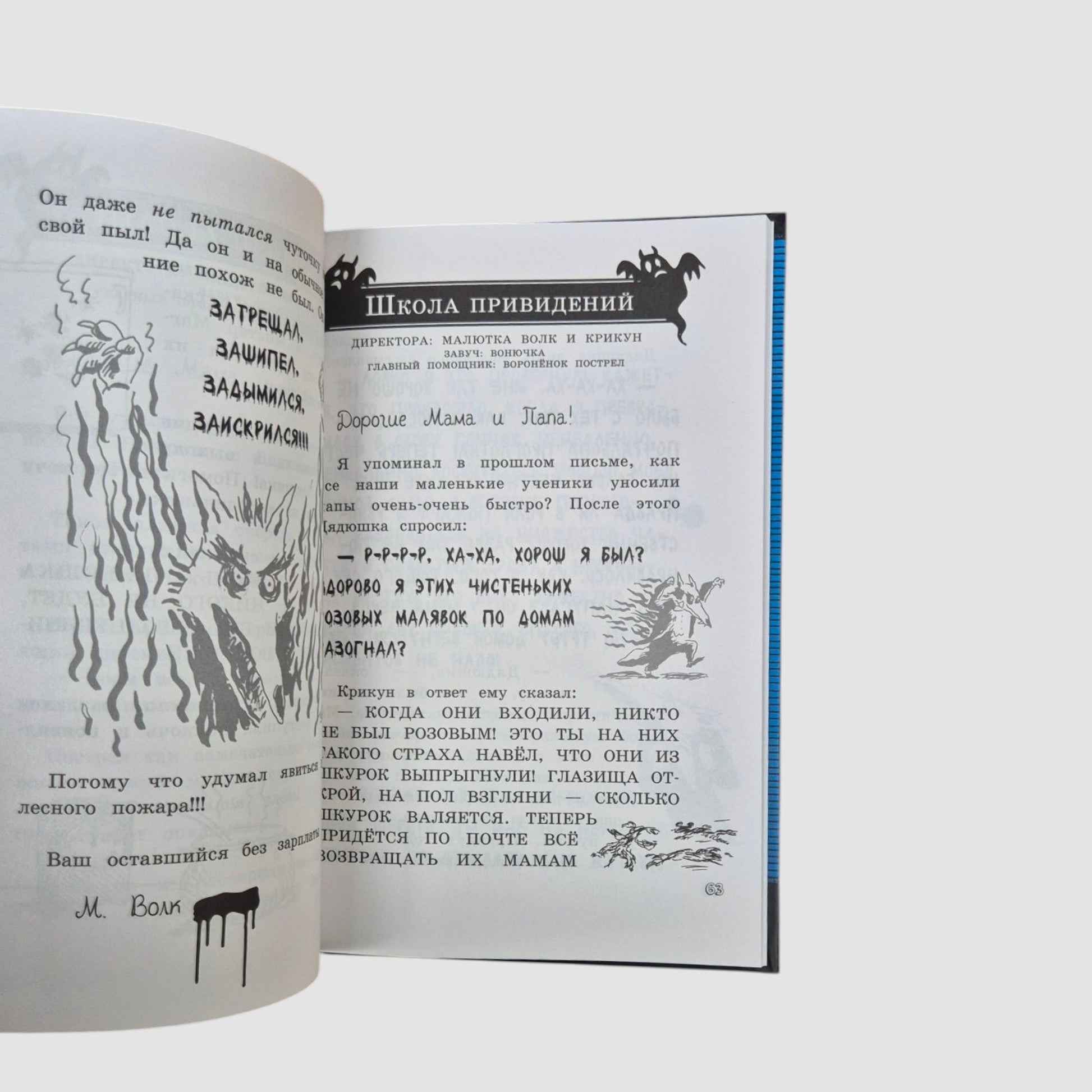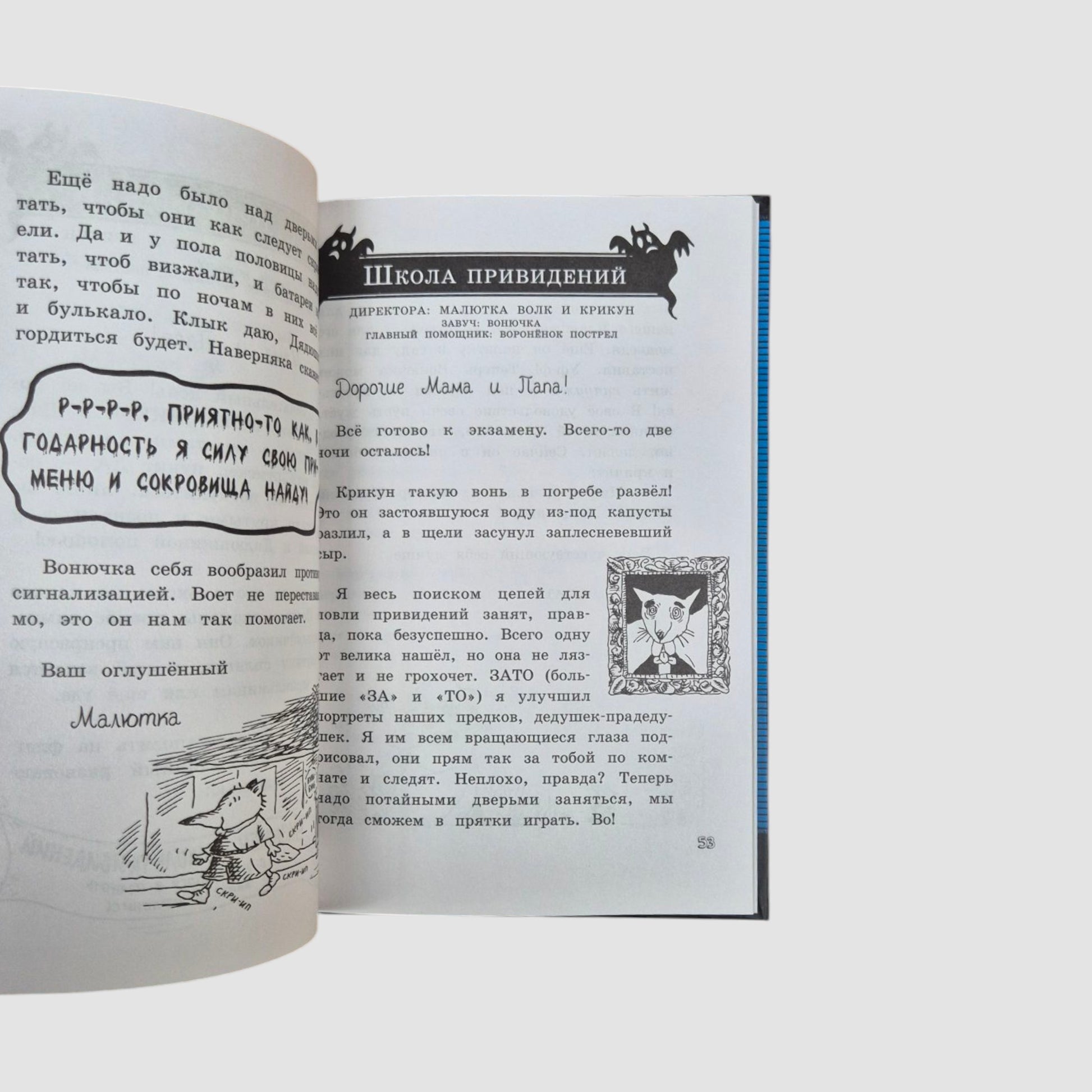 Fidget Little Wolf, as usual, wants to do everything so that his parents are happy with him: together with his brothers Screamer and Stinky, he opens a new School of Ghosts and writes detailed letters to his mom and dad about all his joys and misadventures. The main attraction of the school is a real ghost - Uncle Great Evil from the first book. Now he can dissolve in the air, pretend to be a forest fire and hide in a bottle and scares everyone around him so much that there is only one brave student who is not afraid of his uncle's antics. The third book, like the first two, is filled with jokes, drawings and blots, new characters appear in it, events develop just as quickly, and Little Wolf is still tireless, inventive and cheerful.