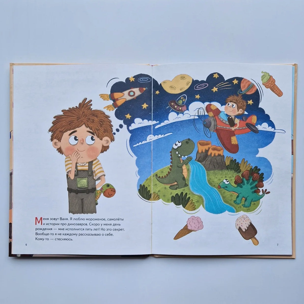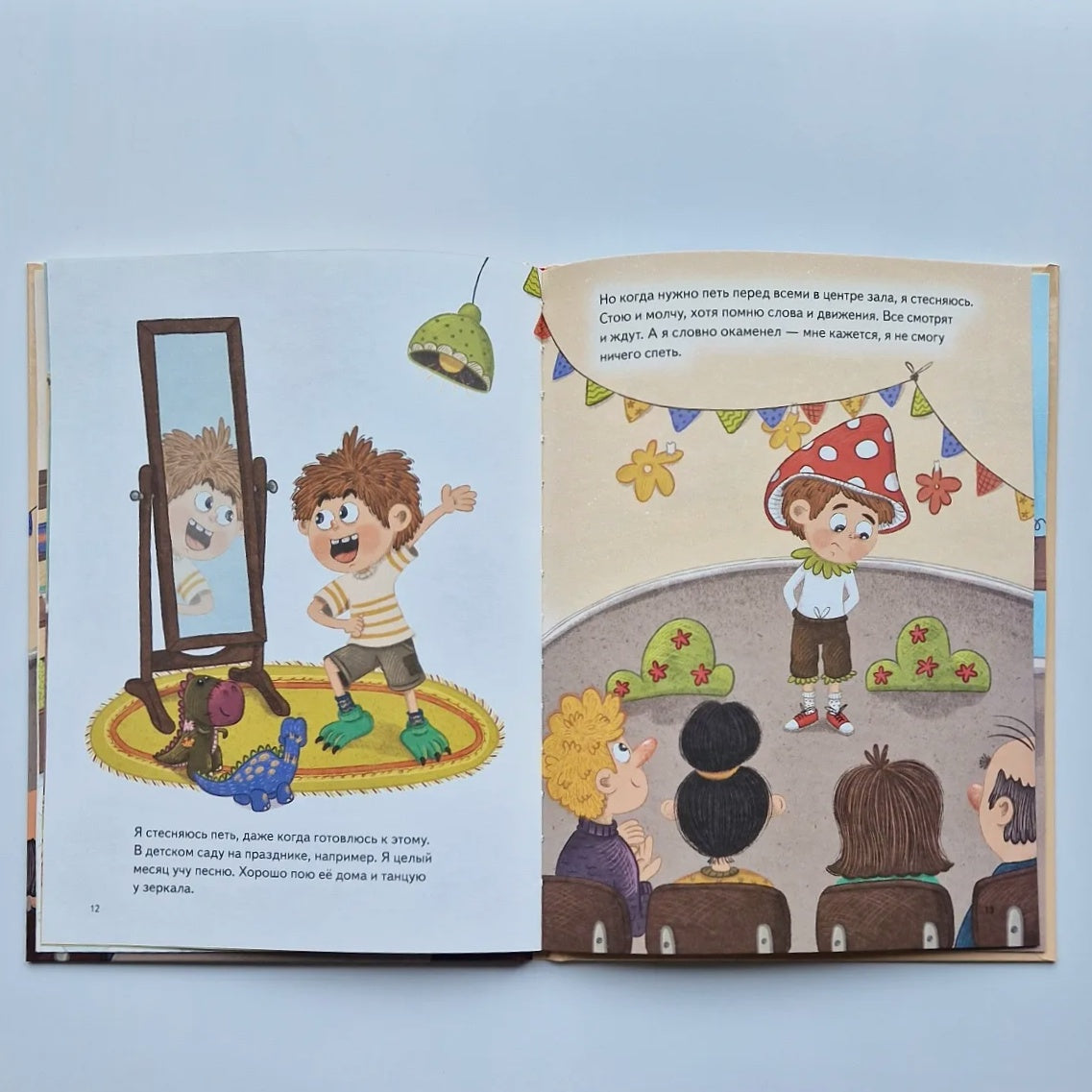 Meet Vanya. Like many children in the world, he loves dinosaurs, goes to kindergarten, goes swimming and simply adores chocolate cakes. And also - he is shy. Like many children in the world! When an unfamiliar grandmother asks your name, when you need to perform at a party and change clothes in a public place. You will find stories that are close to all children and parents. Reading Vanya's story, children will recognize themselves, and parents will see how to support children in moments of shyness and embarrassment. And together with the heroes of this book, they will understand that it is normal to be shy.