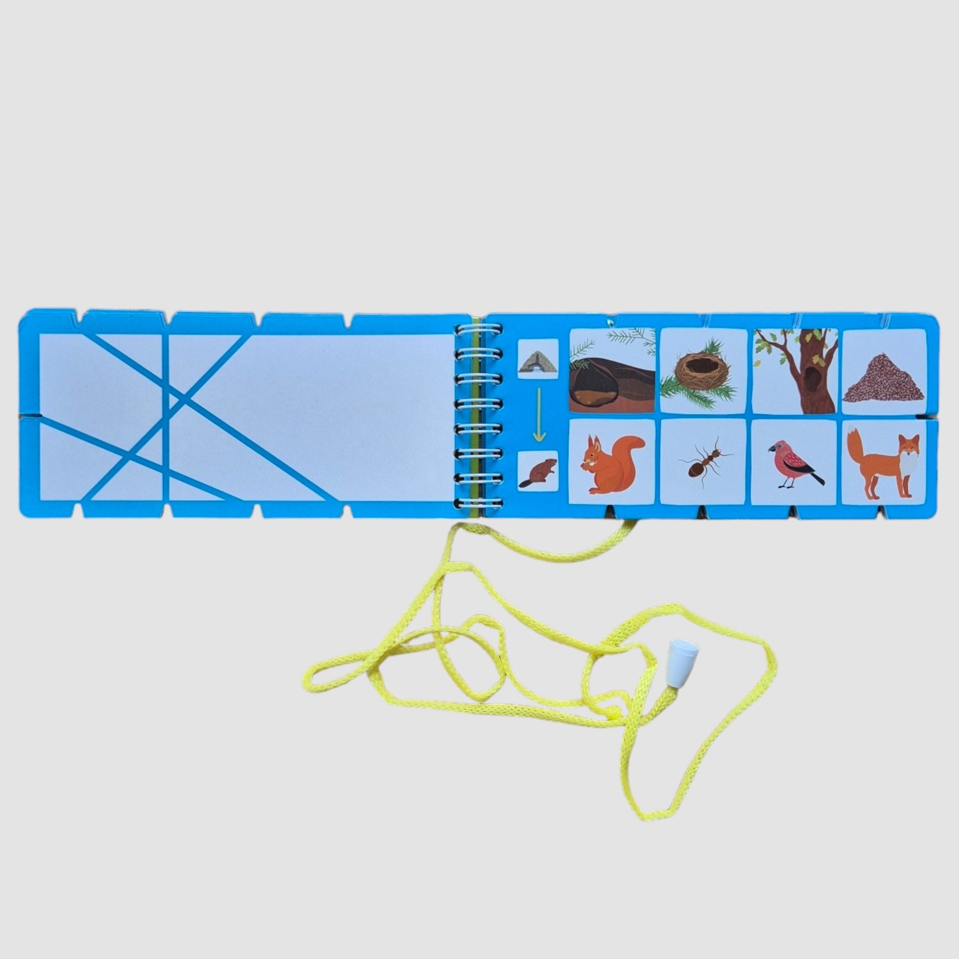 The notebook contains 18 game cards, a spring-loaded binding and a game cord, securely attached with a metal rivet. Each card contains a task, the child learns to analyze, think, find patterns and compare, determine the features by which animals are similar or different from each other.