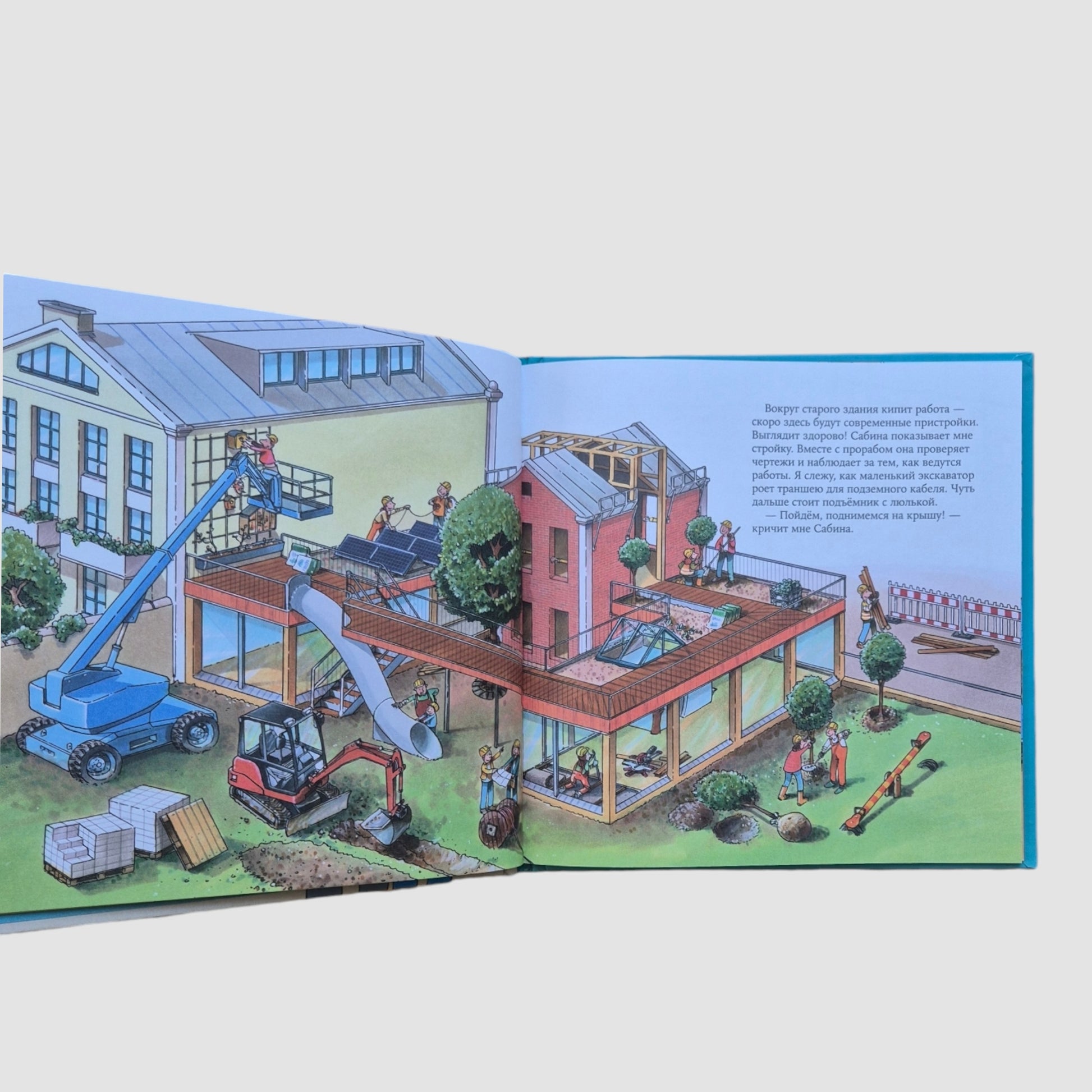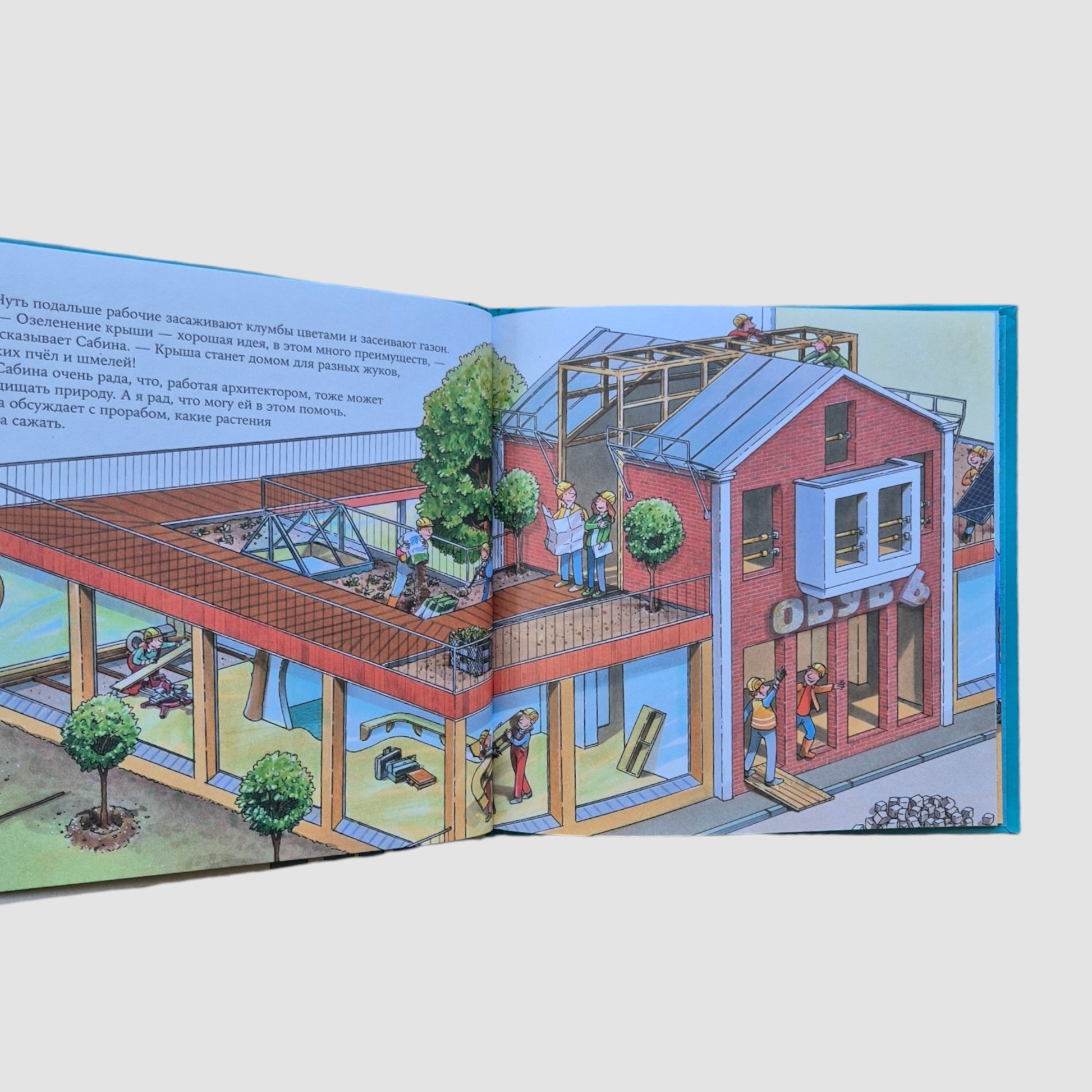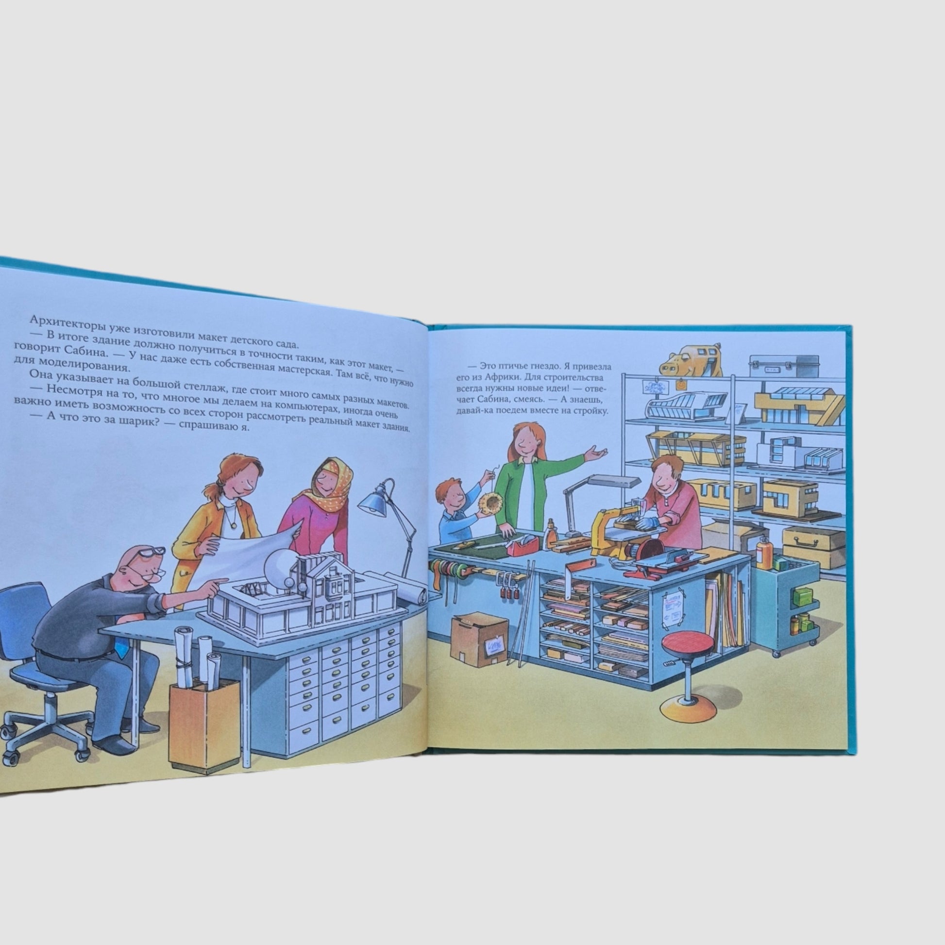 Все книги построены по принципу «один день из жизни…»: герои историй, дети, приходят в гости на работу к своим взрослым знакомым. В этой книге мальчик Пауль вместе со своей соседкой Сабиной знакомится с профессией архитектора. Вы узнаете, как выглядит чертёж, для чего делают макет, чем занимается архитектурное бюро и многое другое!