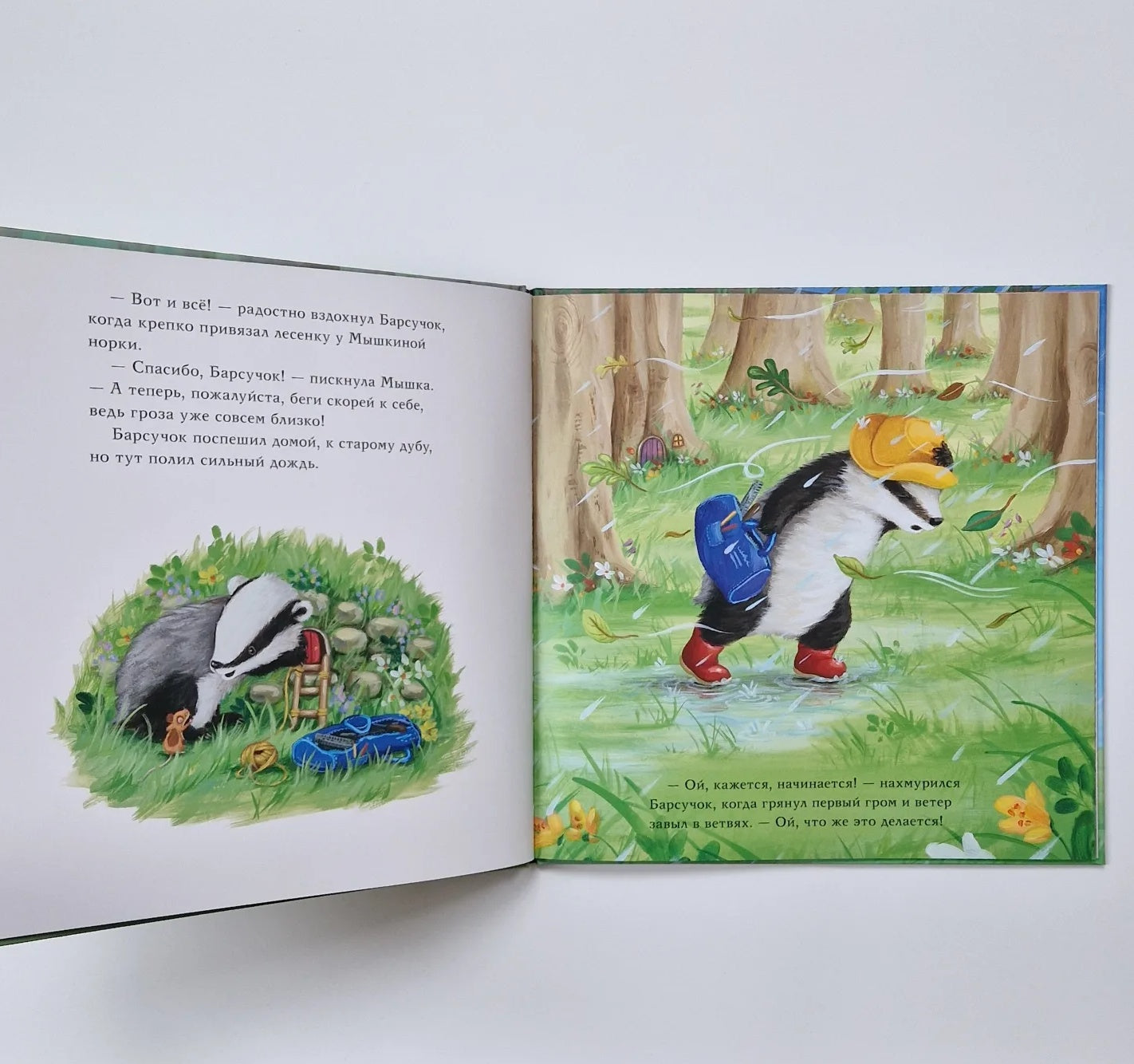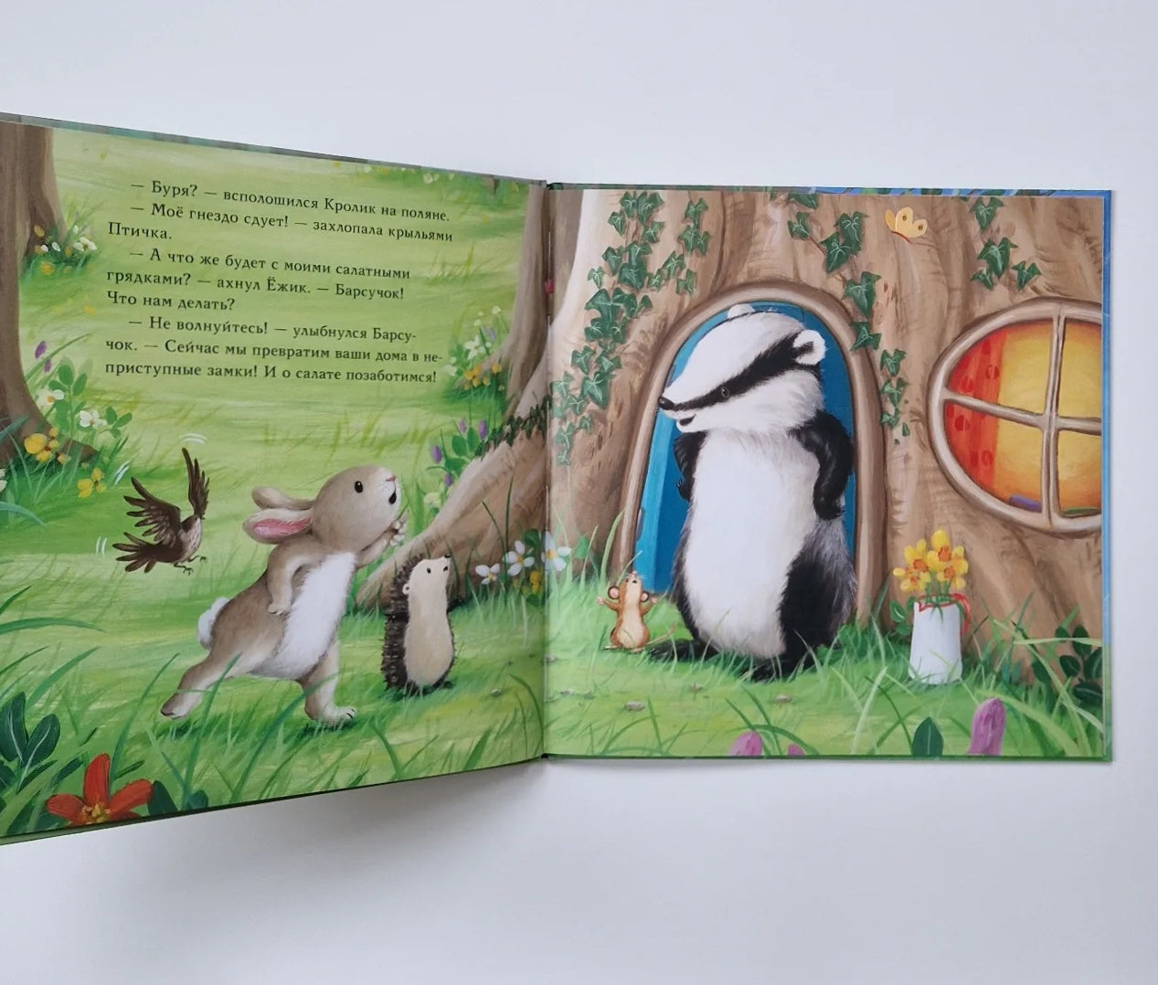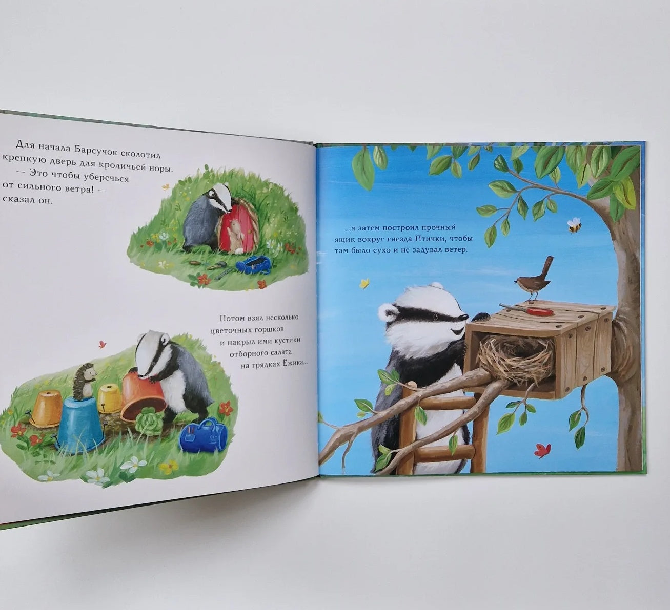 Добрый и находчивый Барсучок дружит со всеми зверятами в своём лесу. Что бы ни случилось, он всегда придёт на помощь! В этот раз на лес надвигается настоящая буря, и маленькие обитатели встревожены: что, если от сильного ветра пострадают их гнёзда, норки и грядки? К счастью, умелый Барсучок знает, как защитить дома и посадки, и с радостью научит этому друзей. Но успеет ли он сам спрятаться от грозы и укрепить свой домик?