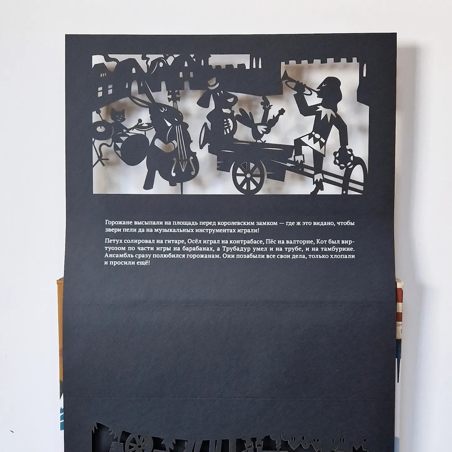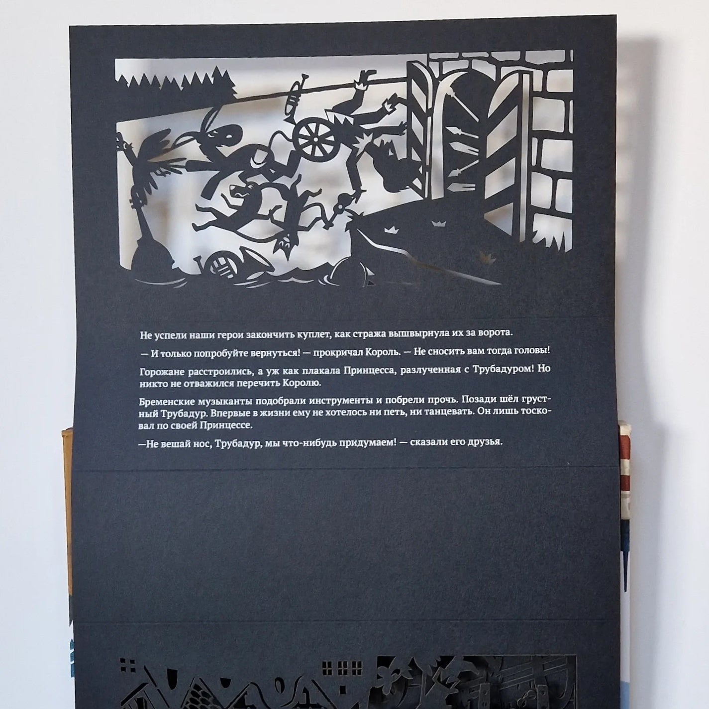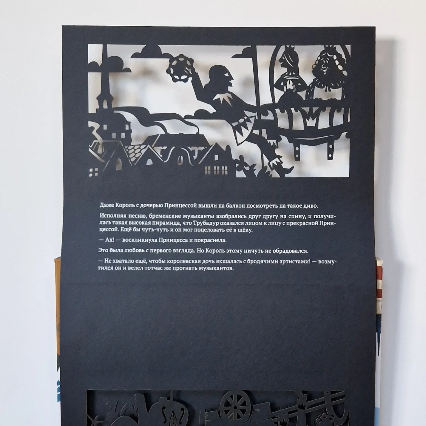 В книге 9 страниц с вырезанными лазером иллюстрациями и текстом под ними, которые подробно раскрывают сюжет сказки.