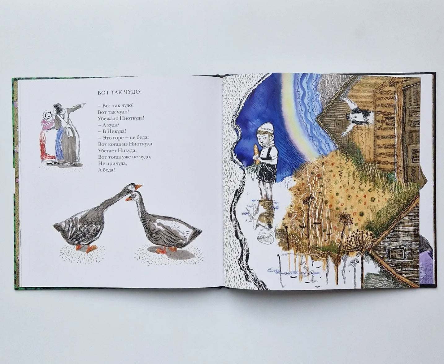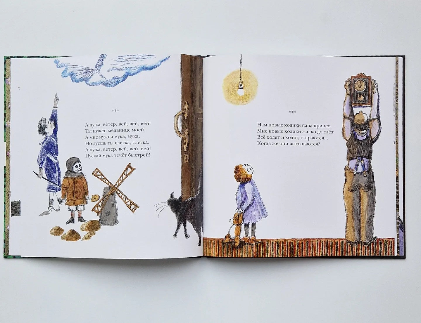 "Смешные, милые стихи-прибаутки, подсвеченные мягким, лирическим юмором. В них сквозит и самоирония, и печаль, и детско-философские размышления. Несмотря на внешнюю весёлость и оптимизм, в них чувствуется драма, которую я намеренно усилил к концу книги. Ибо это поэзия исчезнувших местечек, поэзия исчезающего, увы, поэтичного языка идиш - языка наших российских, в том числе, евреев. В этом и была главная трудность изобразительного воплощения еврейского детского фольклора. Добрый смех сквозь горькие слёзы…"