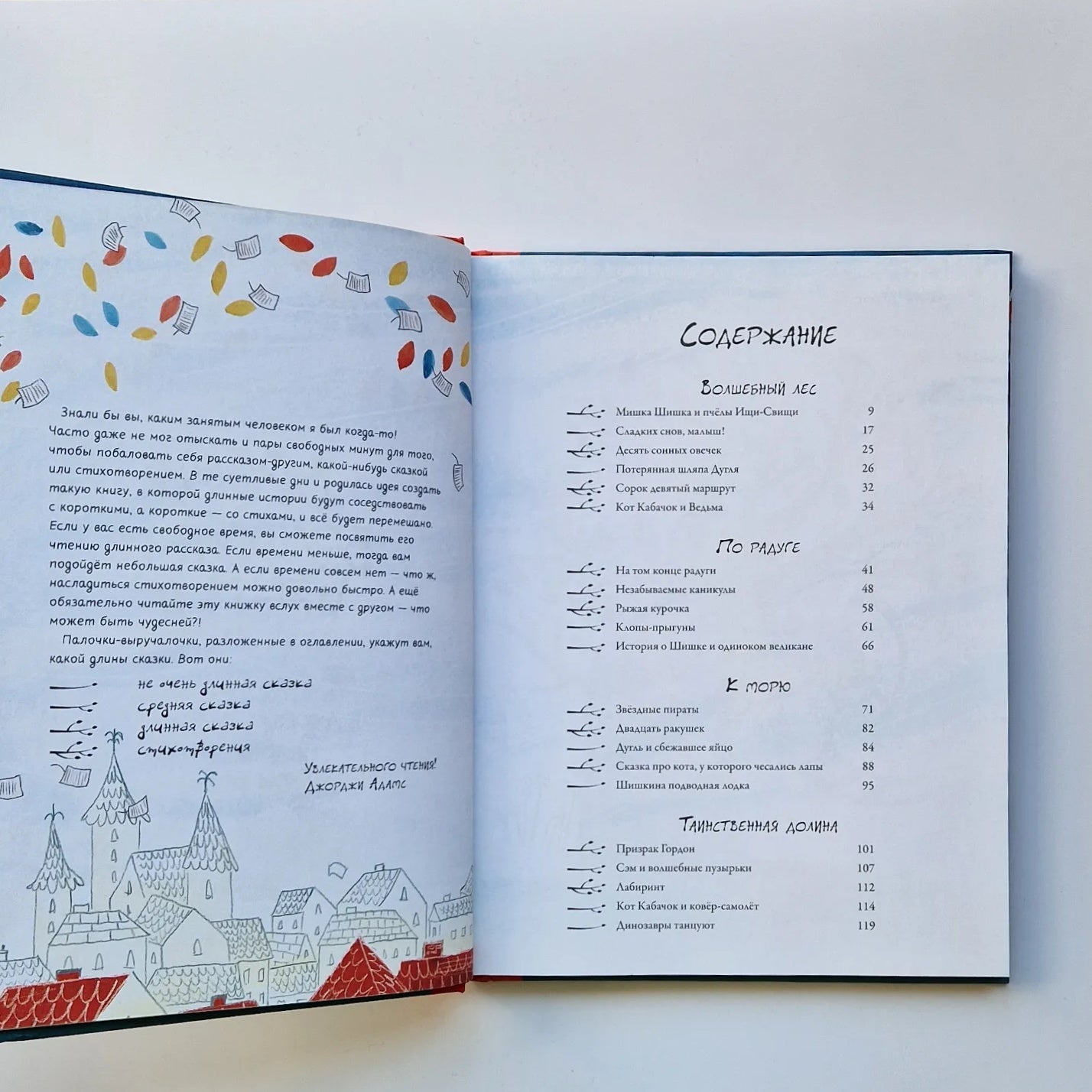 Книга «Время волшебных историй» построена по необычному принципу. В ней перемешаны короткие, средние, длинные сказки и стихи, чтобы можно было читать только тот формат, на который есть время. Здесь живут кот Кабачок, динозавр Дугль и мишка Шишка. А ещё здесь есть волшебное дерево, на котором растут сказки. Каждый день трое друзей приходят сюда выбрать какую-нибудь историю, чтобы почитать их друг другу. Там есть сказки о их и чужих приключениях. Однажды ночью все сказки исчезли. И друзьям пришлось отправиться в путь, чтобы их отыскать и вернуть на место. Удастся ли им найти все истории?
