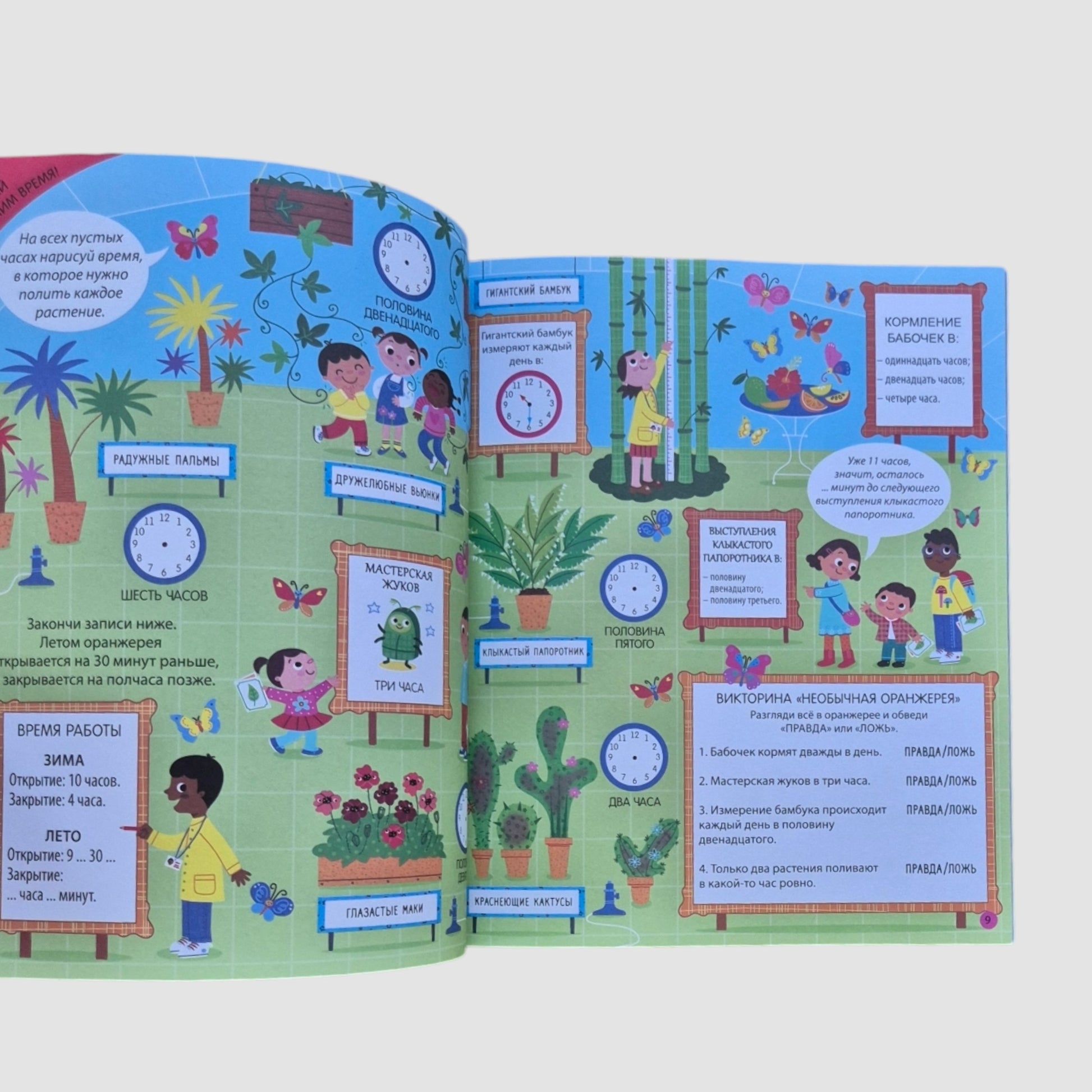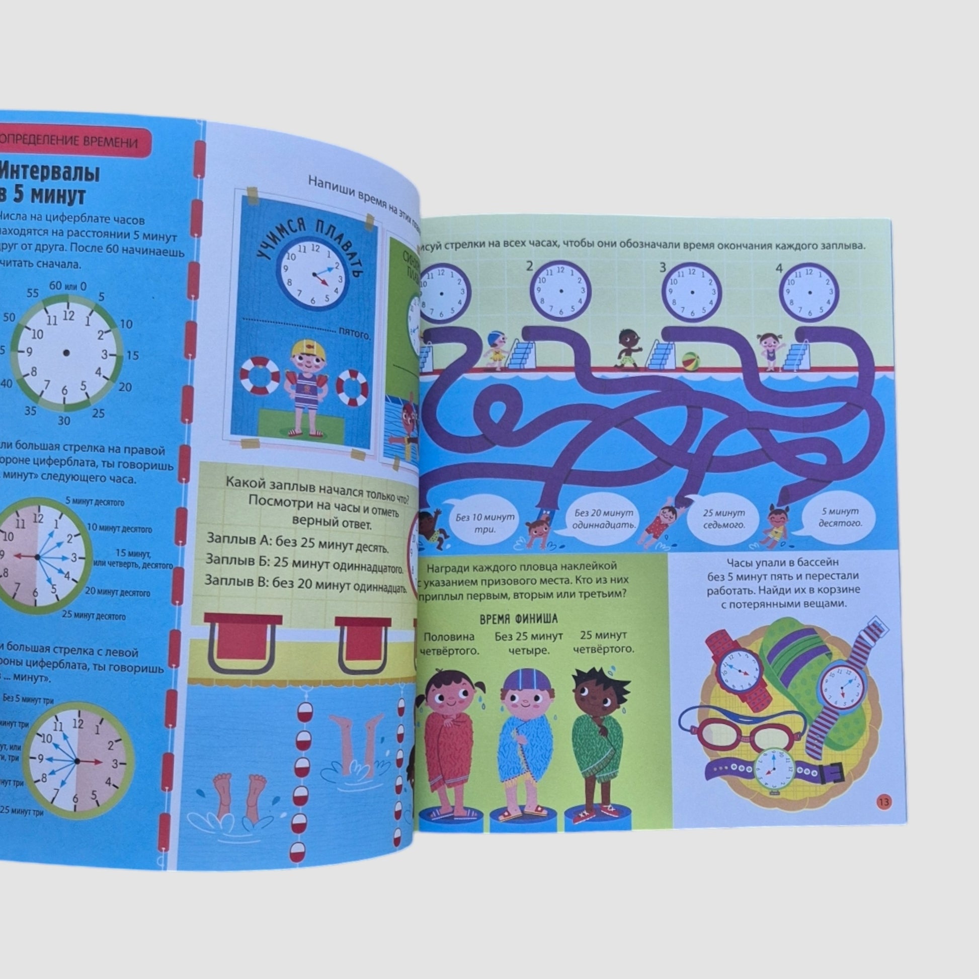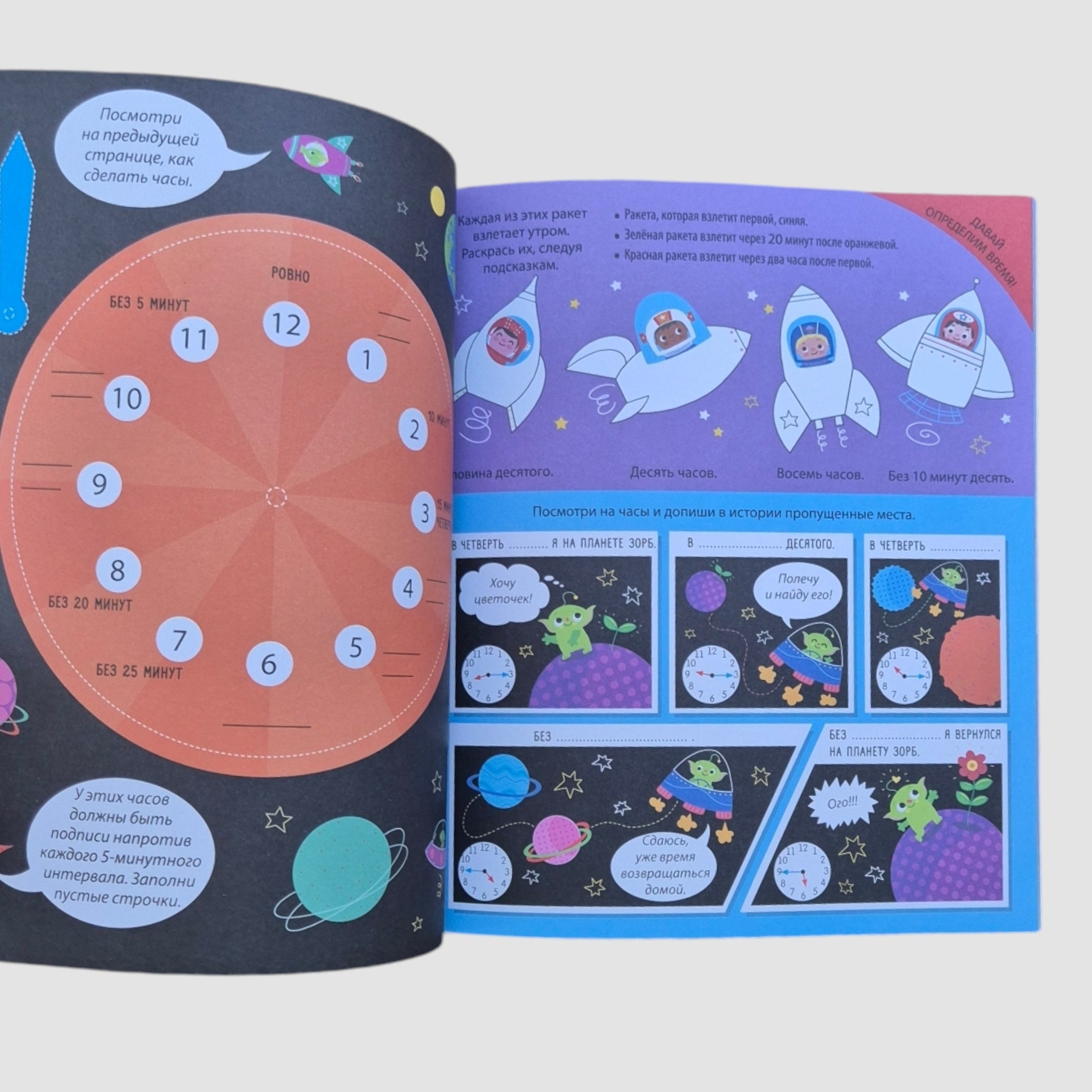 Каждый разворот - это настоящее приключение в мире дней, часов и минут. Выполняй задания, раскрашивай, узнавай, разглядывай и клей наклейки!