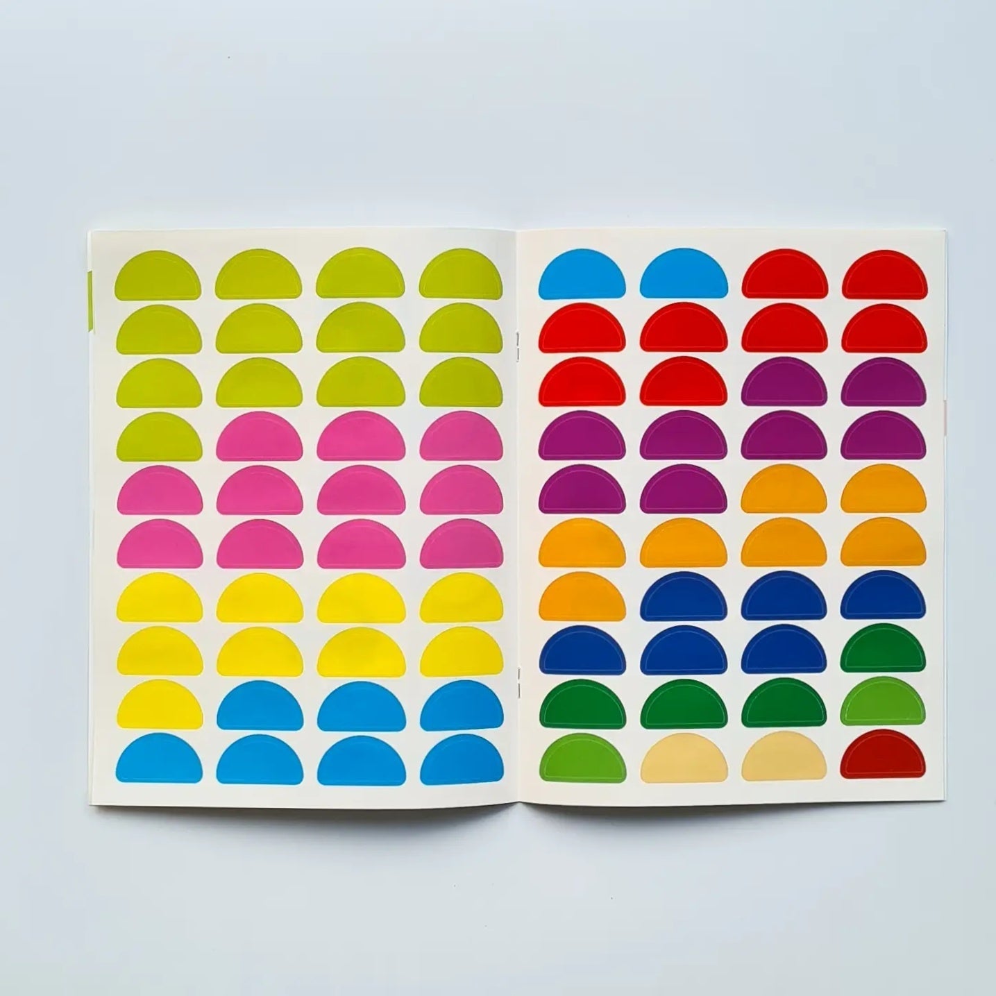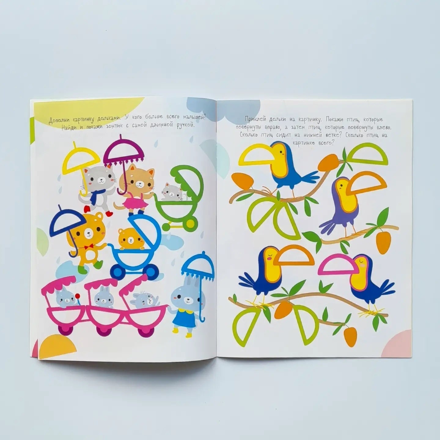 В этой книге 80 наклеек - разноцветных долек. Малыш должен дополнить с их помощью картинки. Это очень просто: покажите ему, что наклейку нужно подобрать под цвет контура. Если приклеить дольку ровно с первой попытки не получилось - не беда, ведь наши наклейки многоразовые.