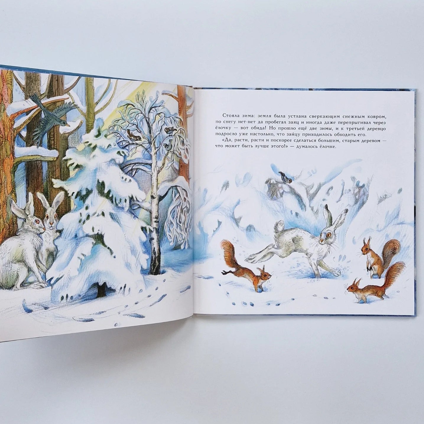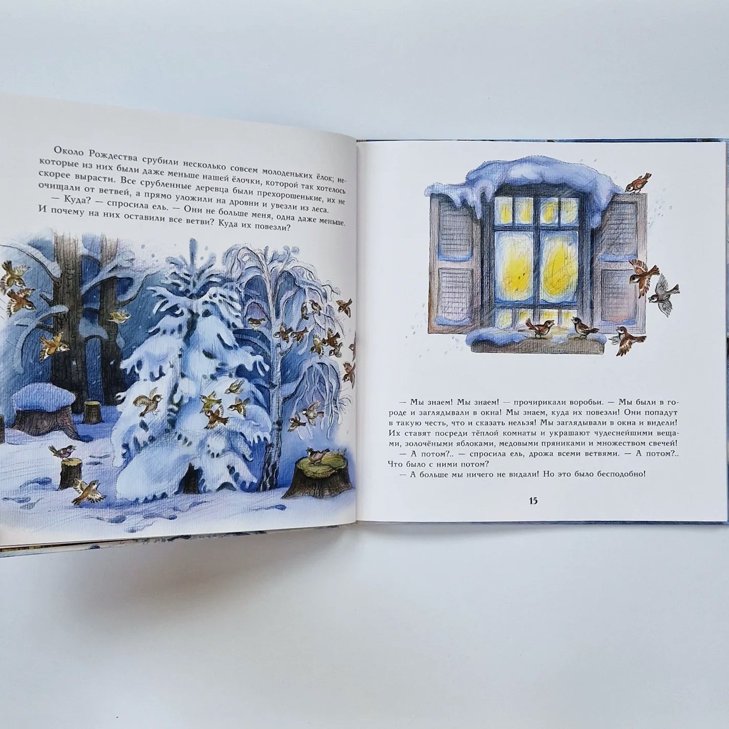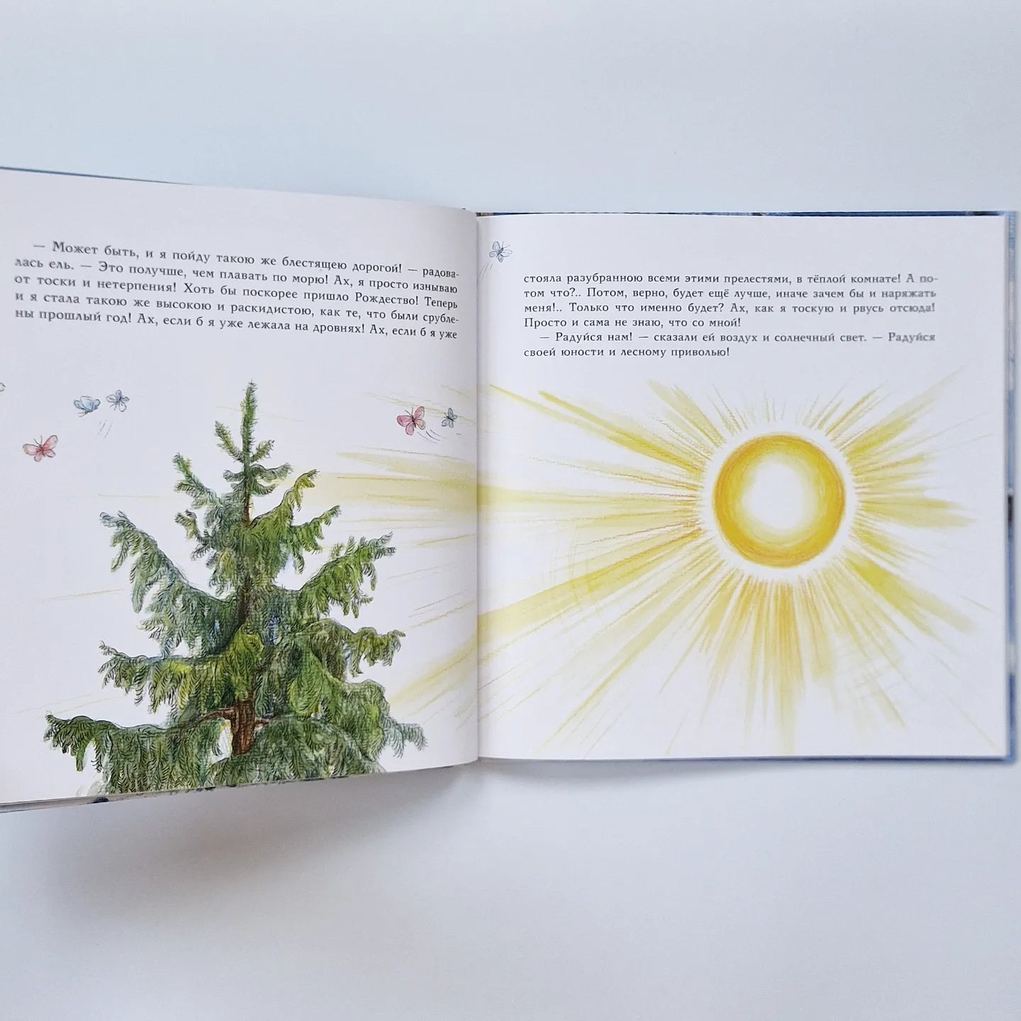 В лесу растёт маленькая пушистая ёлочка. Солнце согревает её ласковыми лучами, птицы поют чудесные песни, а деревенские ребятишки любуются ей и с удовольствием отдыхают рядом. Но ёлочка ничего этого не замечает: она хочет поскорее вырасти, чтобы стать мачтой на корабле и отправиться в плавание... а может быть, даже стать чудесным украшением дома на Рождество?