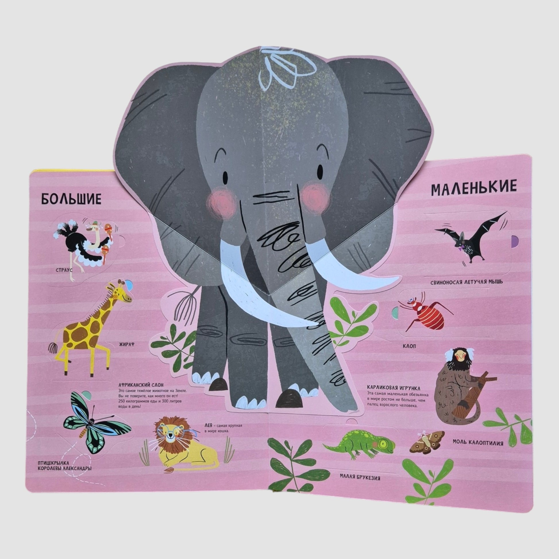 УДИВИТЕЛЬНЫЕ ФАКТЫ и животные со всего мира – ОГРОМНЫЕ и совсем крохотные – притаились среди интерактивных страниц за яркими окошками. 3D развороты создают ощущение дополненной реальности. Первые открытия ждут!