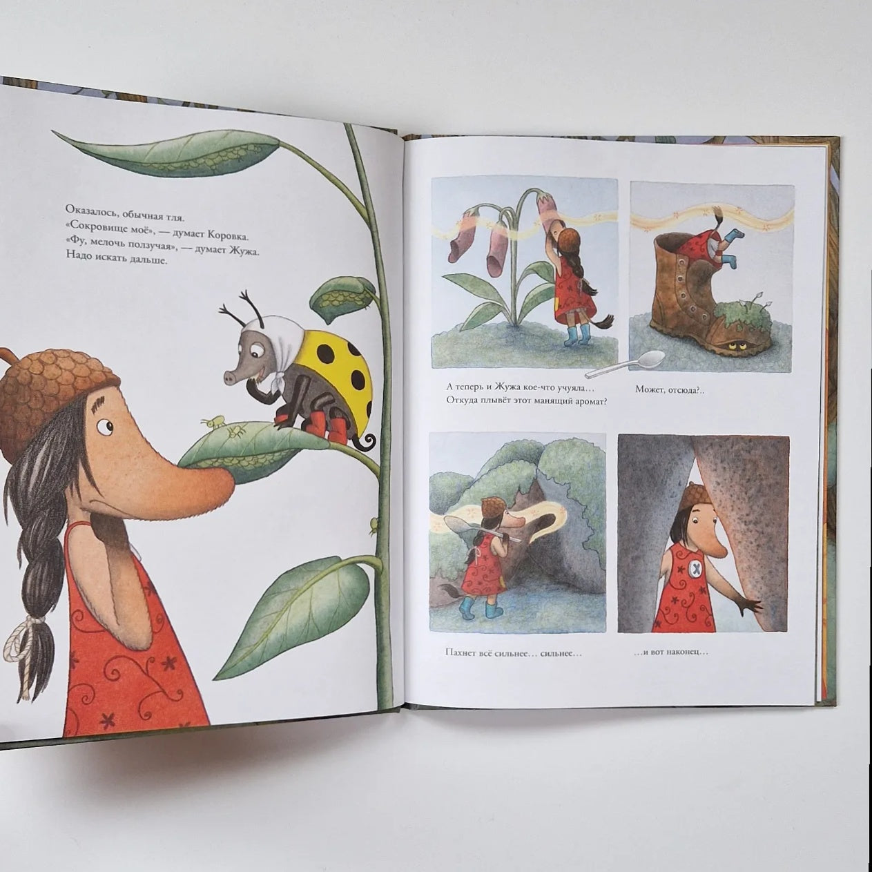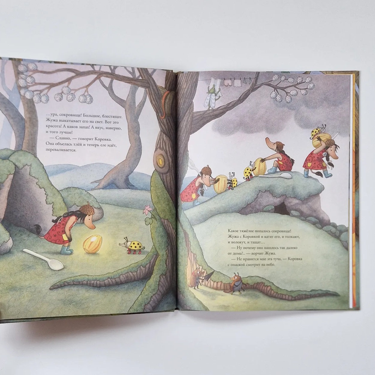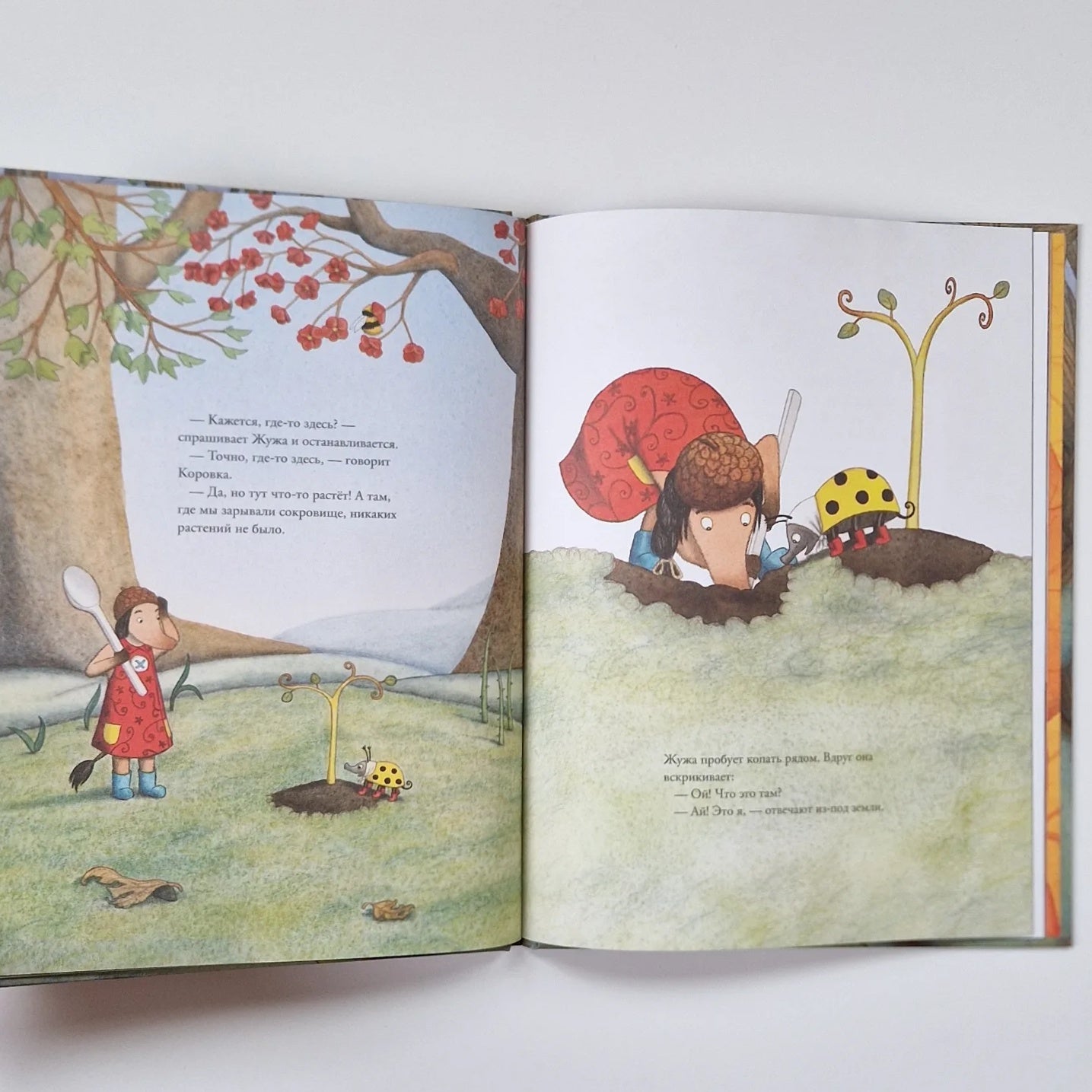 Время от времени Жужа и Коровка отправляются на поиски сокровищ. На этот раз друзьям повезло, сокровище нашлось - круглое, большое, блестящее, прямо-таки идеальное! Нашлось, да тут же и потерялось. Но Жужа от своего сокровища не откажется - если надо, хоть весь лес перероет! И она берётся за лопату. Весна сменилась летом, собралась уже целая компания искателей сокровищ: Жужа с Коровкой, червяк с мокрицей, землеройки, жаба, крот... Чем дело кончится, отыщется потерянное сокровище или нет - увидим. Зато летних приключений точно хватит на всех!