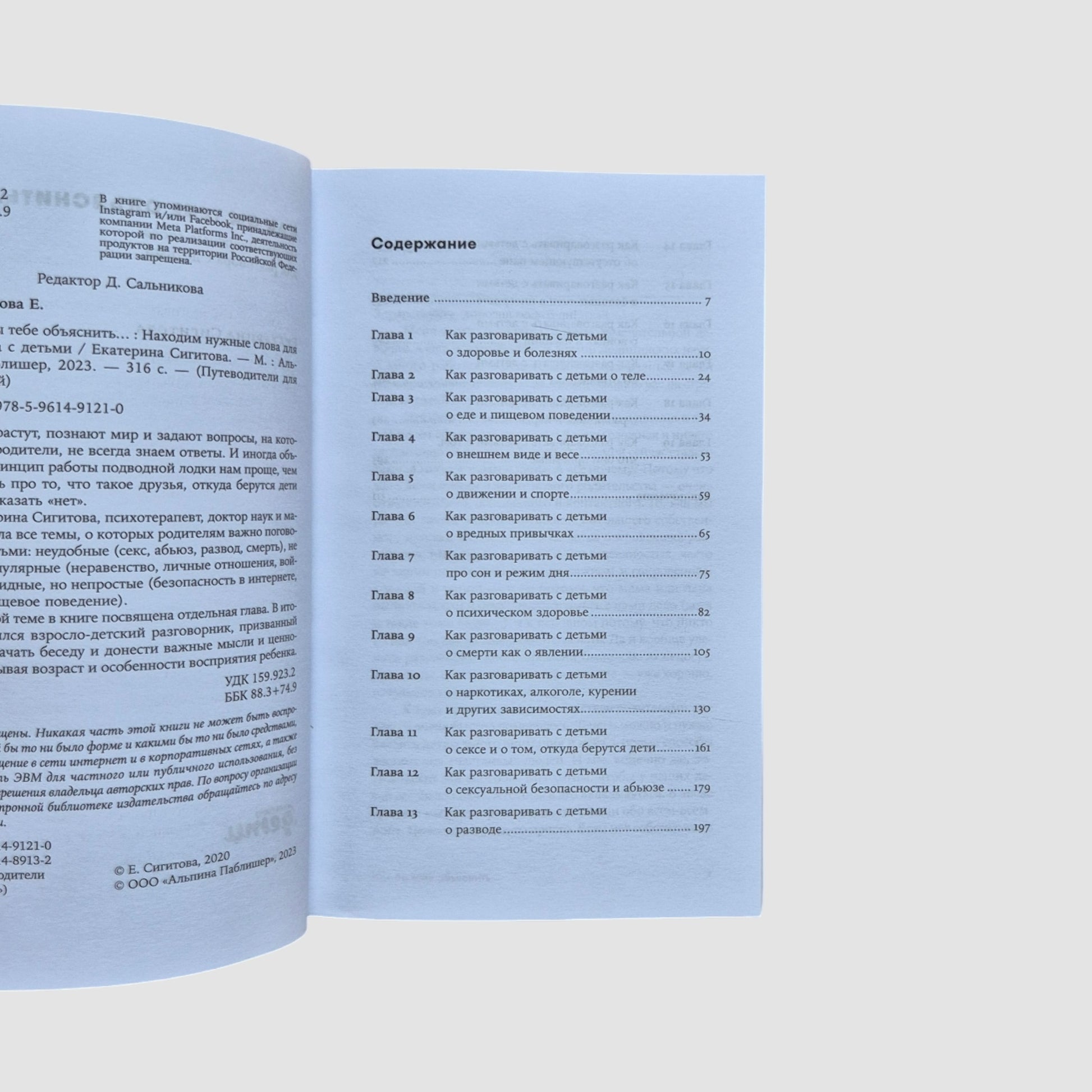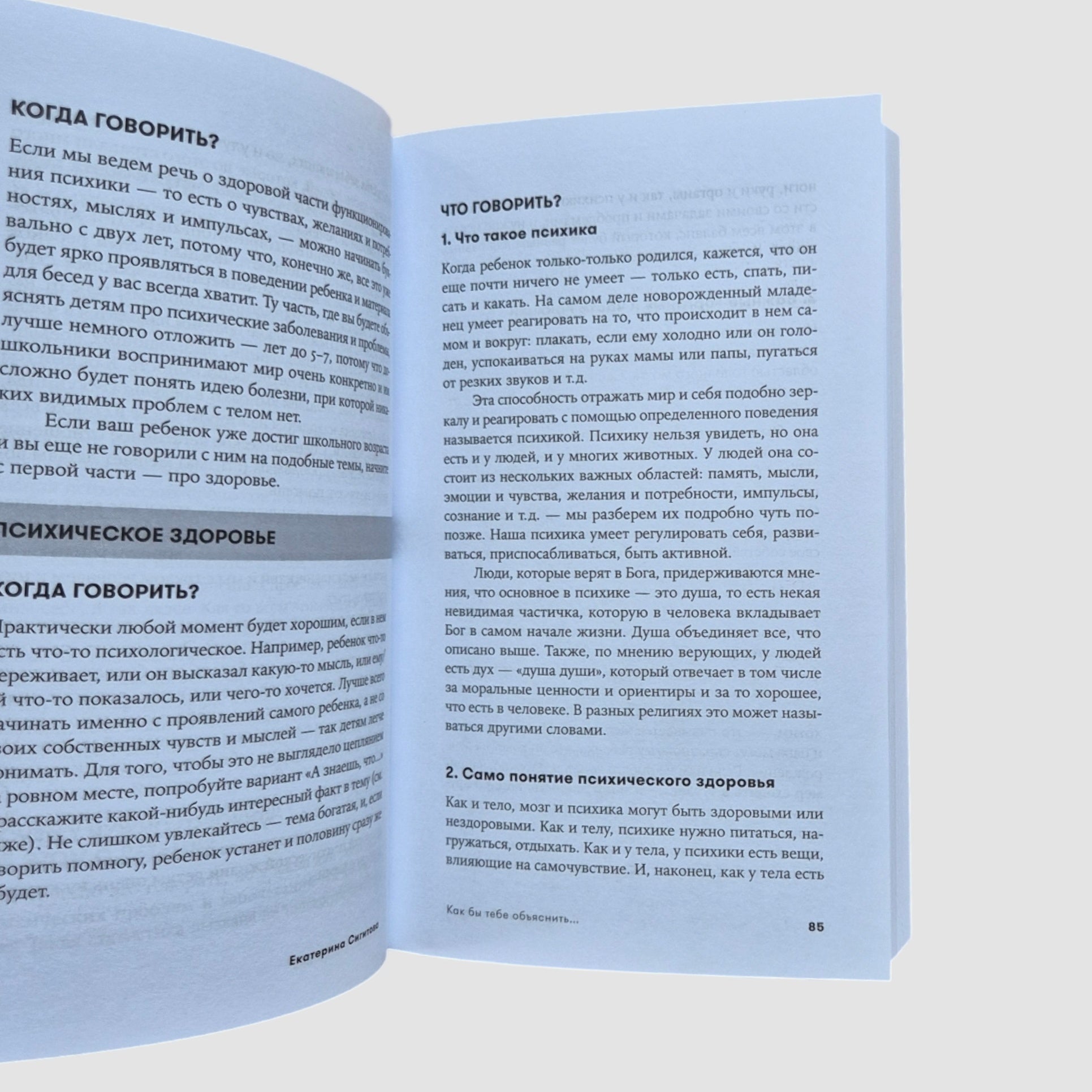 Каждой теме в книге посвящена отдельная глава. В итоге получился взросло-детский разговорник, призванный помочь начать беседу и донести важные мысли и ценности, учитывая возраст и особенности восприятия ребенка.