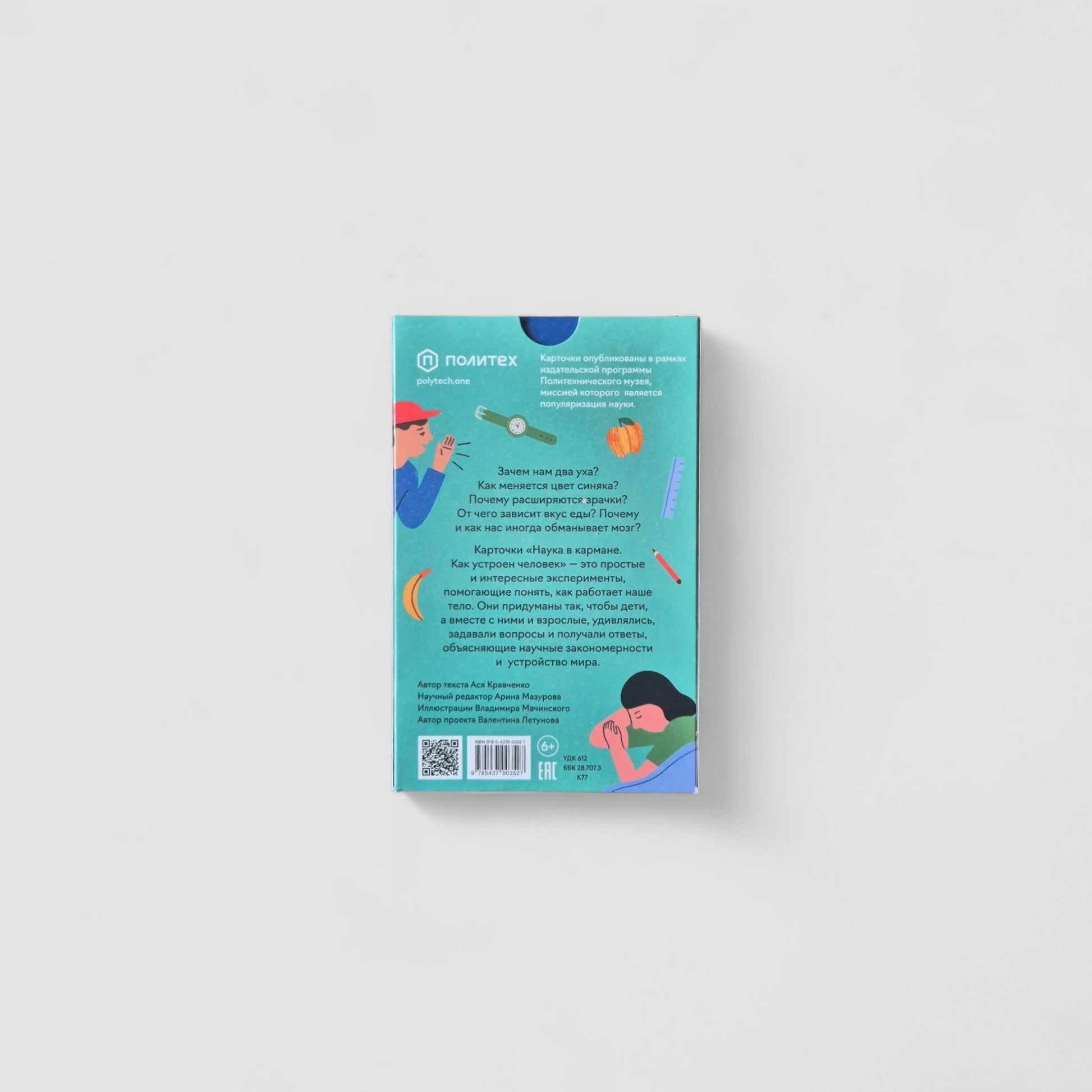 Зачем нам два уха? Как меняется цвет синяка? Почему расширяются зрачки? От чего зависит вкус еды? Почему и как нас иногда обманывает мозг? Карточки "Наука в кармане. Как устроен человек" - это простые и интересные эксперименты, помогающие понять, как работает наше тело. Они придуманы так, чтобы дети, а вместе с ними и взрослые, удивлялись, задавали вопросы и получали ответы, объясняющие научные закономерности и устройство мира.