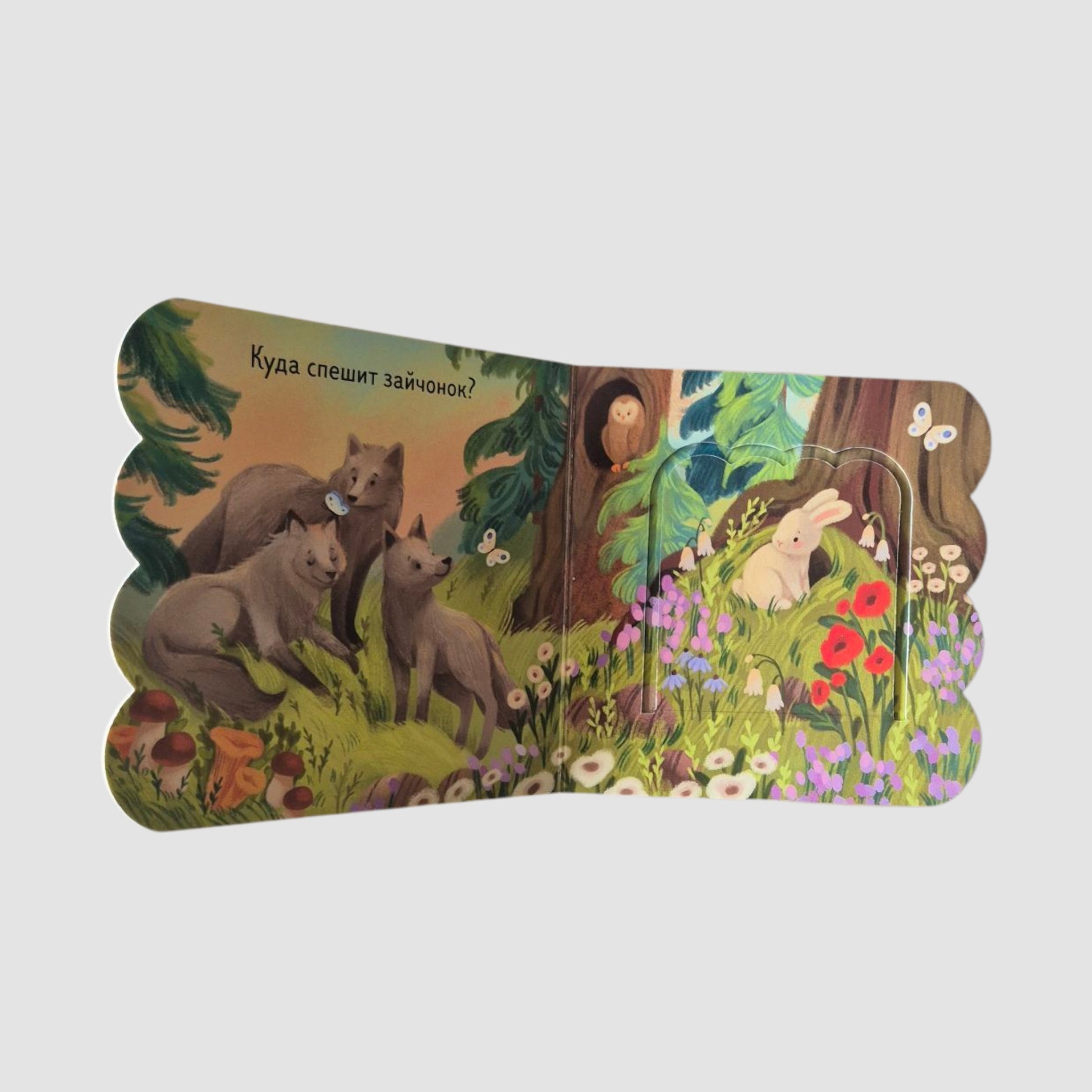 На каждом развороте маленький читатель найдет панорамную иллюстрацию, вопрос на сообразительность («Куда спешит зайчонок?») и ответ, который спрятался в окошке («В уютную норку!»).