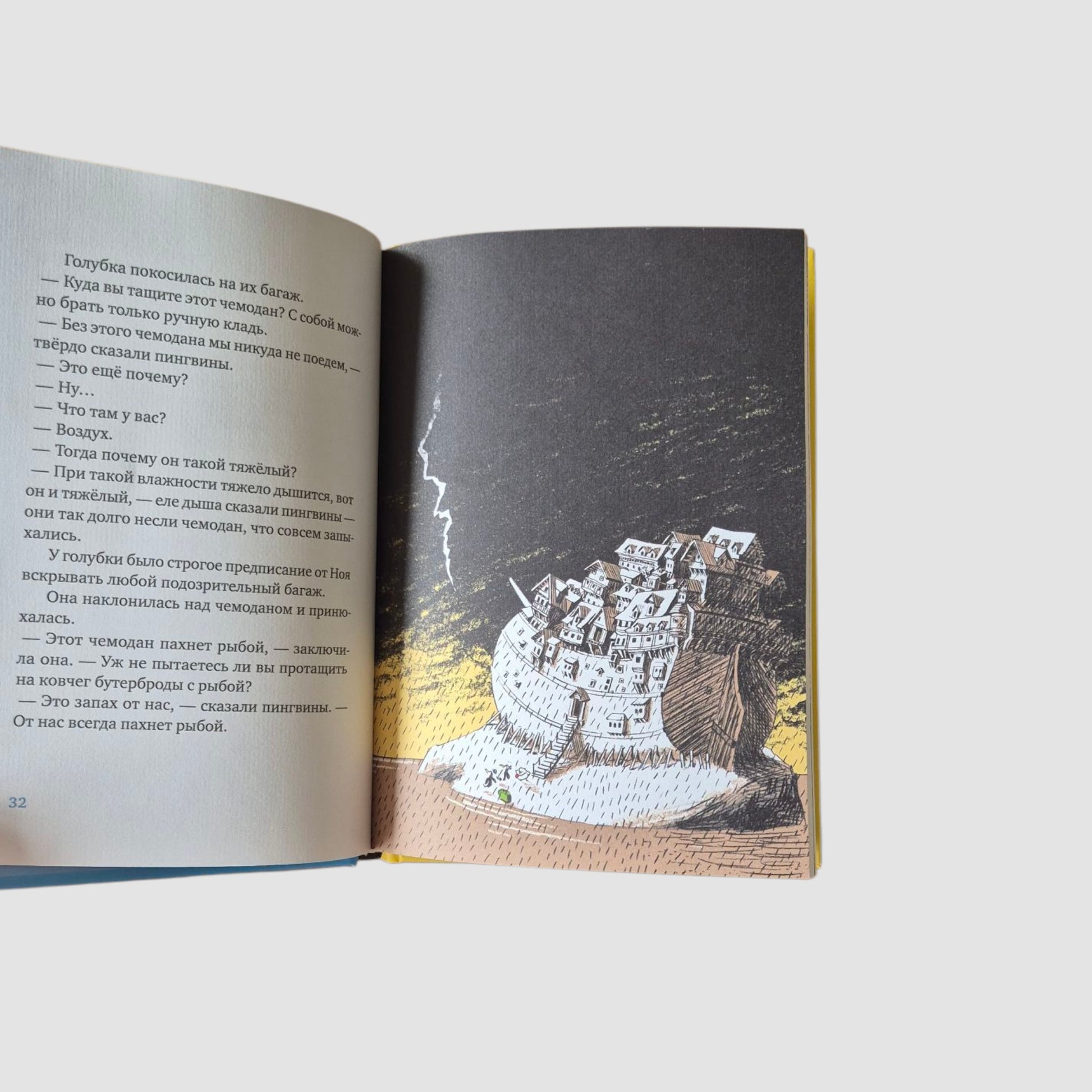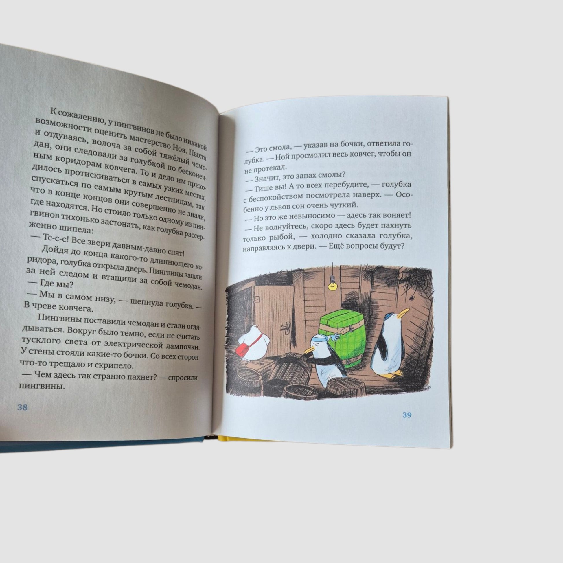 Пока они препираются по этим вопросам, начинается дождь, а за ним и Всемирный потоп! Конечно, Бог велел Ною: «Построй огромный Ковчег и возьми на него от каждой твари по паре», а Голубка принесла пингвинам пару билетов. Но их-то трое!