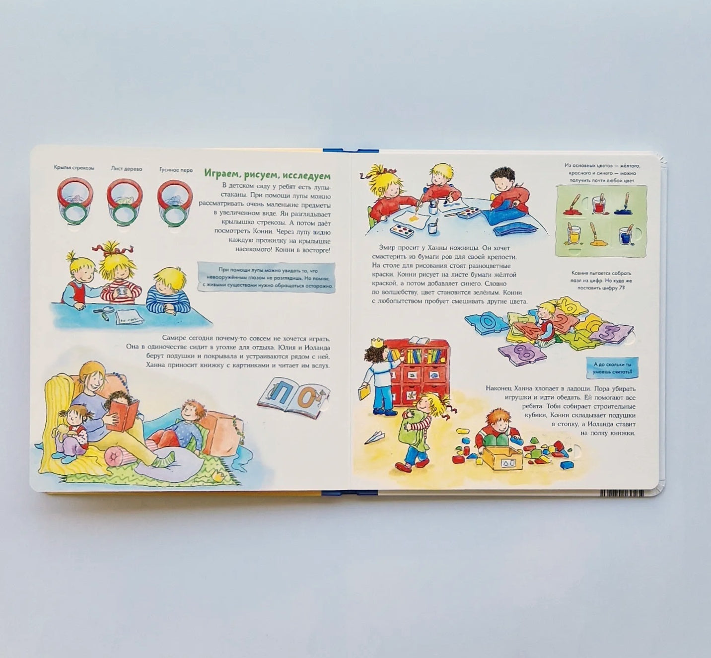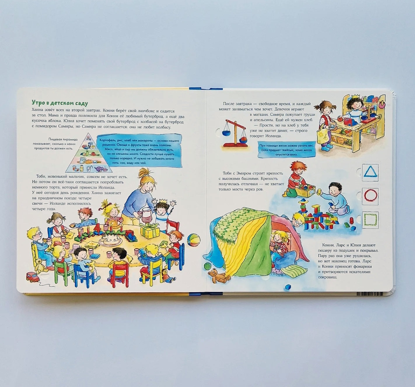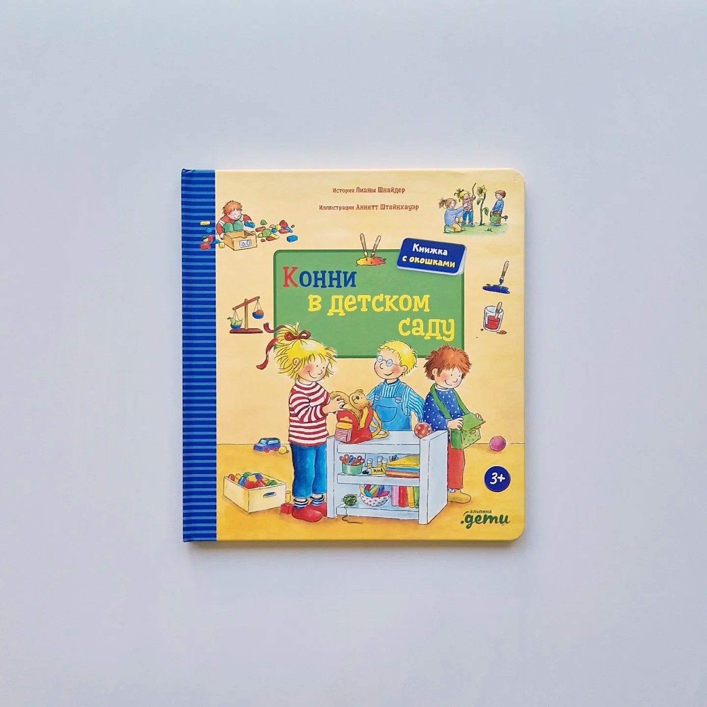 Вместе с Конни ребёнок легко привыкнет к новой обстановке, познакомится с распорядком дня в садике, полюбит совместные игры. А ещё в книжке с окошками можно открыть дверь в детский сад и даже рассмотреть разные игры и игрушки!