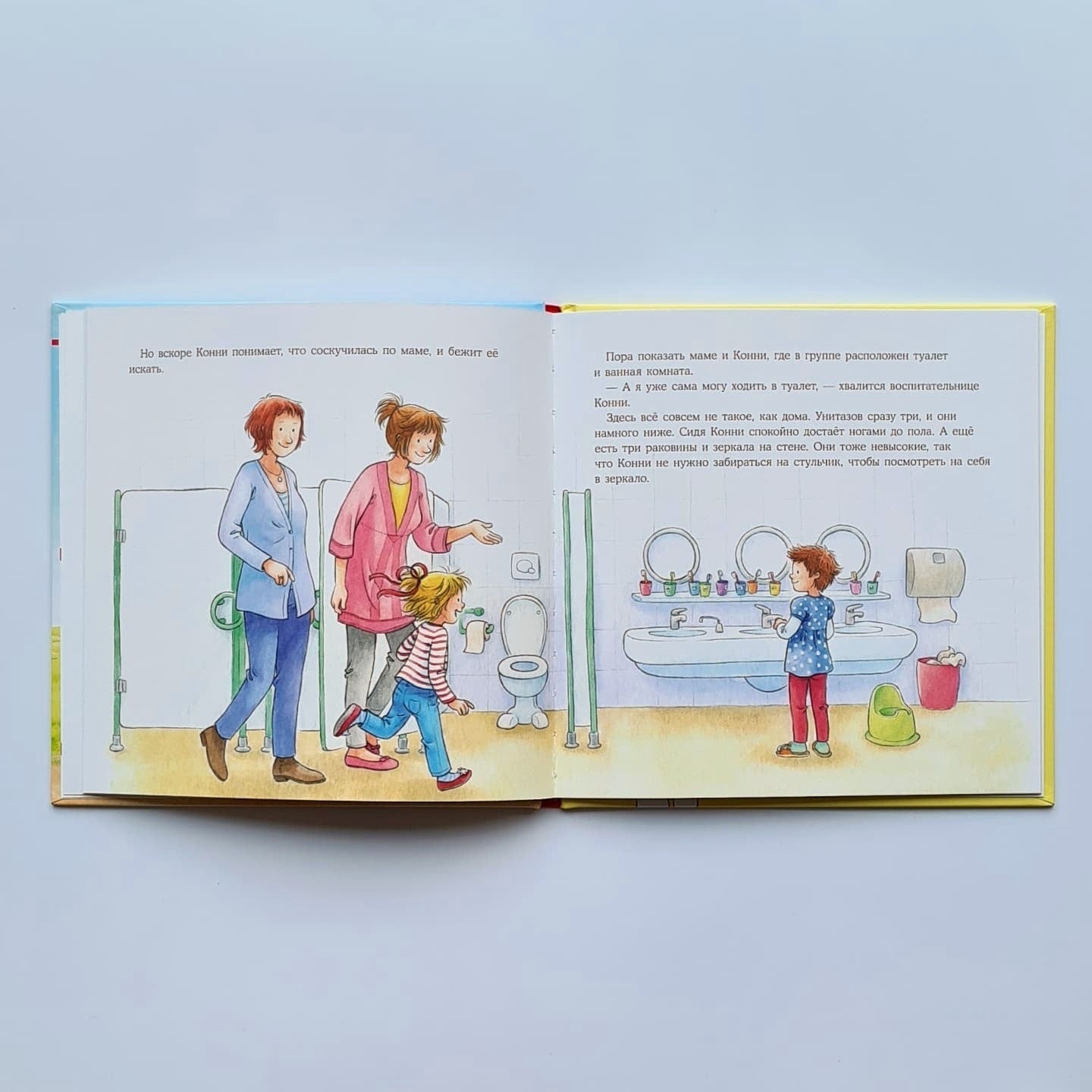 Всё когда-нибудь происходит в первый раз. Дети пугаются нового и неизвестного. Тем более когда им предстоит войти в большой мир, путь в который начинается с детского сада, где так много удивительного. Найду ли я себе новых друзей? Не страшно ли будет остаться надолго без мамы? А что делать, если захочется в туалет? С этими вопросами сталкивается и маленькая героиня Конни, которая тоже первый раз в жизни идет в детский сад.