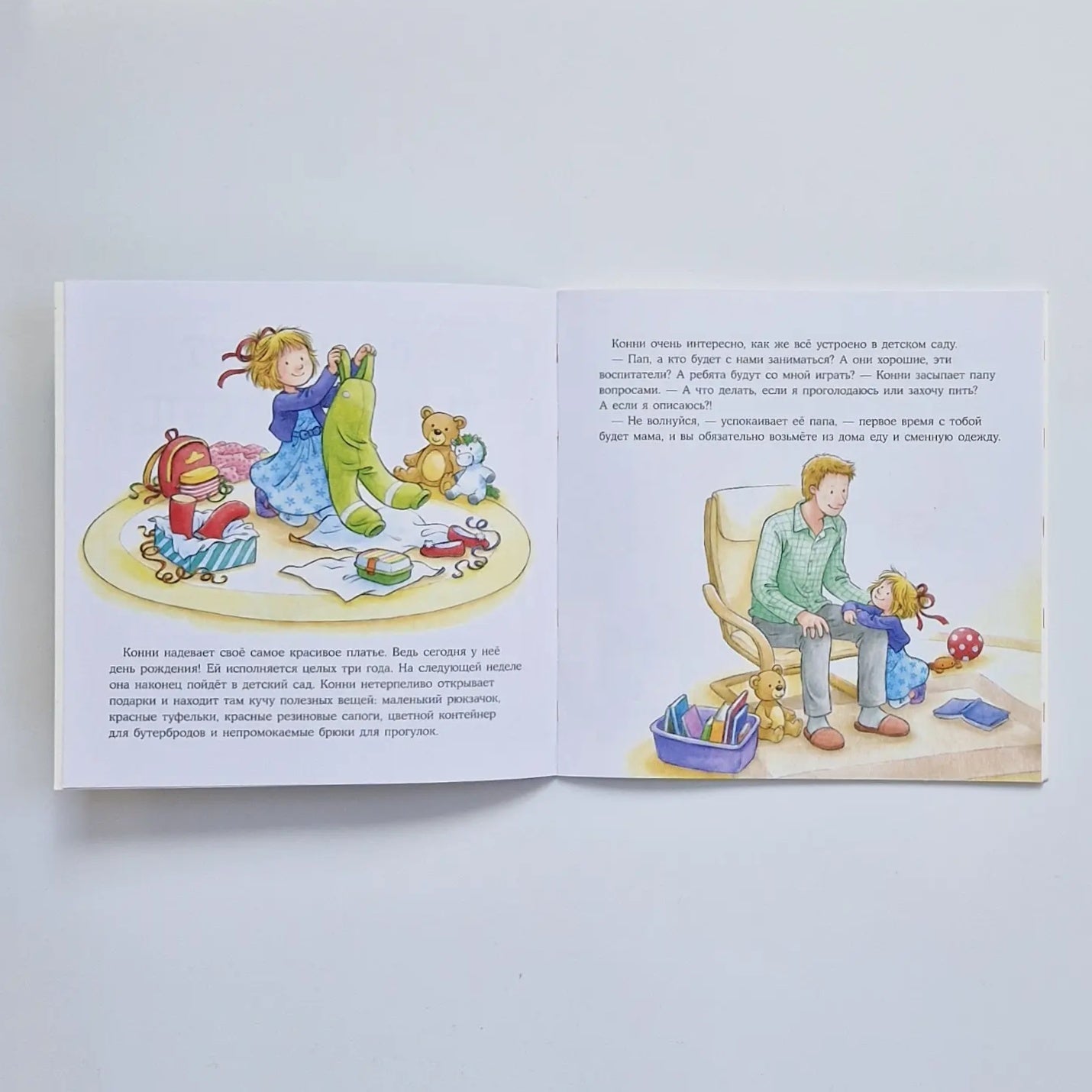 Всё когда-нибудь происходит в первый раз. Дети пугаются нового и неизвестного. Тем более когда им предстоит войти в большой мир, путь в который начинается с детского сада, где так много удивительного. Найду ли я себе новых друзей? Не страшно ли будет остаться надолго без мамы? А что делать, если захочется в туалет? С этими вопросами сталкивается и маленькая героиня Конни, которая тоже первый раз в жизни идет в детский сад.