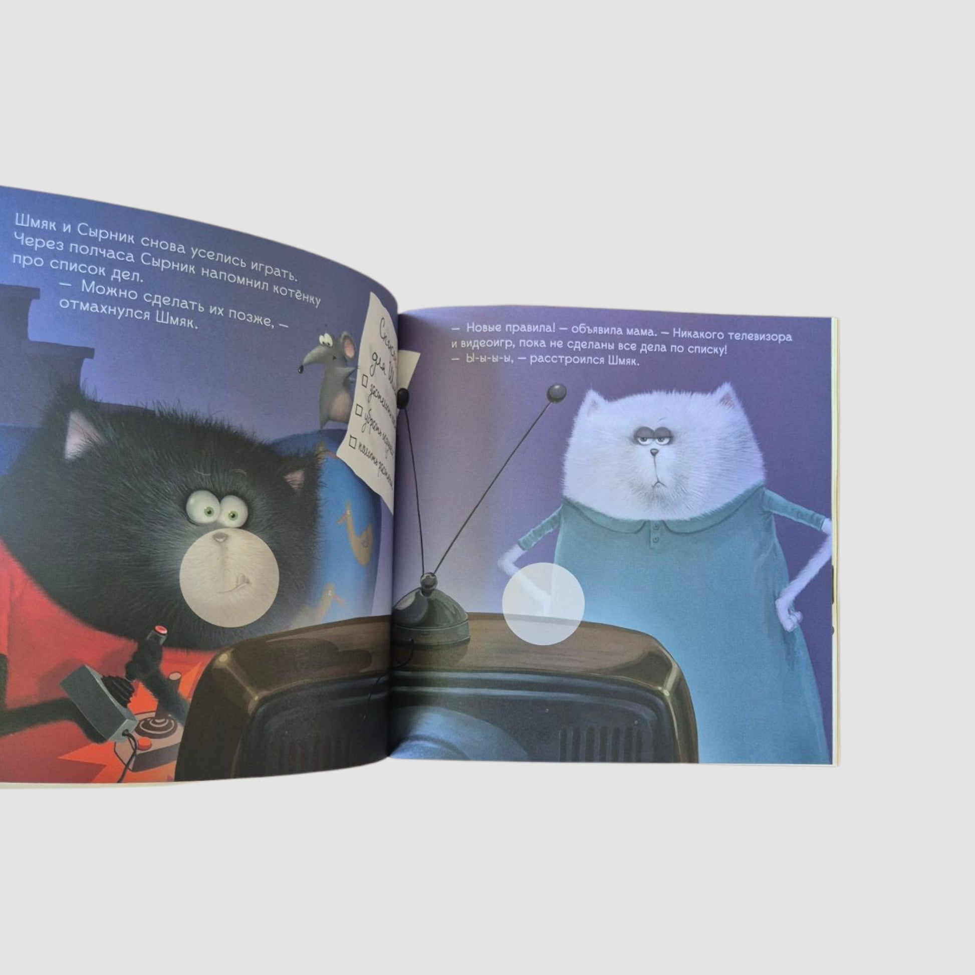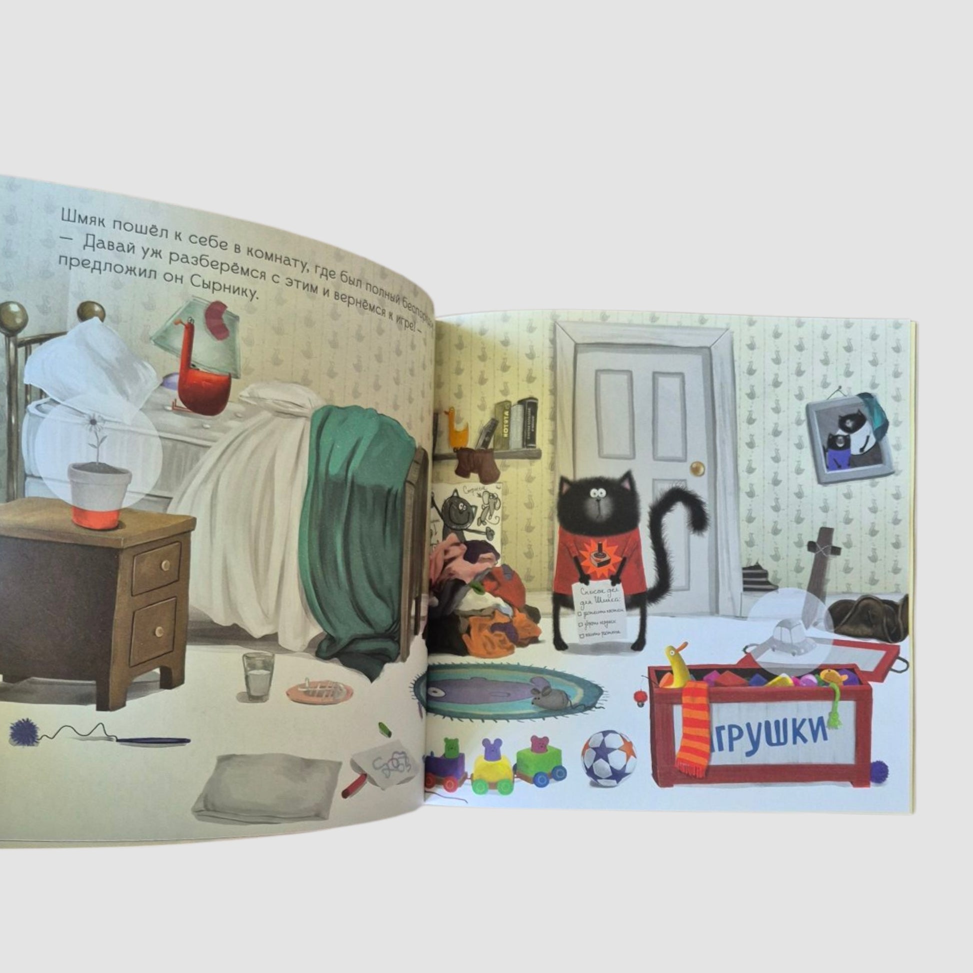 Как приучить малыша помогать по дому? Папа котенка Шмяка знает один секрет! На семейном совете было решено, что теперь у Шмяка будет свой список домашних дел. Но... убирать игрушки, застилать постель, поливать цветы — это целая вечность пройдет! «Когда тебе весело, время летит незаметно», — подсказывает папа Шмяку. Убирая игрушки в ящик, Шмяк представил, будто нашел пиратский клад на необитаемом острове, и теперь ему надо сложить все золотые монеты в сундук. Кто бы мог подумать, что уборка может быть такой веселой!