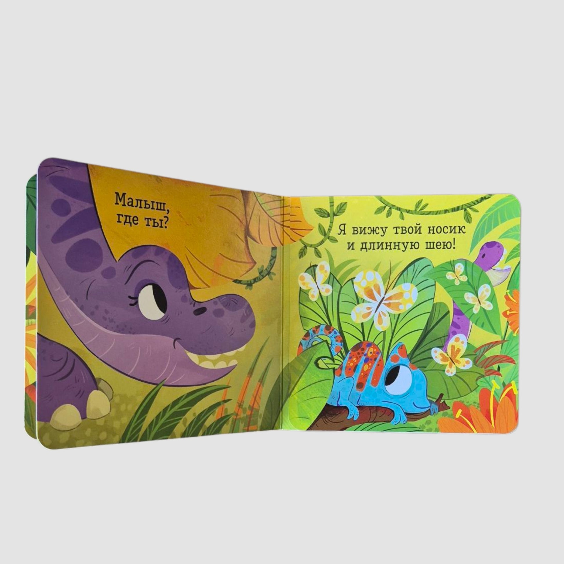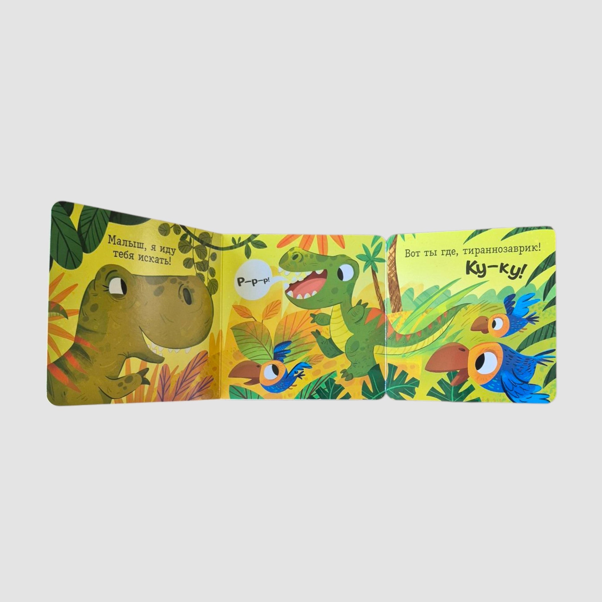 Книжка-малышка с окошками-панорамками станет прекрасным подарком для мальчиков и девочек на любой праздник, даже на день рождения. Открывайте окошки в мир динозавров, разглядывайте картинки и играйте в прятки! Ку-ку!