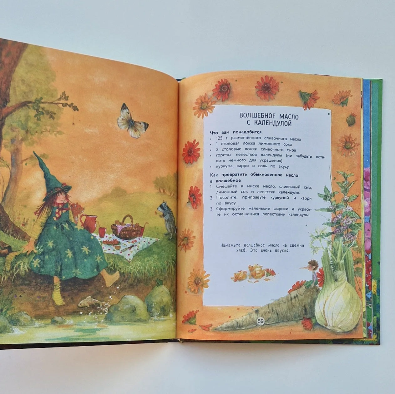 А ещё в этой книге вы найдёте колдовские рецепты. Их основные ингредиенты: горстка цветов, щепотка магии, подходящее заклинание и отличное настроение. Если вы хотите отведать засахаренные лепестки фиалок, крапивное пюре с одуванчиками, хлебные монетки, звёздочки с цветами и другие волшебные блюда, придётся немного поколдовать на кухне. А пока вы будете колдовать, ваш дом будет наполняться волшебством с нежным цветочным ароматом...