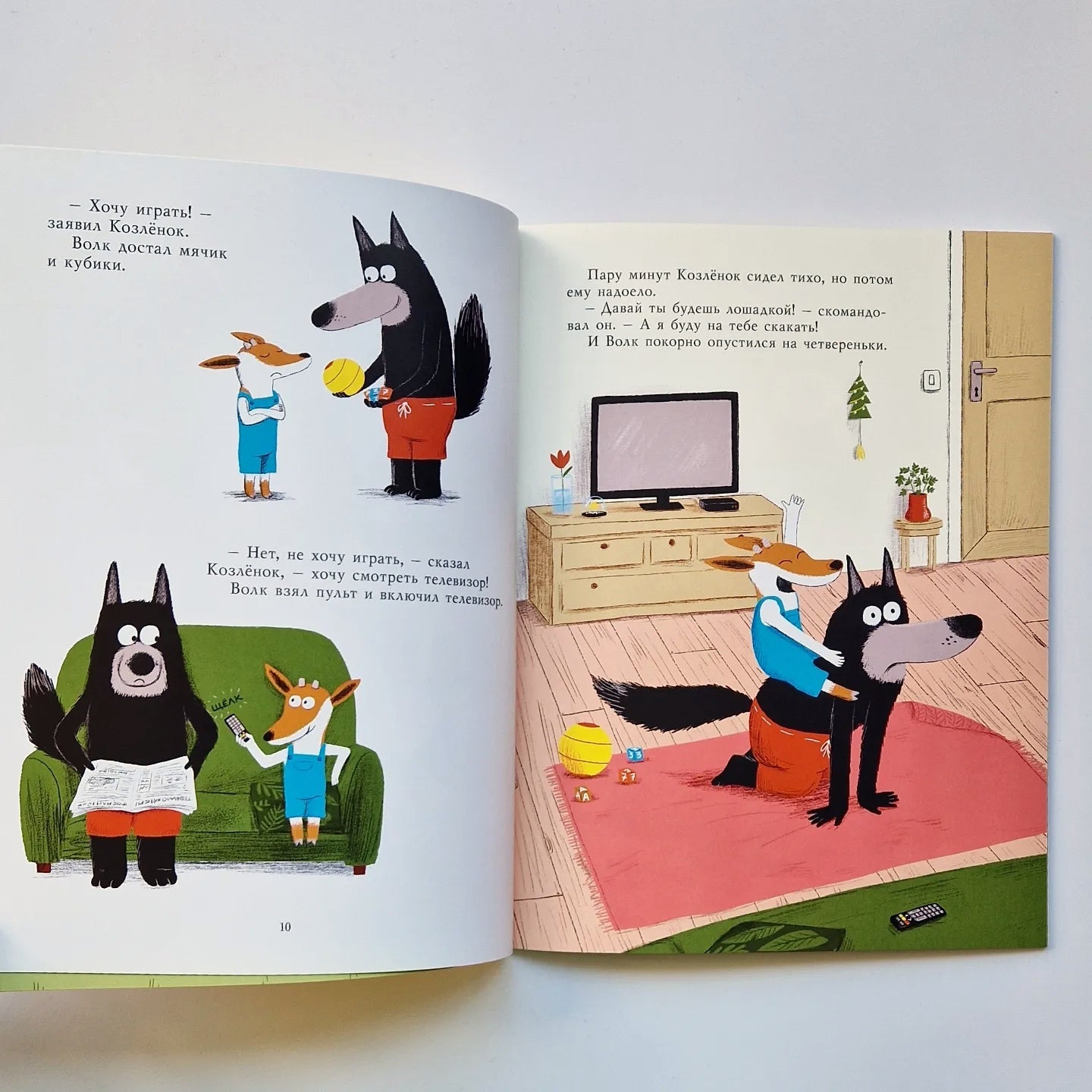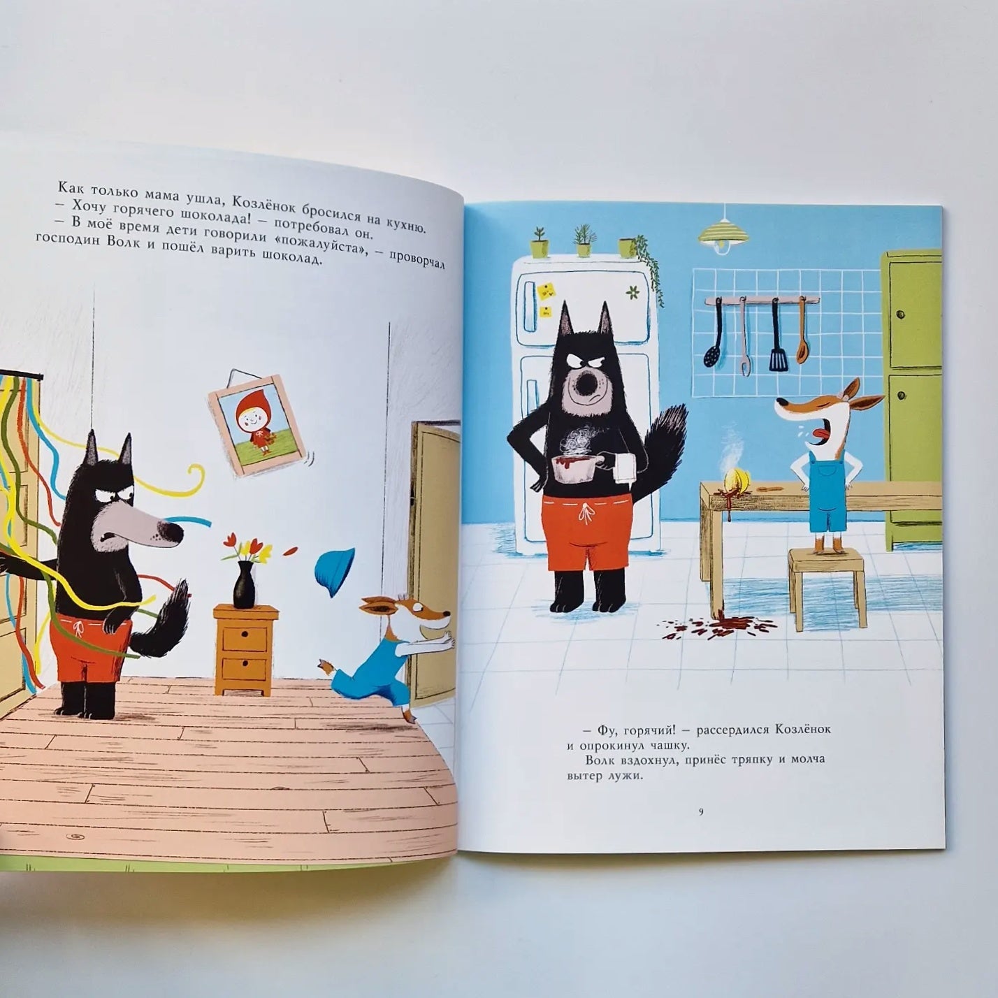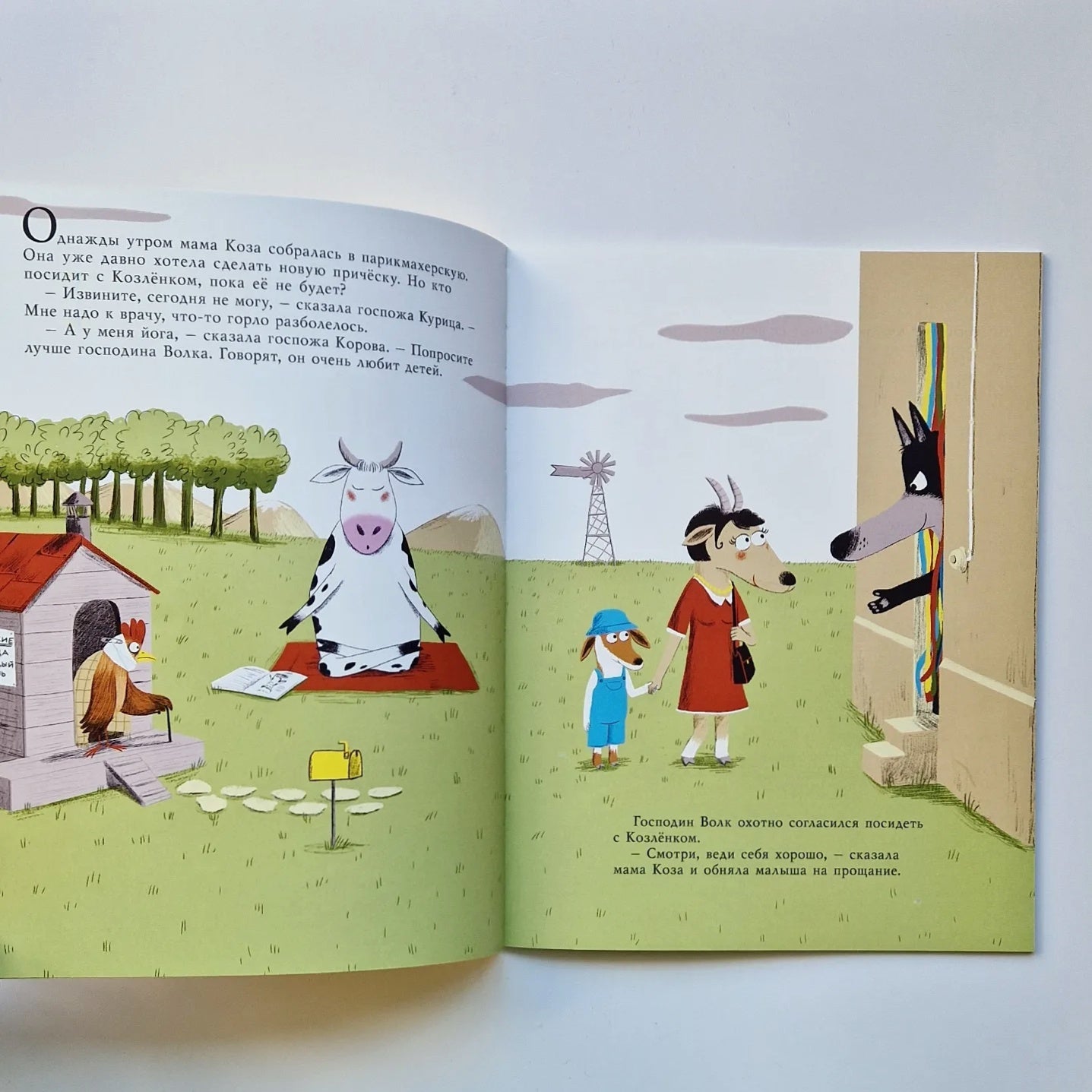 Однажды маме Козе понадобилось сходить в парикмахерскую. Своего маленького Козлёнка она оставила на попечение господина Волка, который хоть и выглядел точь-в-точь как страшные зубастые разбойники из детских сказок, но на самом деле был большим добряком.